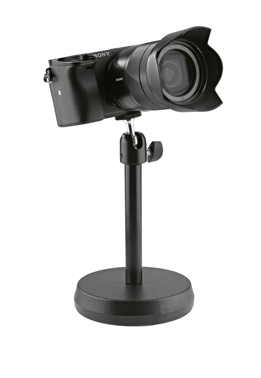 Stabiles Kamera-Tischstativ für die Aufnahme von Kompaktkameras, Action-Kameras, Web-Cams, Mini-Beamer und mobile Recorder mit einem 1/4“-Anschlussgewinde. Durch das Kugelgelenk kann das montierte Equipment um 360° gedreht und in jeder beliebigen Position fixiert werden. Die Neigung ist stufenlos bis 90° einstellbar und die Tragfähigkeit ist für Geräte mit einem Gewicht von 1 kg ausgelegt.