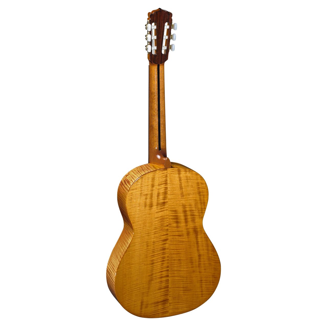Boden und Zarge aus hochglanzlackiertem Ahornholz mit hochwertiger seidenmattlackierter Fichtendecke. Unser Modell 52 AF mit dem sanften Klangbild ist idealer Begleiter von Gesang und im kammermusikalischem Ensemble – einerseits sanft und zurückhaltend, andererseits ausdrucksstark mit vollem Ton und harmonischem Obertonspektrum. Aus vollmassiven Tonhölzern gefertigt, ist diese Gitarre mit Hitzebeständig gelagerter hochwertiger „Rubner-Gold-Mechanik“ und gebuchsten Bohrungen ausgestattet. Qualitätsmerkmale sind zudem der durchgängig mit Hartholz versperrte Cedro-Hals, Ebenholz-Griffbrett und Stegsattel aus hartem Knochenmaterial. Die asymmetrische HANIKA-Fächerbeleistung in Fichte sorgt hier für besten Klang und Stabilität.