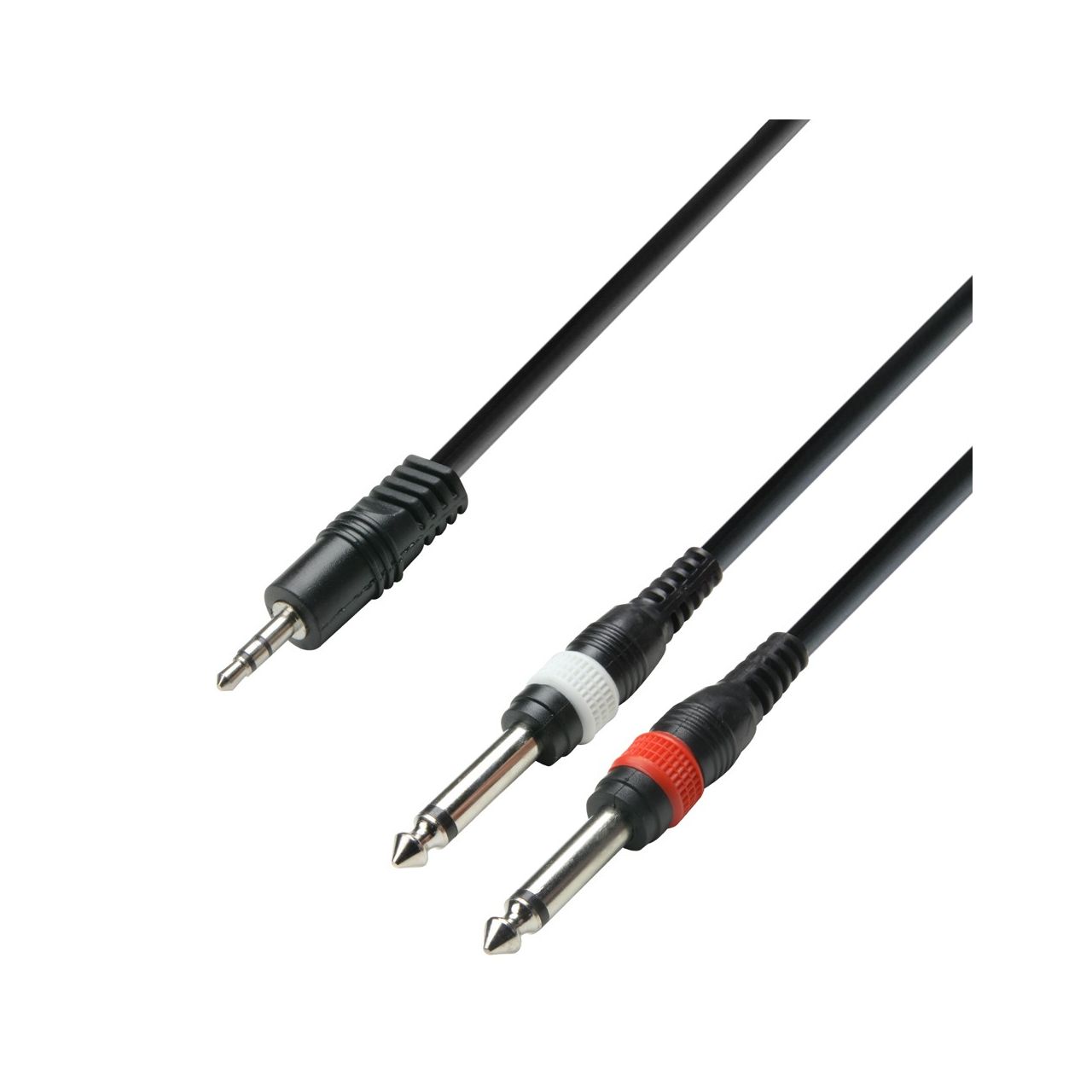 Pendant zum Adapterkabel K3YWCC, diesmal von 3,5 Millimeter Miniklinke auf zweimal Klinkenstecker 6,3 Millimeter. Zum Anschluss von externen Zuspielern, zum Beispiel MP3 Playern oder PC-Soundkarten.