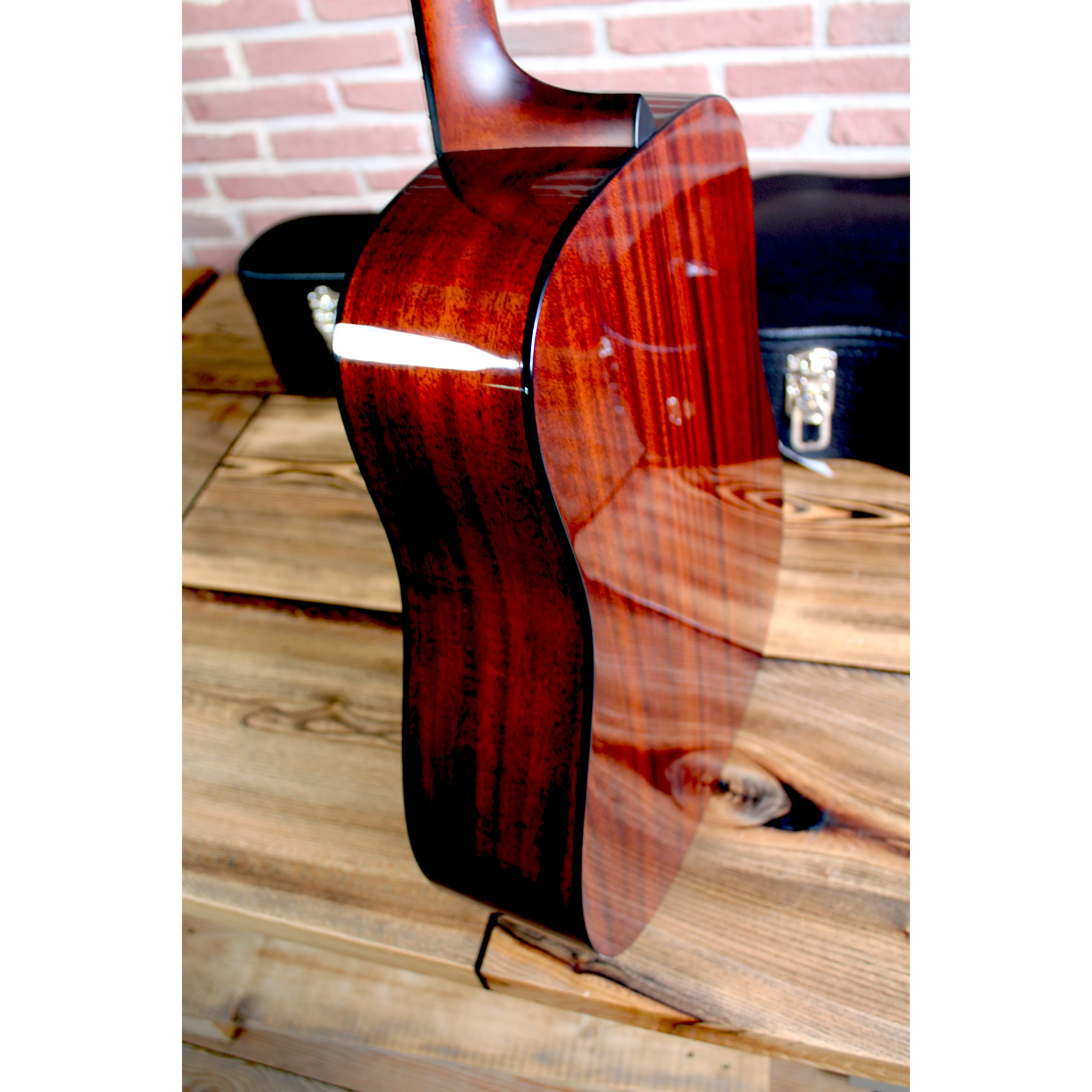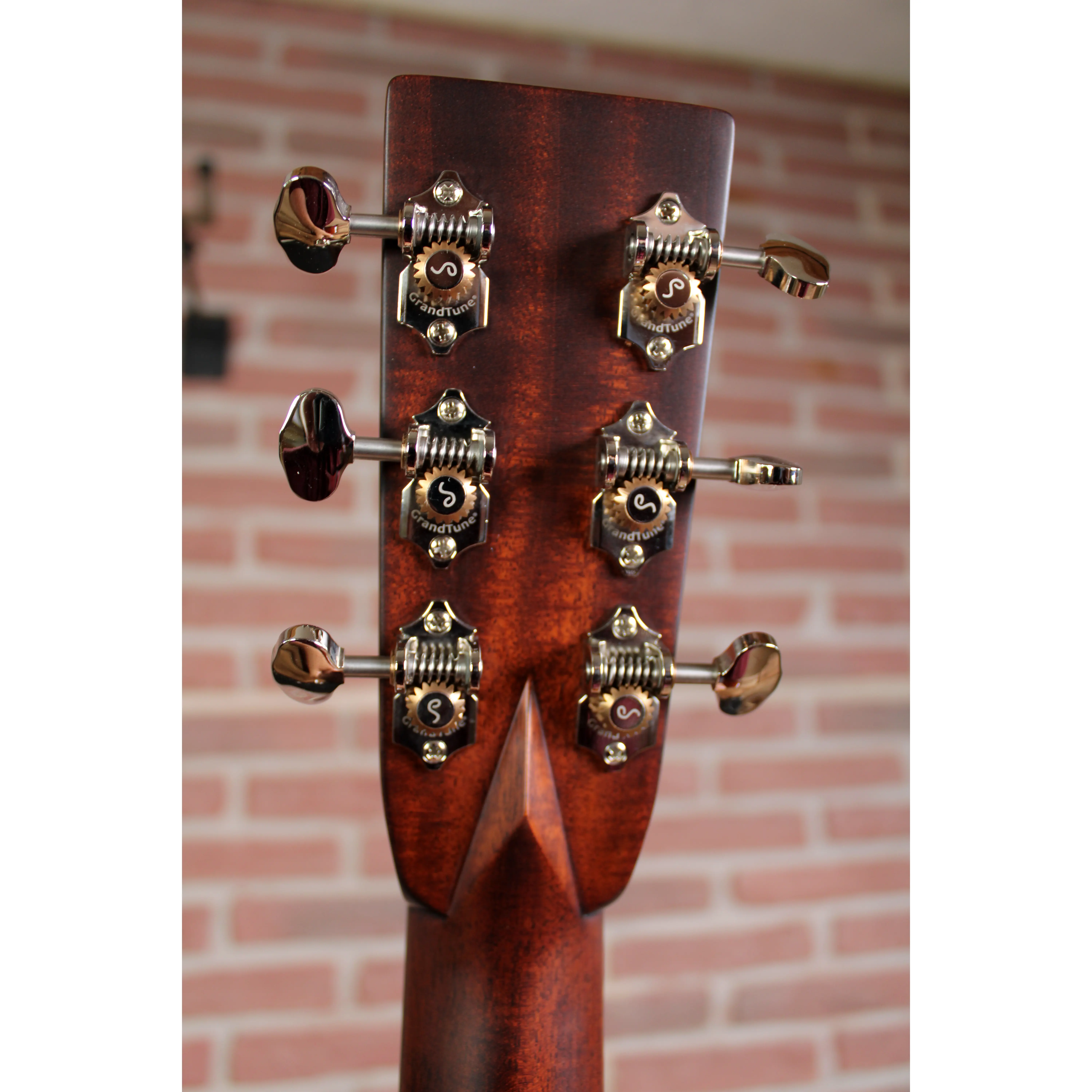 Der handverlesene Mahagonihals mit Ebenholzgriffbrett liegt geschmeidig in der Hand und bietet dank 14-Bund-Konstruktion und komfortabler Sattelbreite eine exzellente Spielbarkeit. Die traditionelle X-Bracing-Verstrebung aus Adirondack-Fichte unterstützt die offene Resonanz und sorgt für Stabilität bei gleichzeitig sensibler Ansprache. Schaller GrandTune Mechaniken garantieren eine exakte und stabile Stimmung. Optisch überzeugt die D Country Boy/TS durch klassische Eleganz mit Hochglanz-Finish, schlichter Rosette und dezentem Binding.