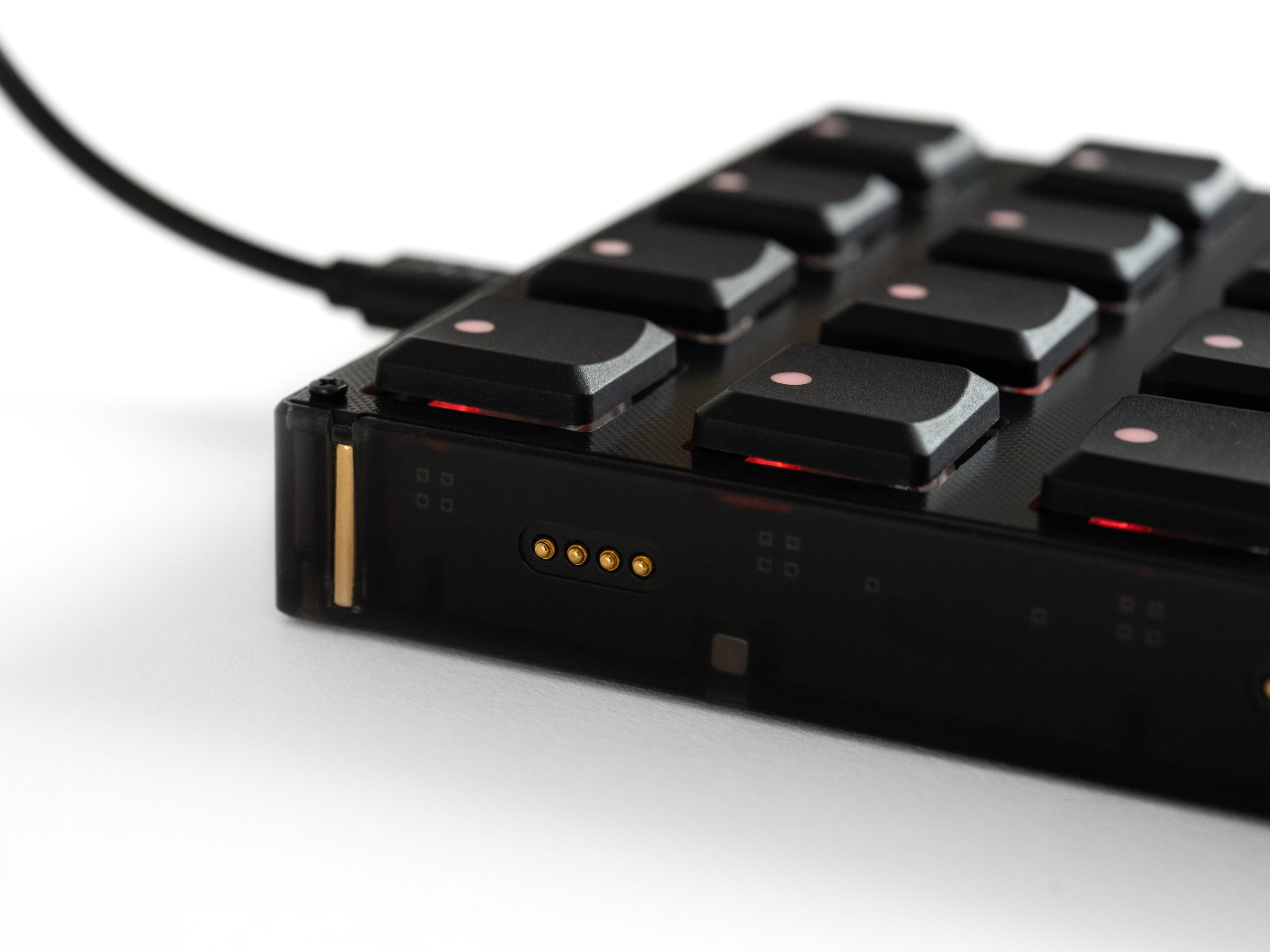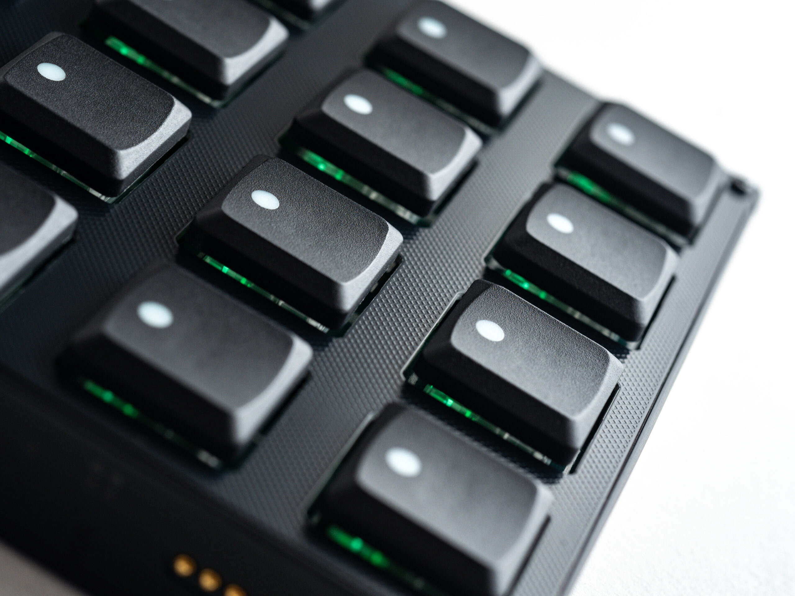 Jeder Button ist mit einer RGB-LED hinterleuchtet. Die Standard-Tastenkappen besitzen Aussparungen, wodurch die LED-Anzeigen auch während der Nutzung klar sichtbar bleiben. Die Tastenkappen sind austauschbar, was eine einfache Anpassung von Layout, Haptik oder Beschriftung an den eigenen Workflow erlaubt.