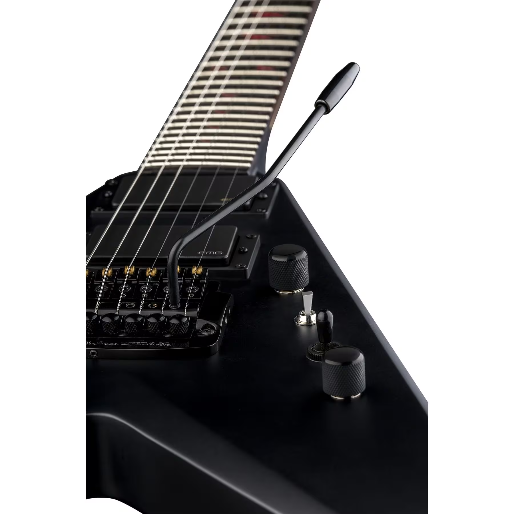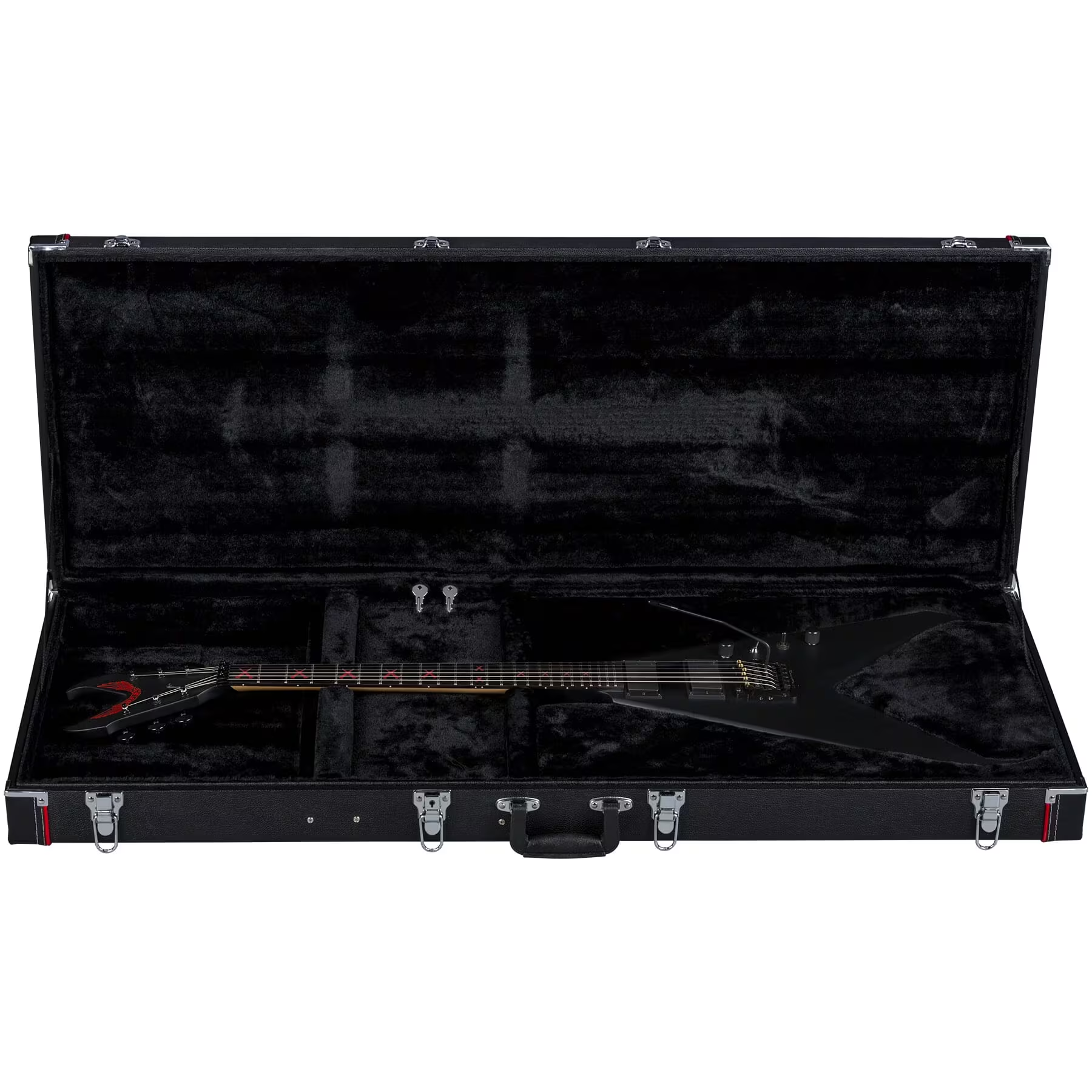 Die Kerry King V überzeugt mit ihrer einzigartigen Ausstattung: Ein 24,75″ (629 mm) leichter Scale‑Hals in „Kerry King Spec. C“‑Form bietet ein extrem schnelles Spielgefühl, unterstützt von 24 Jumbo‑Bünden auf Ebenholz‑Griffbrett mit charakteristischen „KK Nail“ Inlays. Das EMG 81/85‑Set mit PA2 Preamp Booster liefert kompromisslosen High‑Gain‑Ton, ideal für Thrash‑ und Heavy‑Metal‑Szenarien. Abgerundet wird das Setup durch ein Kahler Hybrid Tremolo sowie Grover‑Mechaniken und hochwertiges schwarzes Hardware‑Finish – inklusive passendem Hardshell‑Case für sicheren Transport.