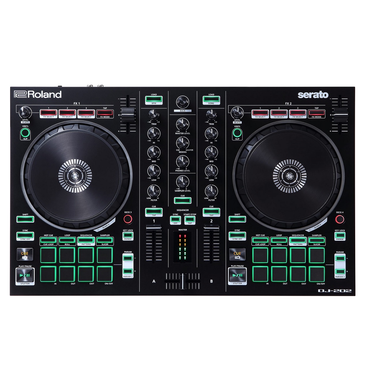 Der Roland DJ-202 ist ein wegweisender Controller für Serato DJ Intro und bietet DJs die Features und Bedienbarkeit eines voll-ausgestatteten, professionellen Controllers in einem robusten und portablen Gerät. Der kompakte DJ-202 basiert auf dem Konzept des Roland-Flaggschiffs DJ-808 und des DJ-505 und ermöglicht DJing, Remixen und das Produzieren von Beats während Live-Performances und in Studio-Sessions. Dank der großen Plattenteller mit minimaler Latenz, individuellen Pad- und Transport-Controllern, einem Onboard-Sequenzer und dem Mikrofoneingang inklusive professioneller Vocal-Effekte verfügt der DJ-202 in seiner Preisklasse über eine einzigartige Funktionsvielfalt.