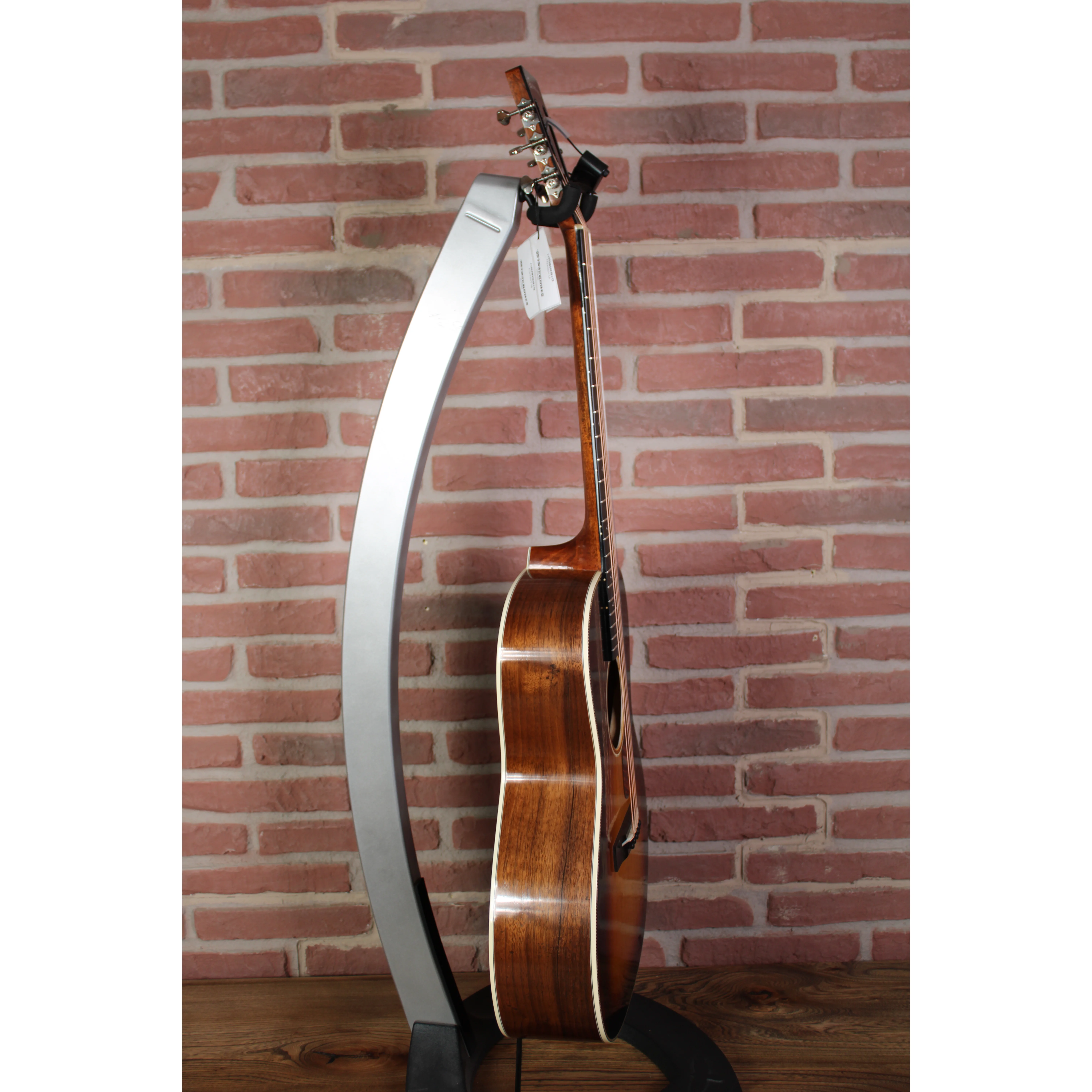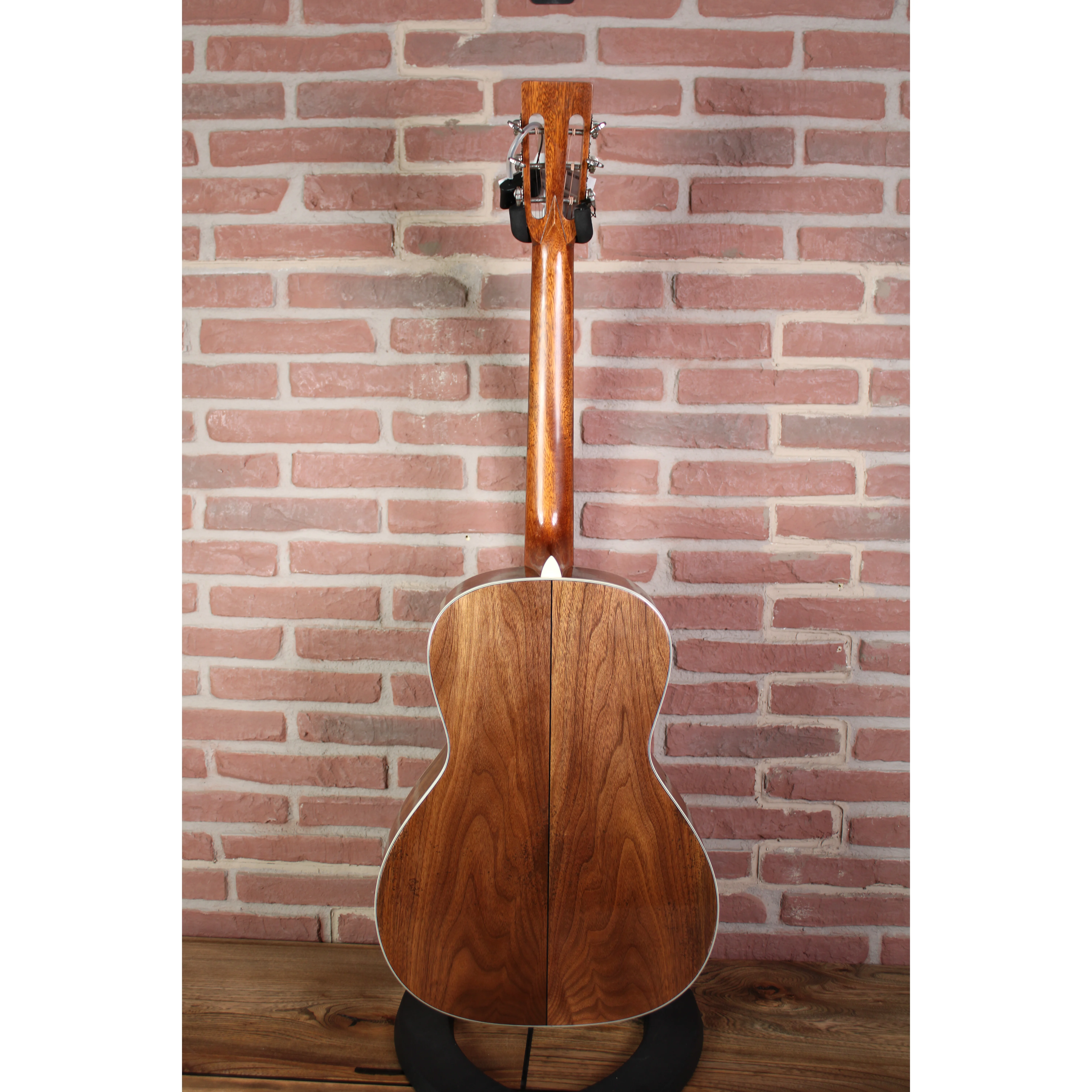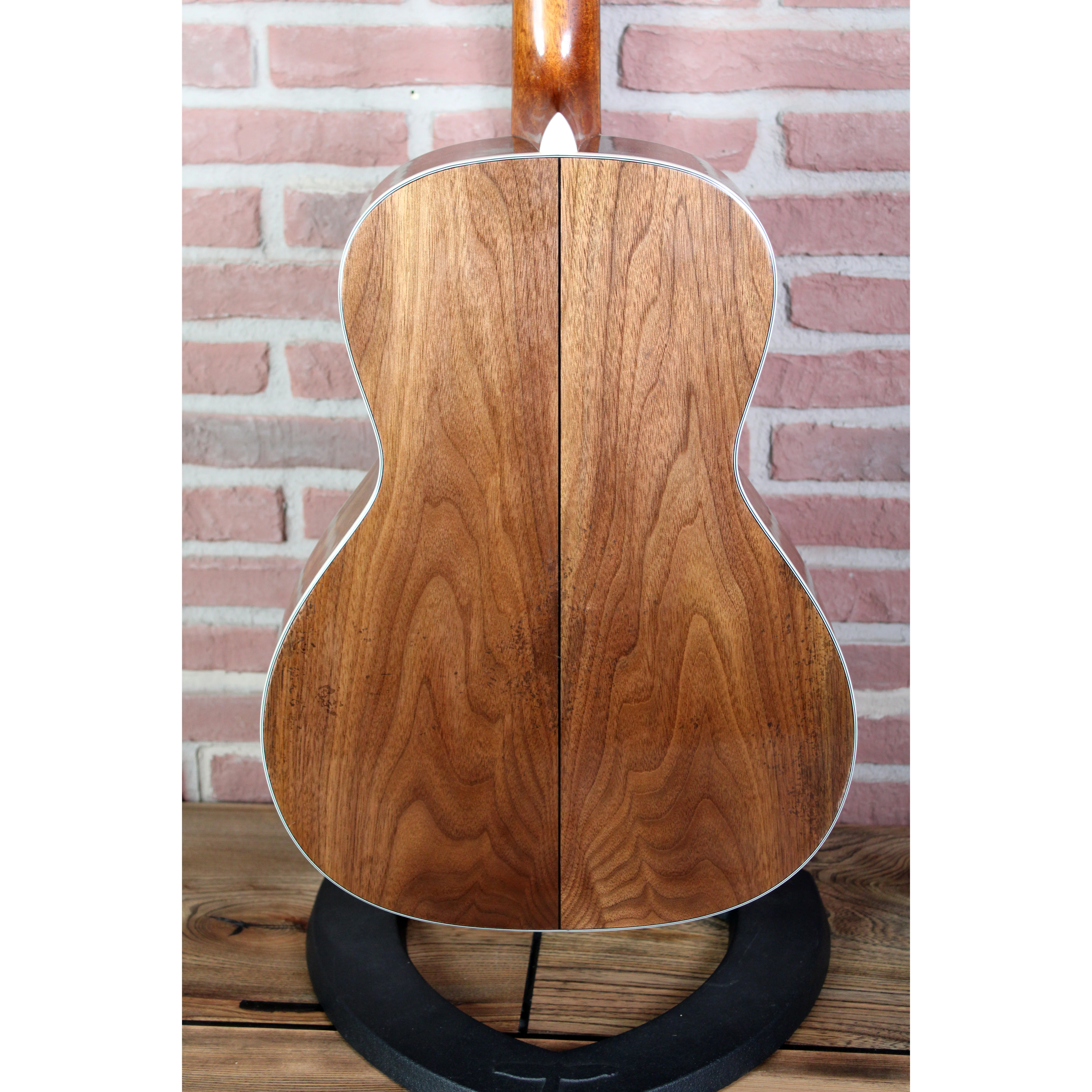 Boden und Zargen aus solidem Palisander runden den Ton mit warmen Mitten und transparenten Höhen ab. Das handgeschnitzte Scalloped‑X‑Bracing ermöglicht muskulösen Druck und gleichzeitig dynamische Feinzeichnung. Der Mahagonihals mit traditionellem Even‑C‑Profil fühlt sich vertraut und griffig an – ob beim Fingerpicking im oberen Register oder beim rhythmischen Akkordspiel.