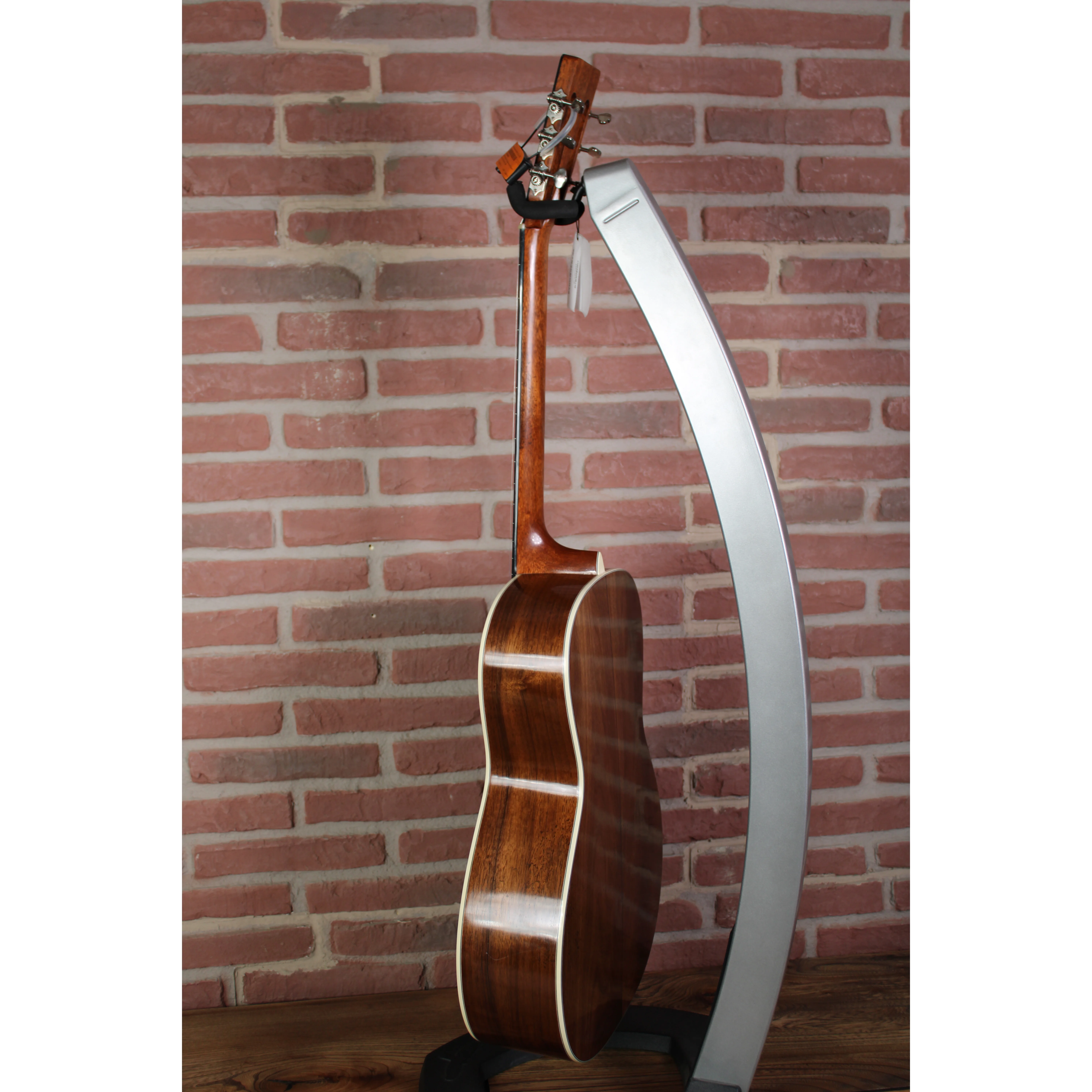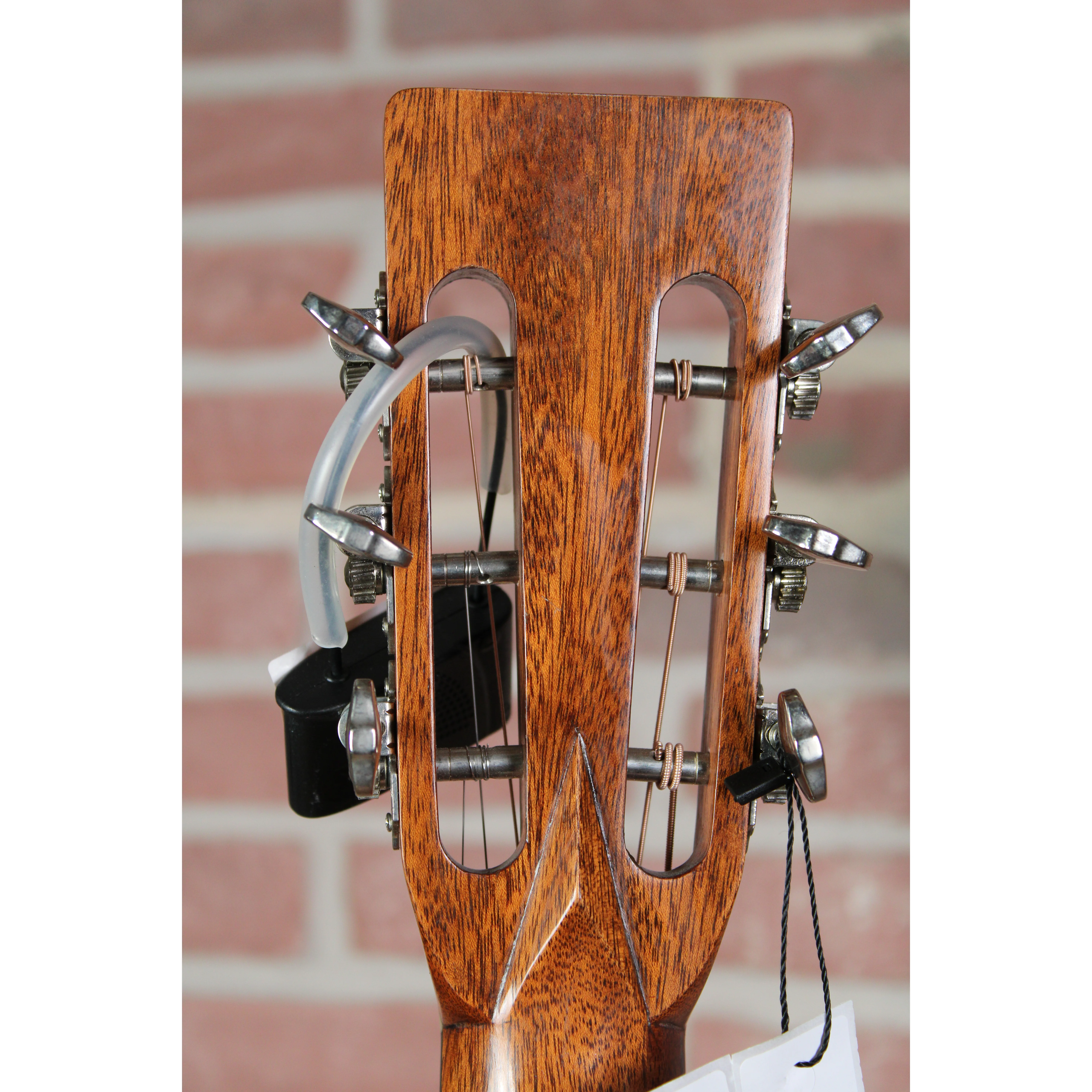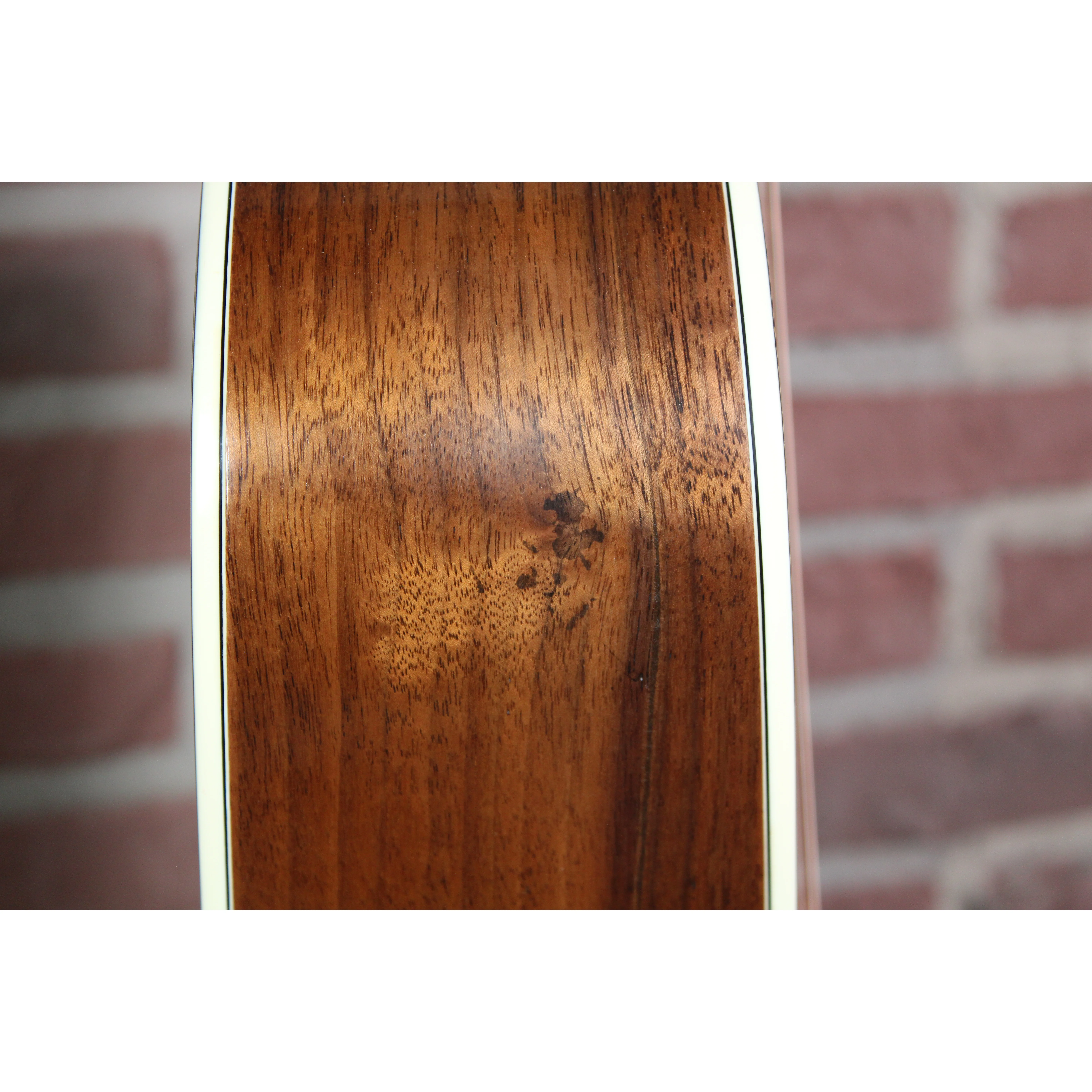 Boden und Zargen aus solidem Palisander runden den Ton mit warmen Mitten und transparenten Höhen ab. Das handgeschnitzte Scalloped‑X‑Bracing ermöglicht muskulösen Druck und gleichzeitig dynamische Feinzeichnung. Der Mahagonihals mit traditionellem Even‑C‑Profil fühlt sich vertraut und griffig an – ob beim Fingerpicking im oberen Register oder beim rhythmischen Akkordspiel.