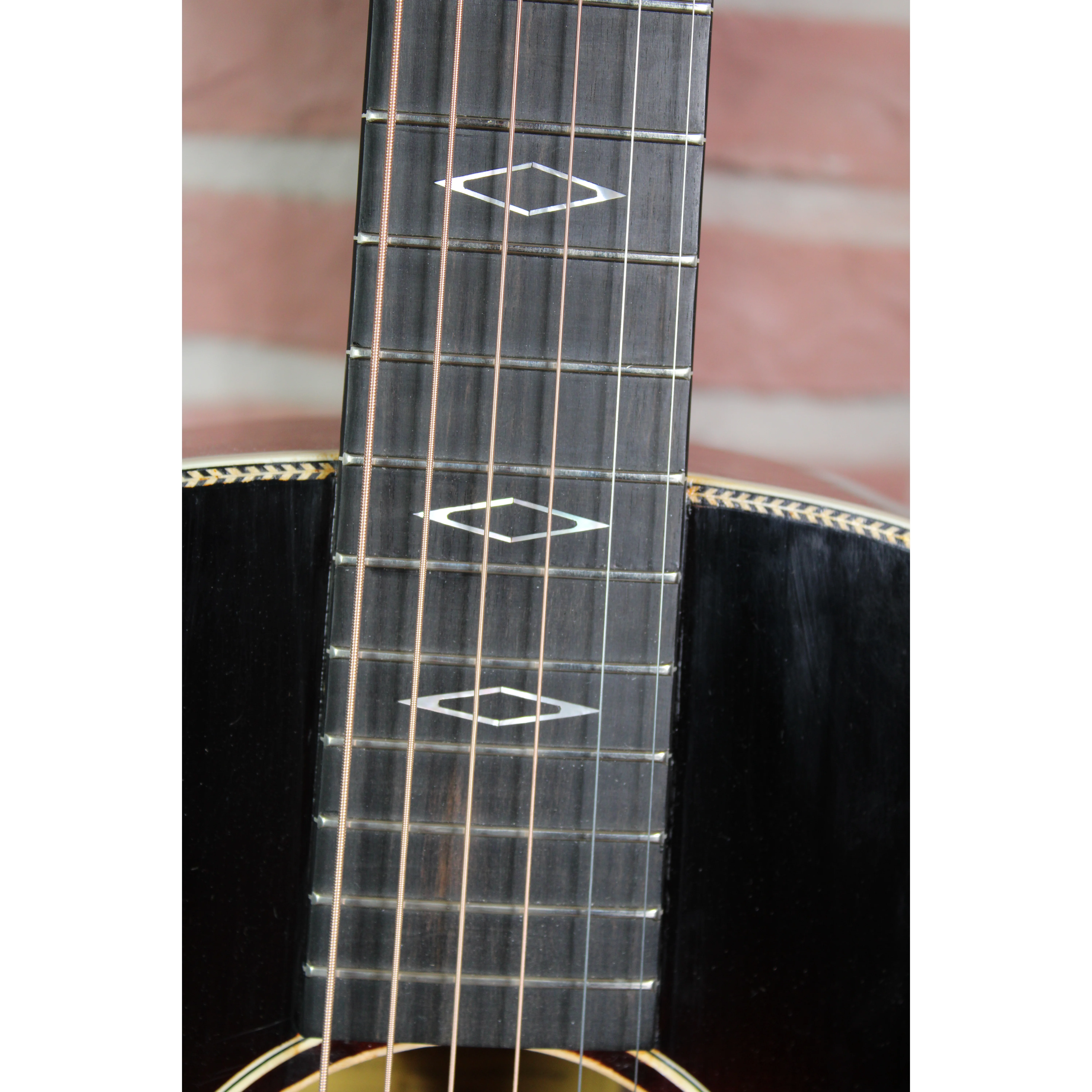 Das Ebenholzgriffbrett mit 12″‑Radius und Abalone‑Dot‑Inlays überzeugt durch glatte Bespielbarkeit und klare Intonation. Optisch setzt die Gitarre ein Statement: Perlmutt‑Headstock‑Logo, Herringbone‑Binding, klassische Rosette und glänzendes Sunburst‑Finish mit Truetone‑Lackierung verleihen edle Heimeligkeit. Vintage‑Mechaniken garantieren glatte Stimmung, während Ebenholz‑Brücke und Knochensattel präzise Saitenführung bieten.