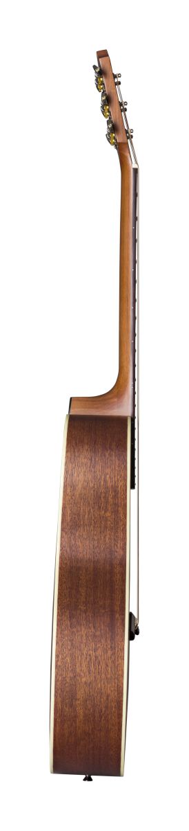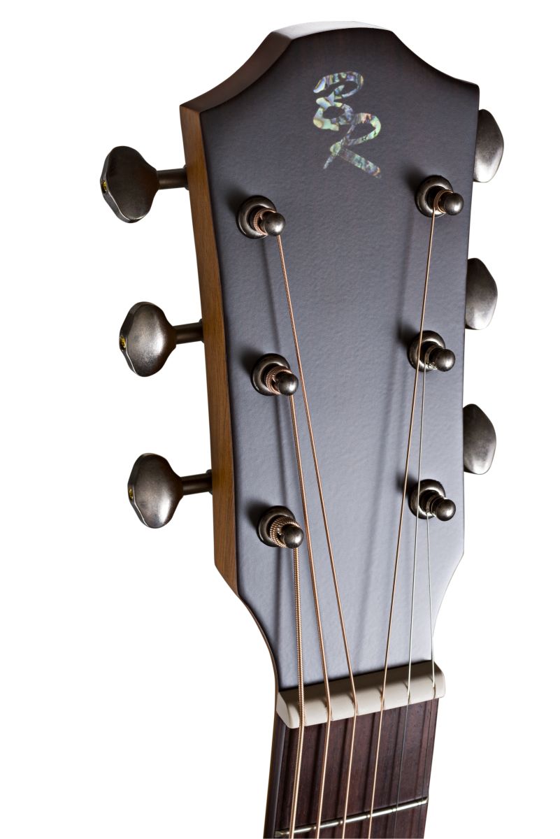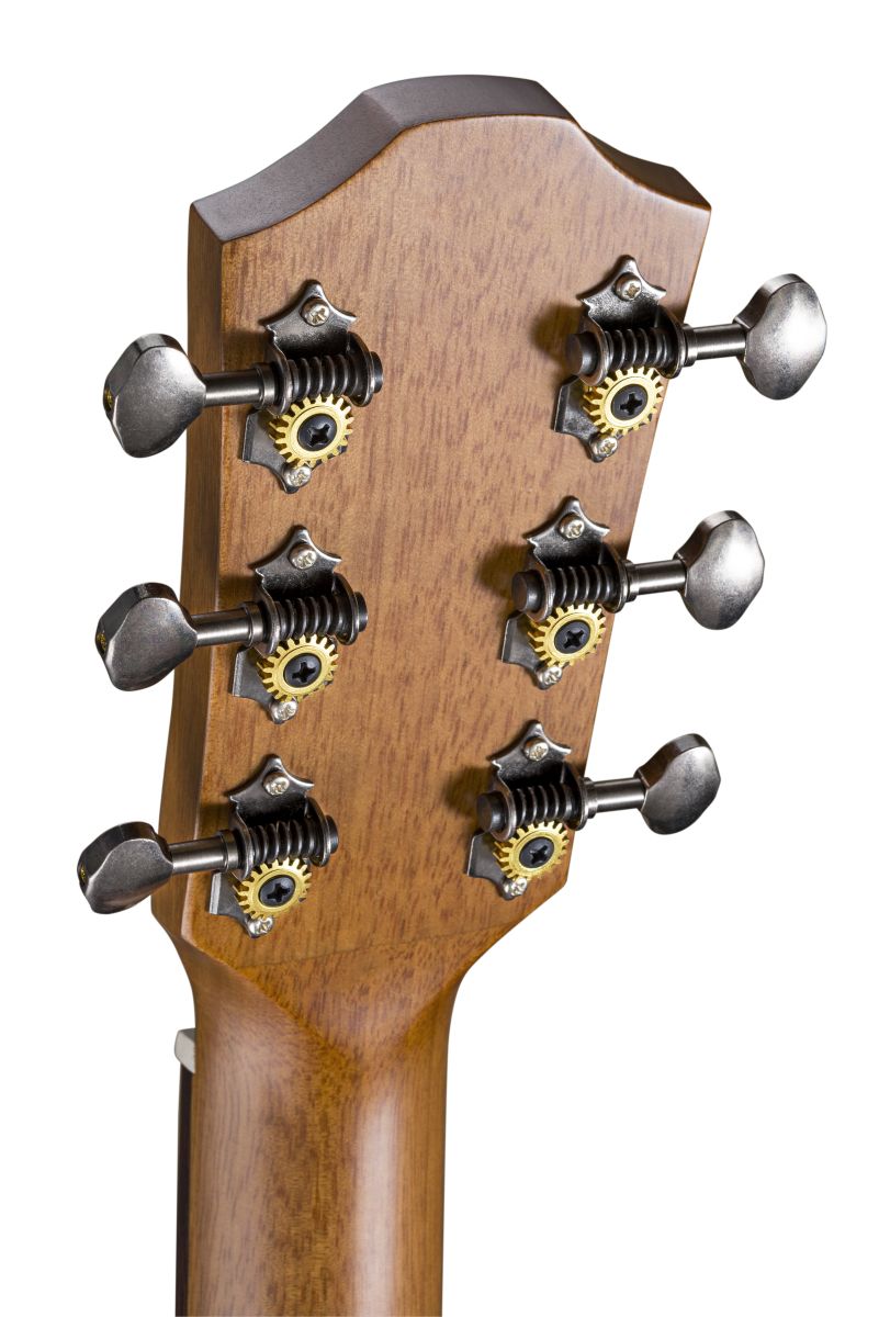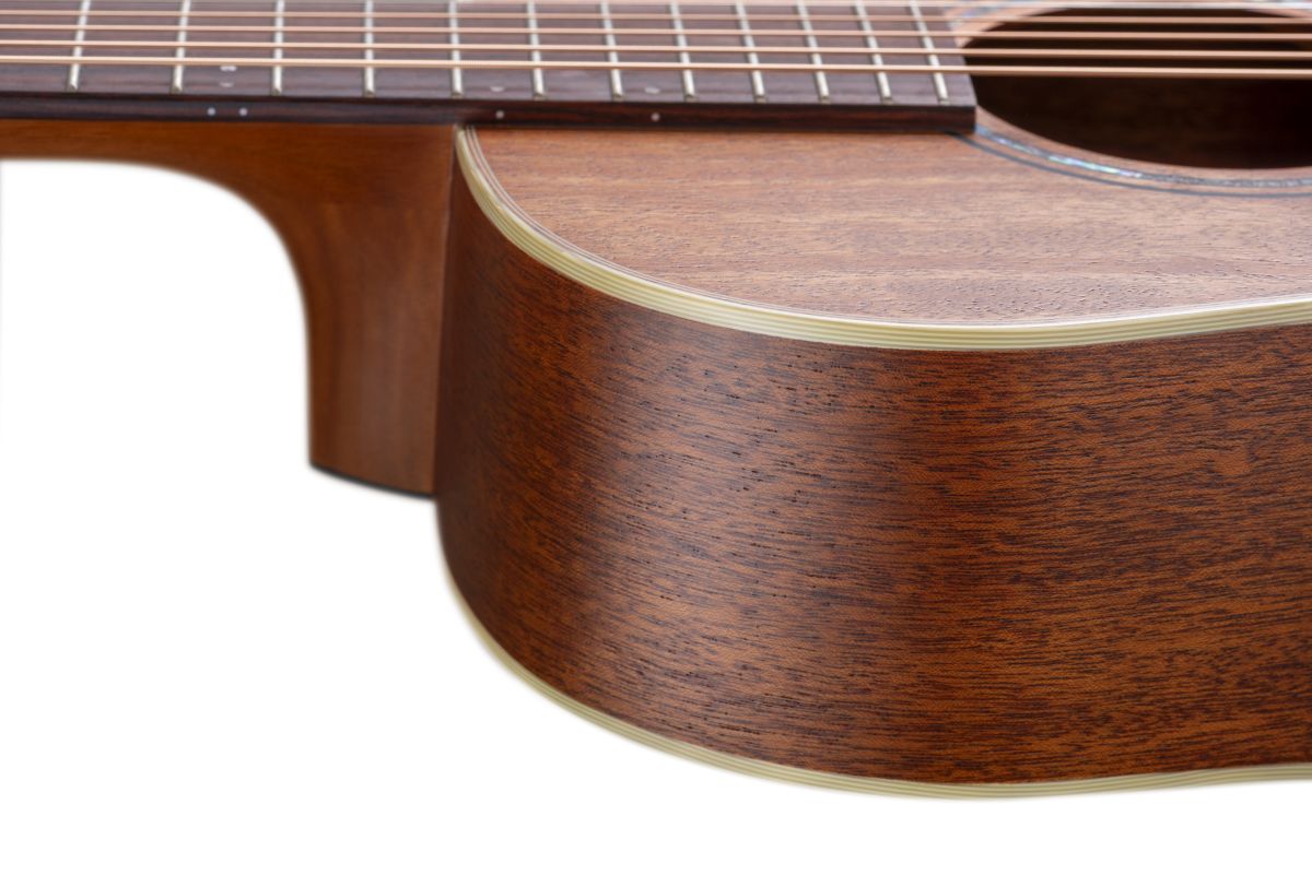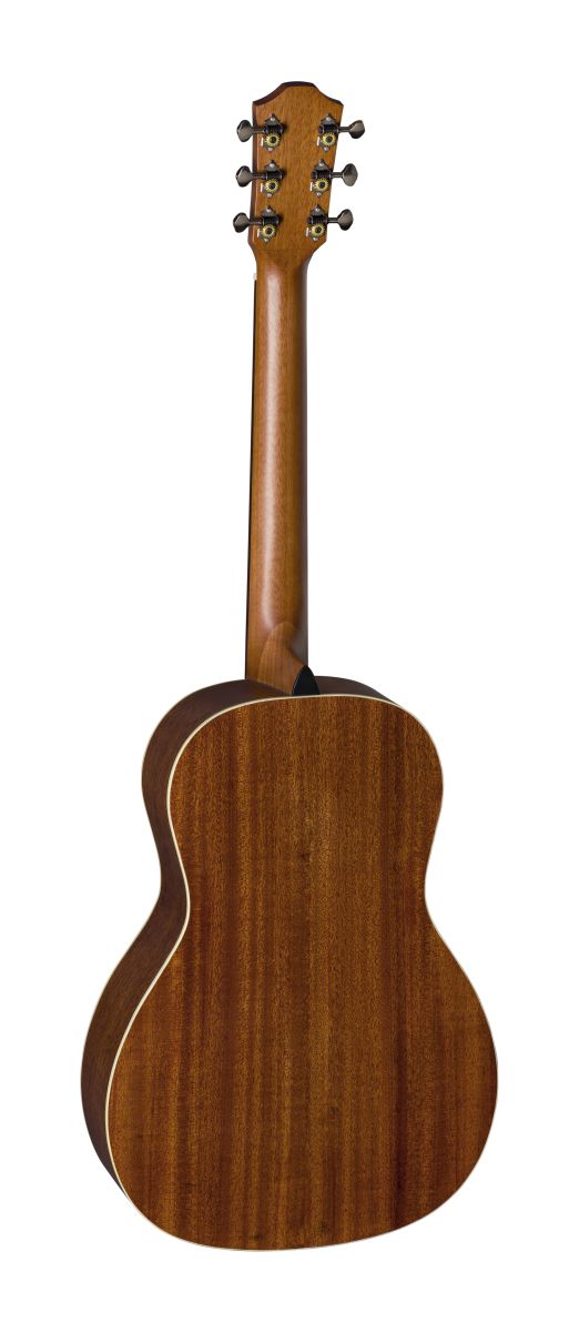 Schon beim ersten Griff wird spürbar: Trotz ihres kompakten Formats („Parlor“) steckt hier beeindruckende Qualität. Die Decke kombiniert Mahagoni und Fichte — Fichte sorgt für klare Ansprache und lebendige Dynamik, Mahagoni für Wärme und Gleichgewicht. Rückseite und Zargen sind aus massiver Mahagoni gefertigt, was dem Klang Tiefe und Fülle verleiht. Der Hals aus Mahagoni in Kombination mit Griffbrett und Steg aus Ovangkol sorgt für ein gut ausbalanciertes Spielgefühl. Die 19 Bünde reichen weit genug, um auch jenseits der Mittelregion musikalisch zu glänzen, und die Mensur von 630 mm ist bestens für die Parlor‑Form gewählt.
