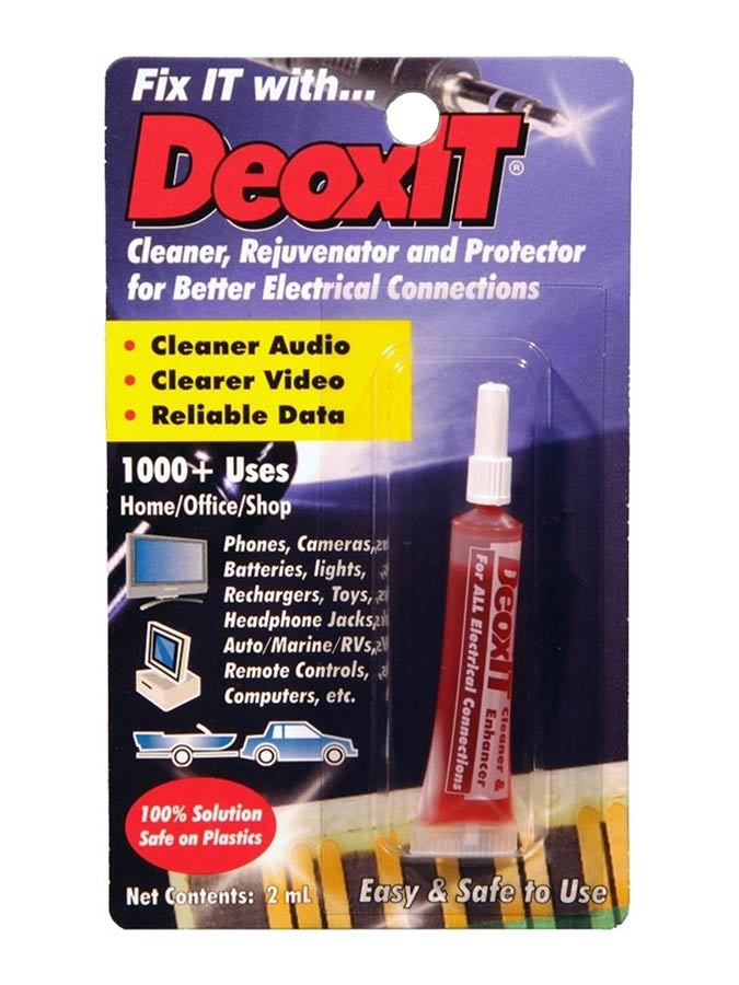 DeoxIT ® D-Series is a fast-acting deoxidizing solution that cleans, preserves, lubricates and improves conductivity on metal connectors and contacts. Use as a general treatment for connectors, contacts and other metal surfaces. Use on non-critical metal surfaces with severe oxidation and corrosion on the metal surface. If there is a discoloration of the metal - it is severe. Use DeoxIT ® to dissolve the contamination. DeoxIT ® will also lubricate and protect the surface. For reference, DeoxIT ® has approximately 20% cleaning action.