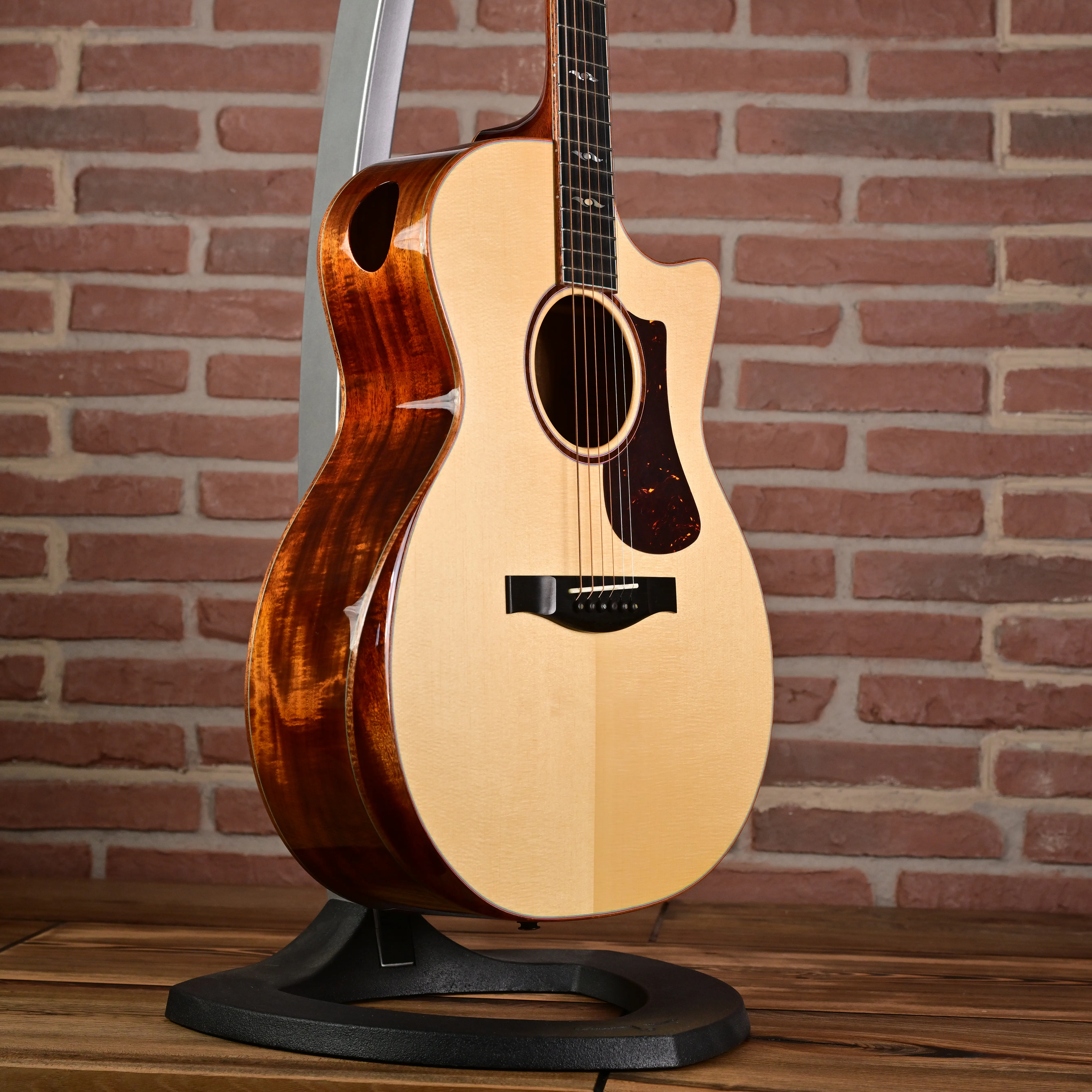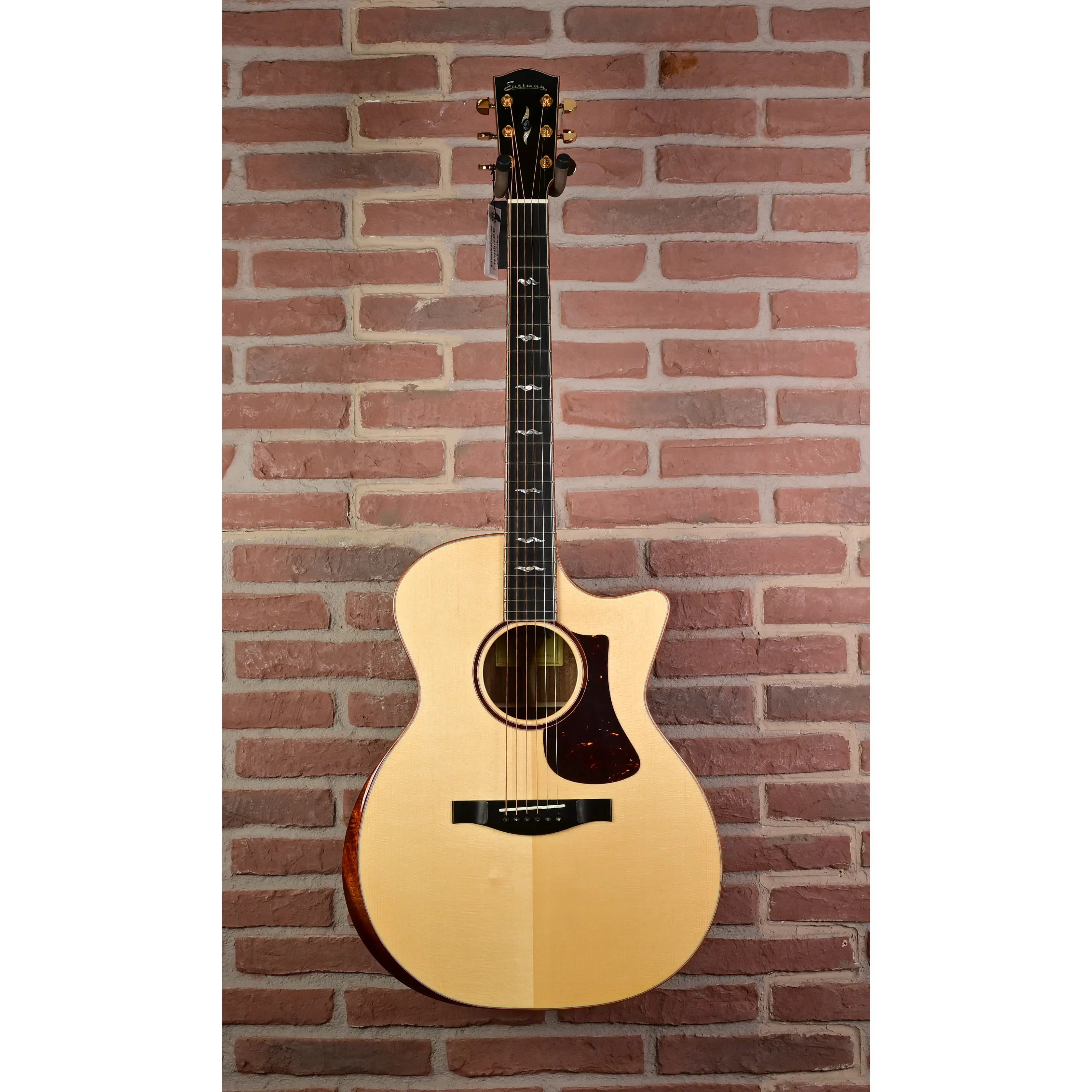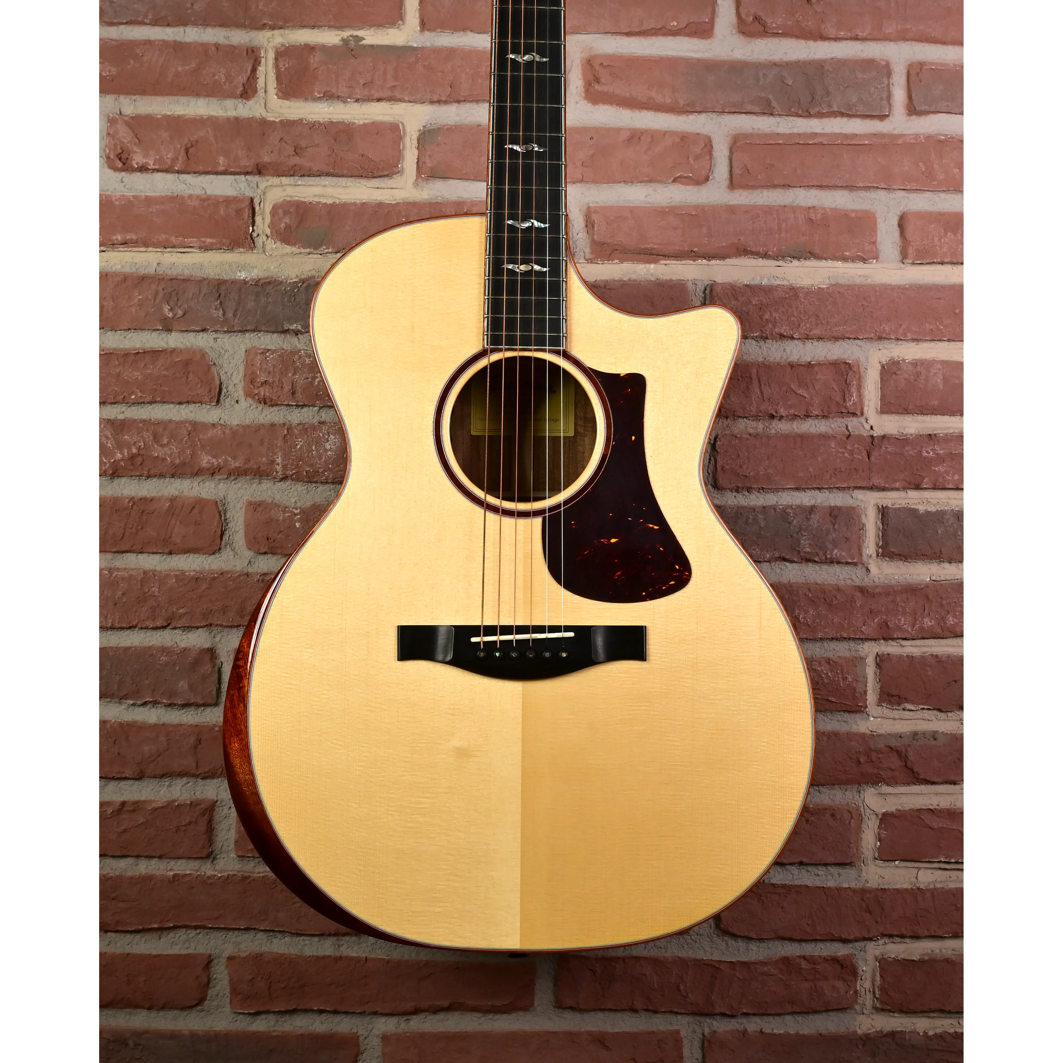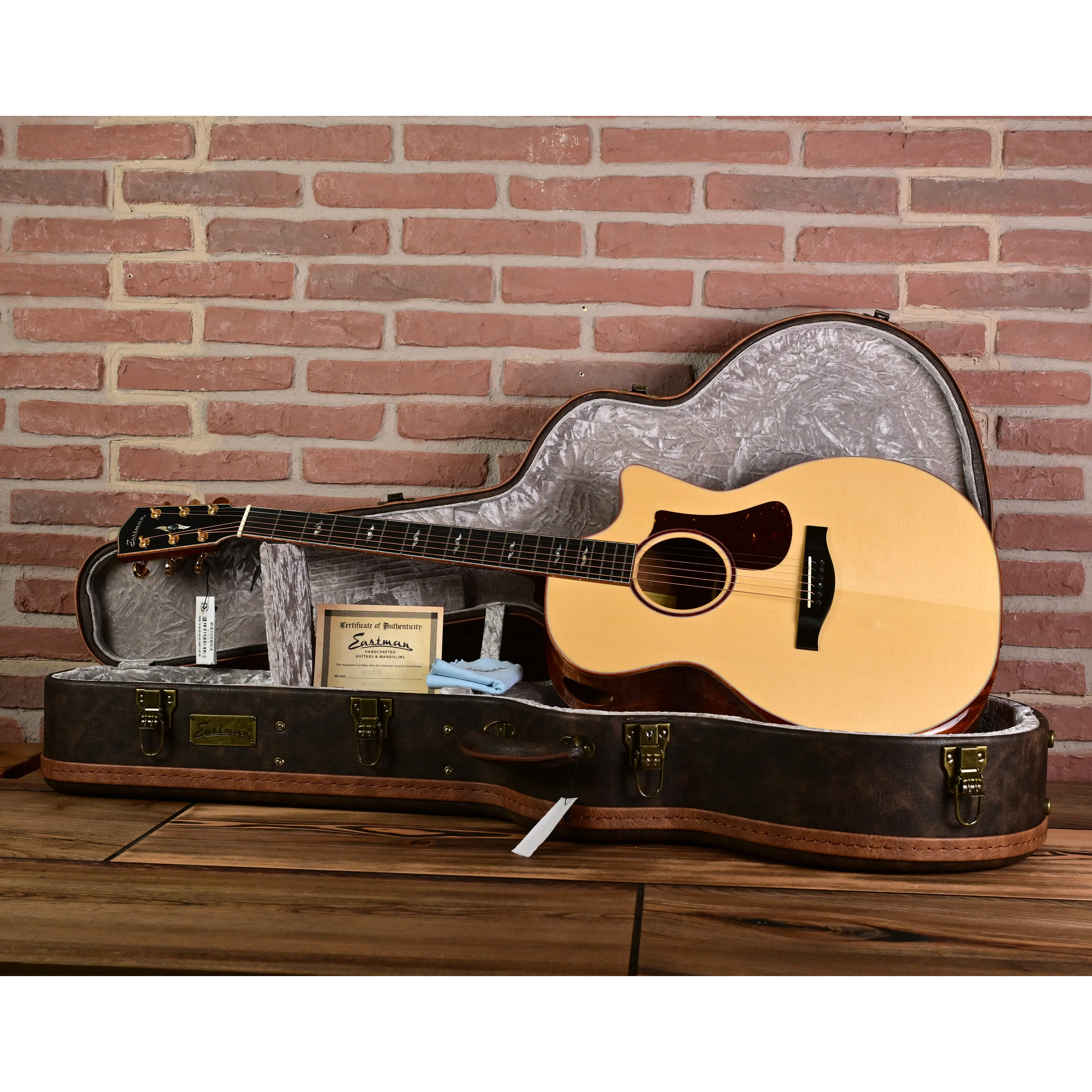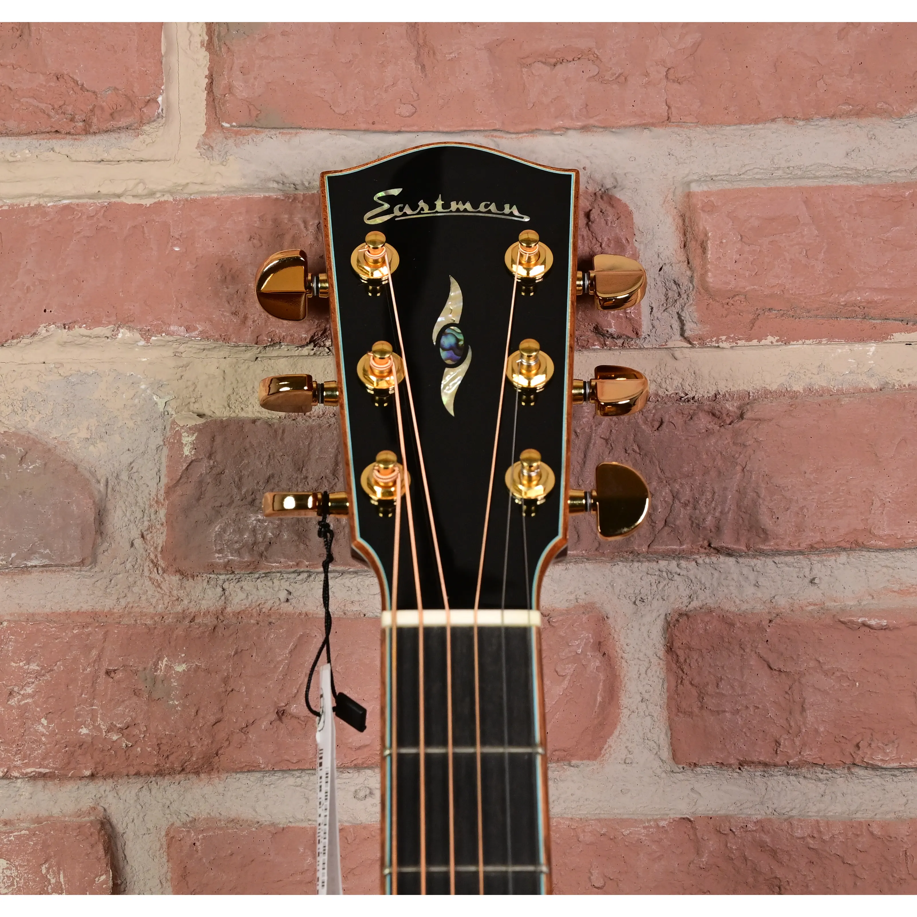 The Eastman AC522CE is an all-solid Grand Auditorium acoustic guitar with an Engelmann spruce top and mahogany body, delivering a warm, balanced tone with clear articulation. The handcrafted X-bracing and additional sound port significantly enhance projection.