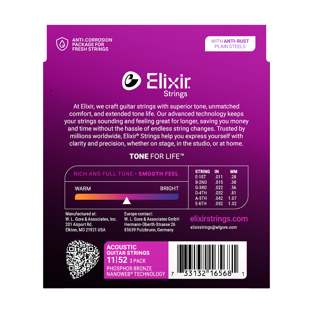 Phosphor Bronze Akustiksaiten von Elixir® Strings kombinieren die unverwechselbare Phosphor-Bronze-Wärme und -Brillanz mit noch langlebigerem Ton.