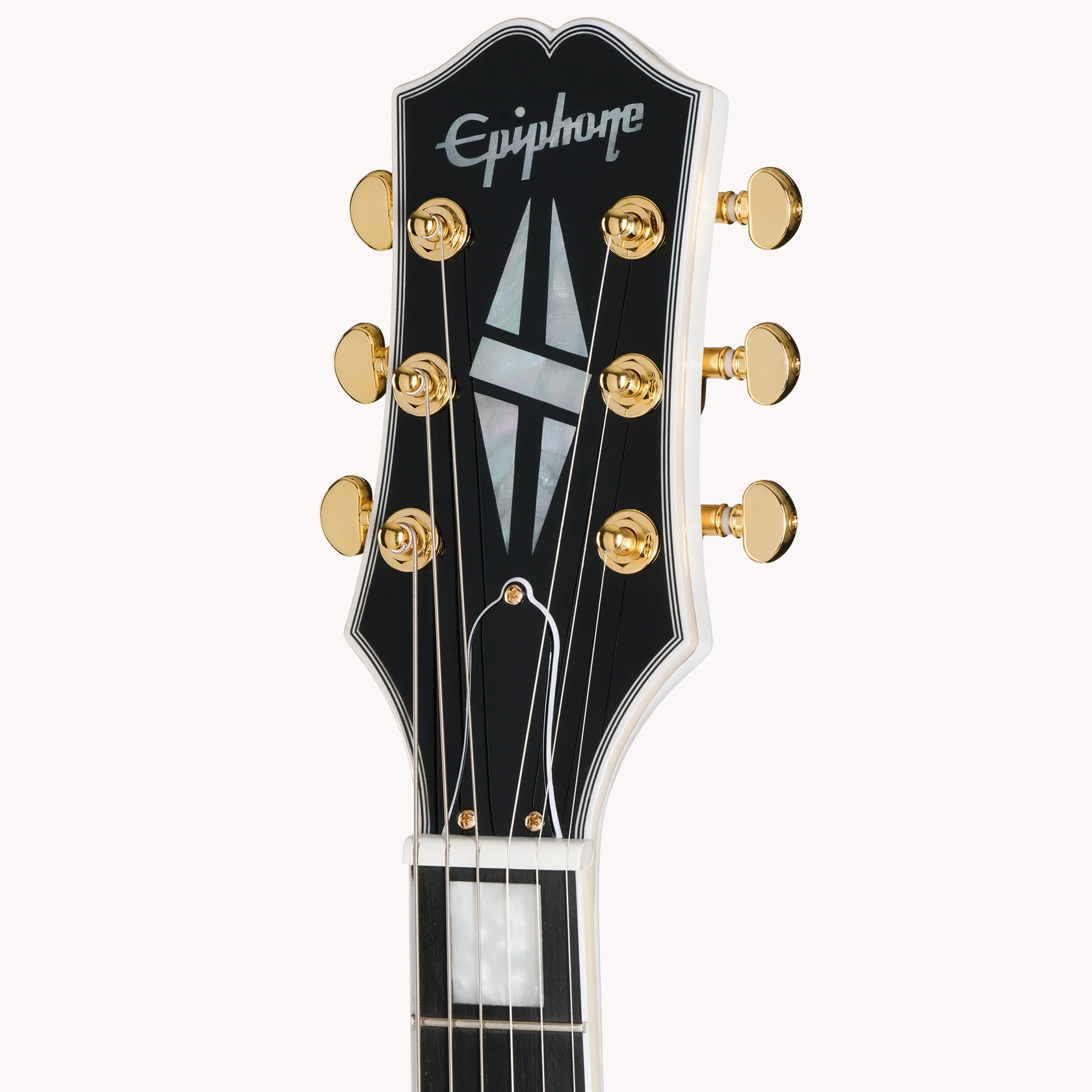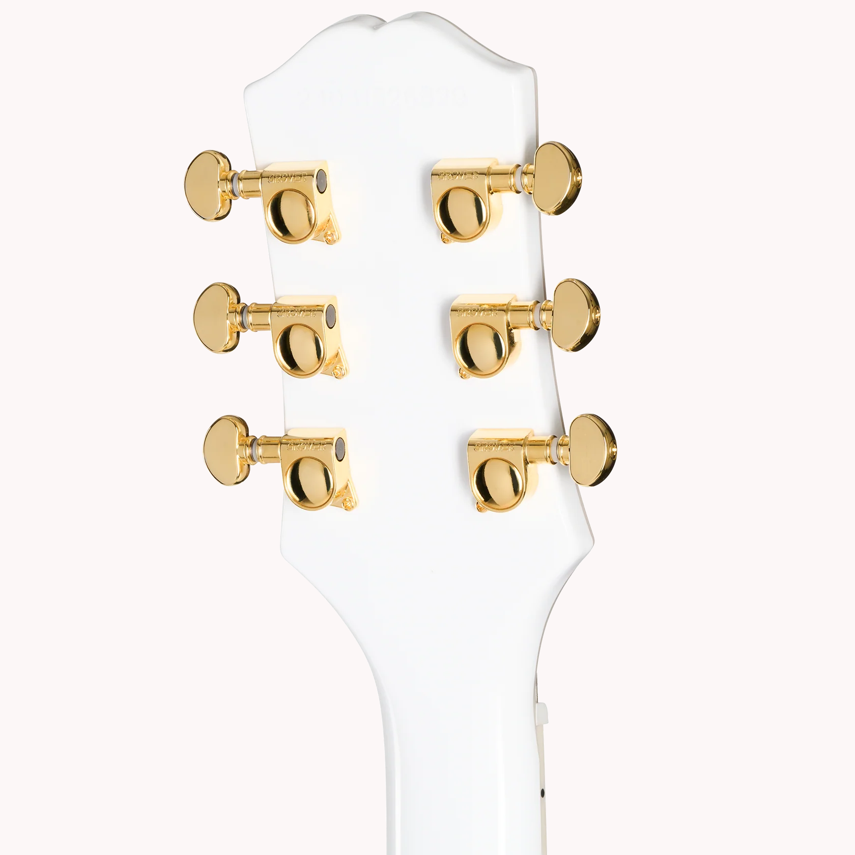 Goldene Hardware unterstreicht den edlen Look der Gitarre, bis hin zu den goldenen Einsätzen der schwarzen Top-Hat-Regler. Die eingefasste Kopfplatte trägt Grover® Mini Rotomatic® Mechaniken sowie das Epiphone-Logo und das Custom Split-Diamond-Inlay – beides aus Perlmutt. Grover Tuner, ein Graph Tech™ Sattel sowie die vollständig einstellbare Epiphone LockTone™ Tune-O-Matic™ Brücke mit Stopbar Tailpiece garantieren exzellente Stimmstabilität und präzise Intonation.