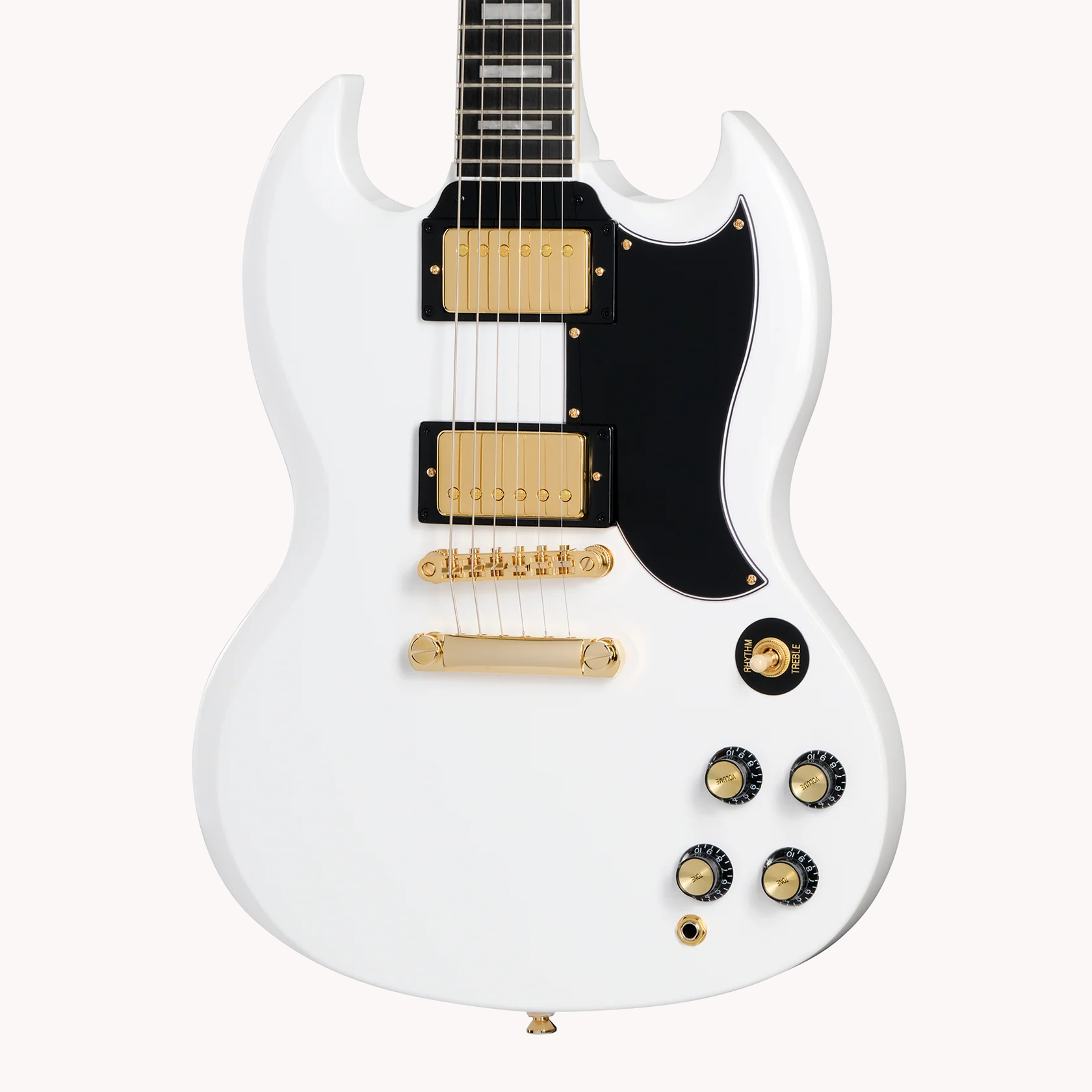 Der konturierte Mahagonikorpus mit doppeltem Cutaway ermöglicht herausragenden Zugang zu allen 22 Bünden. Der eingeleimte Mahagonihals sorgt für das berühmte Sustain der SG. Mit dem 1960 SlimTaper C-Halsprofil bietet die Gitarre ein schnelles, komfortables Spielgefühl – etwas kräftiger als andere SlimTaper-Versionen, aber dennoch ideal für moderne Spieltechniken. Das eingefasste Ebenholzgriffbrett mit 12"-Radius und 22 Medium-Jumbo-Bünden ist mit eleganten Custom-Perloid-Block-Inlays verziert – optimal für Akkorde in tiefen Lagen und saubere Bendings weiter oben am Hals.