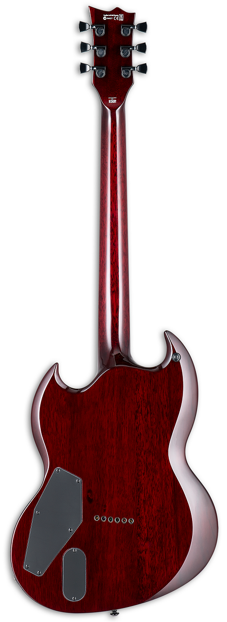 Der Mahagonikorpus ist mit einer transparenten, glänzenden See Thru Black Cherry-Lackierung versehen, die die Schönheit der Holzmaserung durchscheinen lässt. Die Set-Thru-Konstruktion ermöglicht einen einfachen Zugang zu den höchsten Bünden, gepaart mit einem dreiteiligen Mahagoni-Hals. Das Griffbrett aus Makassar-Ebenholz verfügt über 24 Extra-Jumbo-Bünde aus rostfreiem Stahl und weiße ESP-Flaggeneinlagen sowie ein schwarzes Binding am Hals und eine passende Kopfplatte.