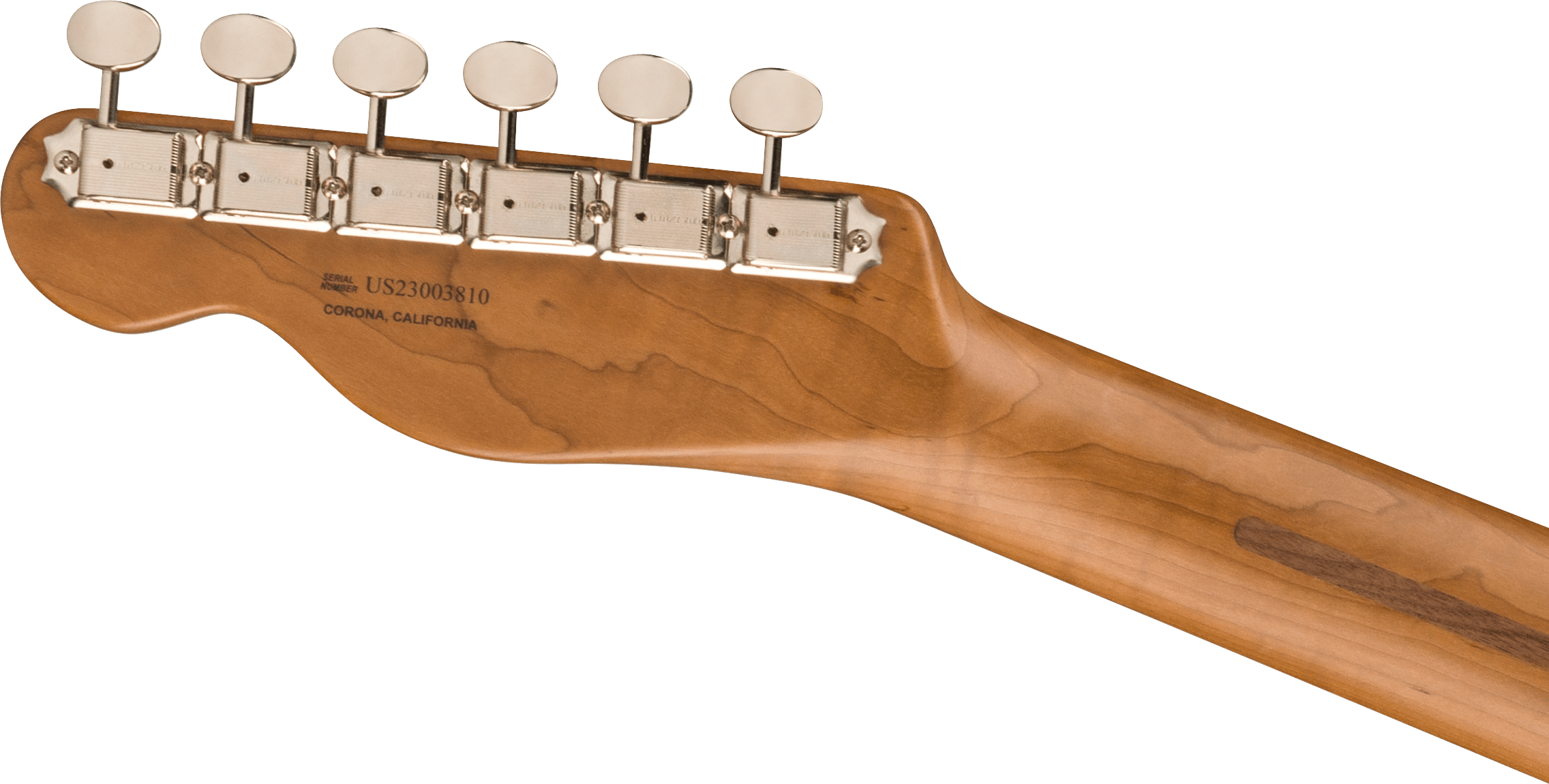 Auf dem halbhohlen Eschekorpus sitzt eine Decke aus italienischer Bergfichte mit Binding. Diese Kombination verleiht dem Instrument eine klare, kräftige Resonanz und eine natürliche klangliche Wärme, die man bei Thinline Modellen nur sehr selten findet. Der Hals aus Roasted Maple (hitzebehandeltes Ahorn) ist im modernen C-Profil gearbeitet. Mit Ebenholz-Griffbrett im 7.25”-9.5” Compound Radius spielt sich diese Tele entspannt und gefühlvoll. Die Tele® Vintage-Bridge mit drei kompensierten Barrel-Saitenreitern aus Messing unterstützt den klassischen tele Ton und eine exakte Intonation. Custom-designed Suona Tele® und Custom Shop Twisted Tele® Pickups erzeugen den unverwechselbaren Ton. Gekrönt wird dieses zeitlose Instrument von einem edlen Nitrolack Violin Burst Finish mit passend lackierter Kopfplatte.