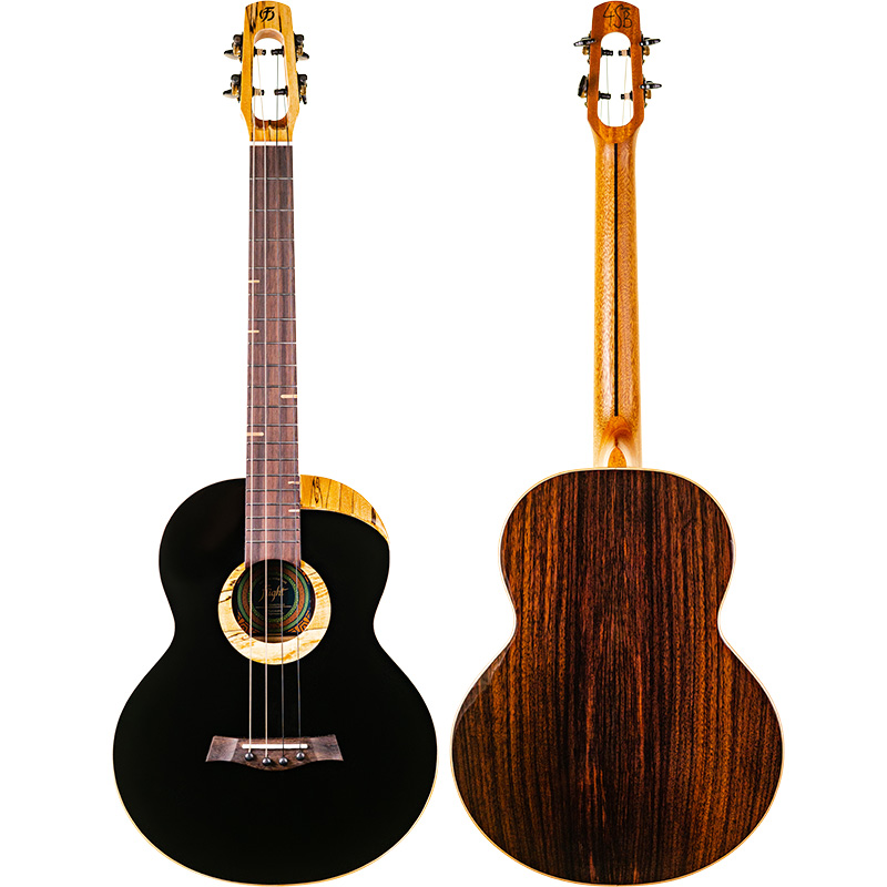 Aufruf an alle Bariton-Spieler! Das ist die Flight 4SB Baritone, eine Ukulele, die in Zusammenarbeit mit dem Ukulele-Künstler 4stringboy (Sammy Turton) entwickelt wurde. Wie ihr Tenor-Pendant zeichnet sich auch die 4SB Baritone durch die Kombination einer massiven Fichtendecke mit einem massiven Palisanderkorpus aus. Das Ergebnis? Ein kraftvoller, kristallklarer Klang, der bei jedem Schlag mitschwingt. Sammy wollte ein Statement setzen, und deshalb kommt die 4SB Baritone mit einer glatten, glänzenden schwarzen Decke, die durch schwarze Mechaniken, schwarze Stegpins und eine schwarze Deluxe-Gigbag ergänzt wird. Getreu dem Design der 4SB werden die natürlichen Elemente nicht vergessen: Der Palisanderkorpus ist glänzend lackiert und zeigt seine reiche, natürliche Maserung. Gespaltener Ahorn ziert die Rosette, den Cutaway, die Einfassungen, die Bundmarker und die Kopfplatte und verleiht diesem kühnen Instrument einen Hauch von Karamellwirbel.