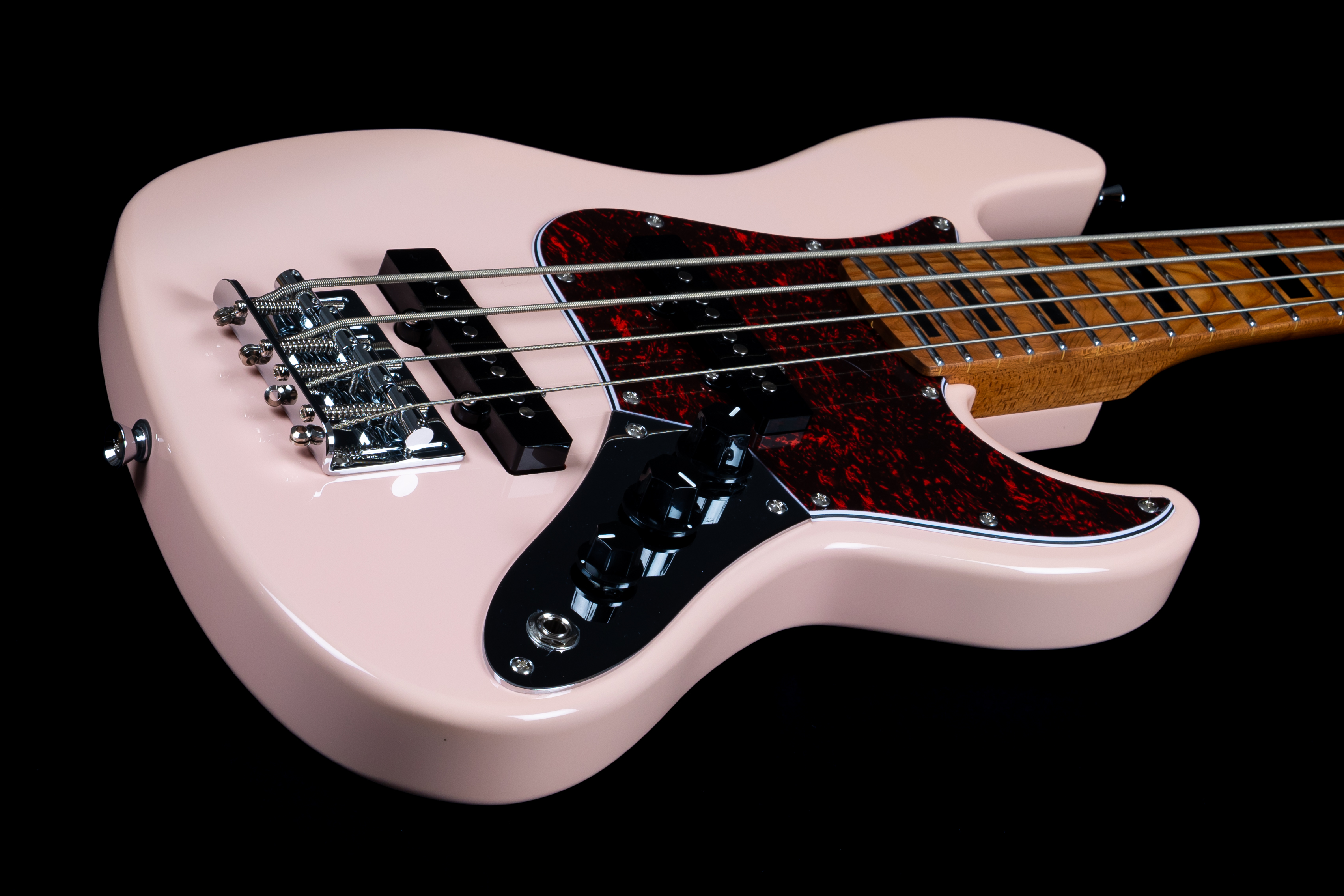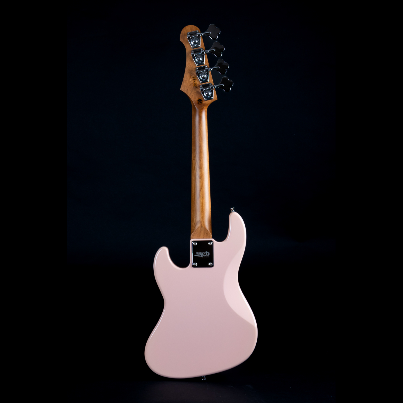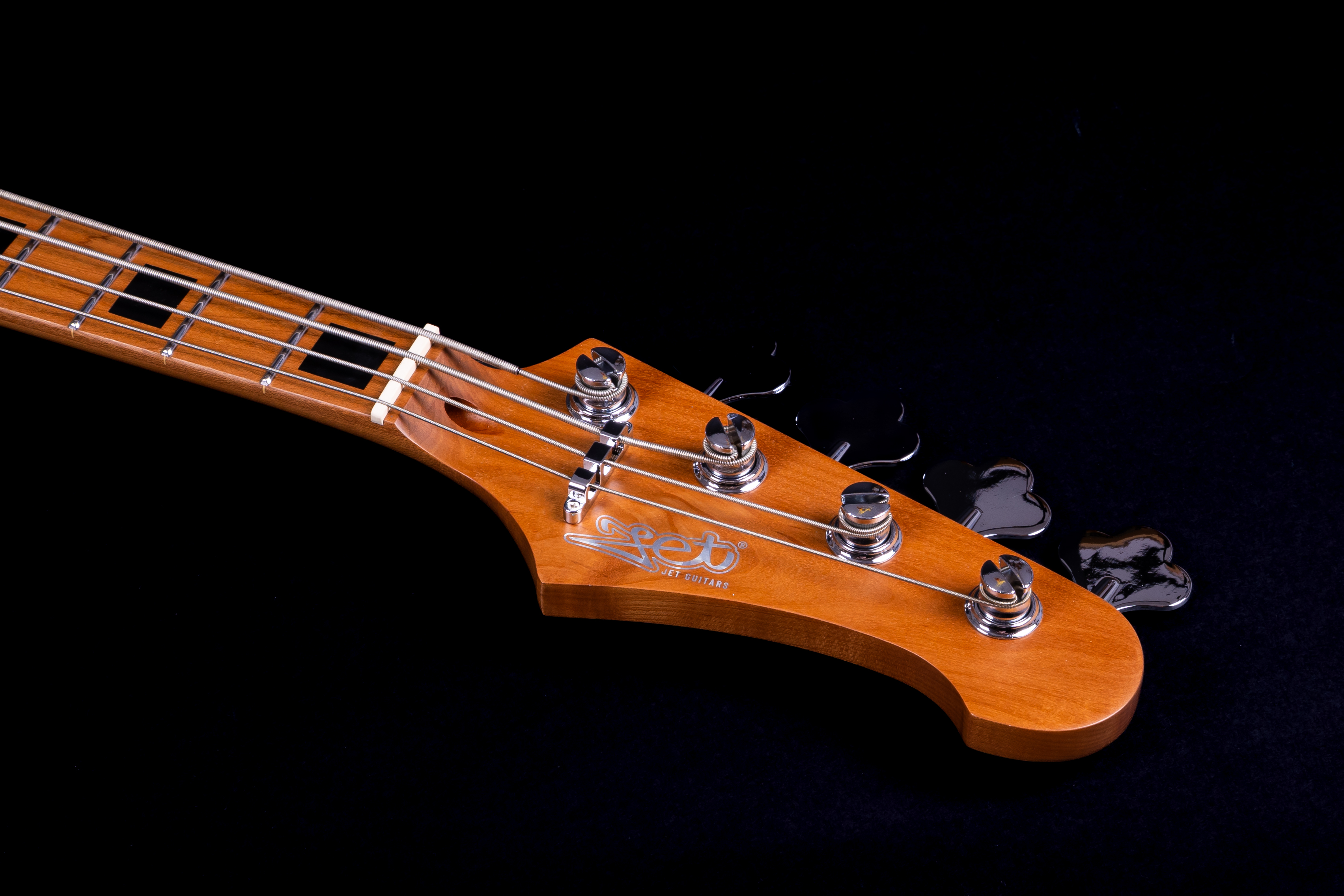 Trotz seiner Reise-Abmessungen steht der JB-300 Travel Bass klanglich nicht zurück: Der Korpus aus roasted Poplar sorgt für ein ausgeglichenes Resonanzverhalten, während der Hals aus roasted Canadian Maple mit einem Modern‑C-Profil souveränen Komfort und schnelle Ansprache bietet. Das Maple‑Griffbrett mit 12″ (≈ 305 mm) Radius liegt angenehm in der Hand – ideal für flüssige Melodielinien oder saubere Akkordarbeit. Die 19 Bünde reichen weit genug, um auch höher gelegene Linien sauber zu realisieren. Die Kurzmensur (Scale 23″) macht das Instrument besonders griffig und spielerfreundlich – perfekt für kompakte Setups oder Musiker mit kleineren Händen.