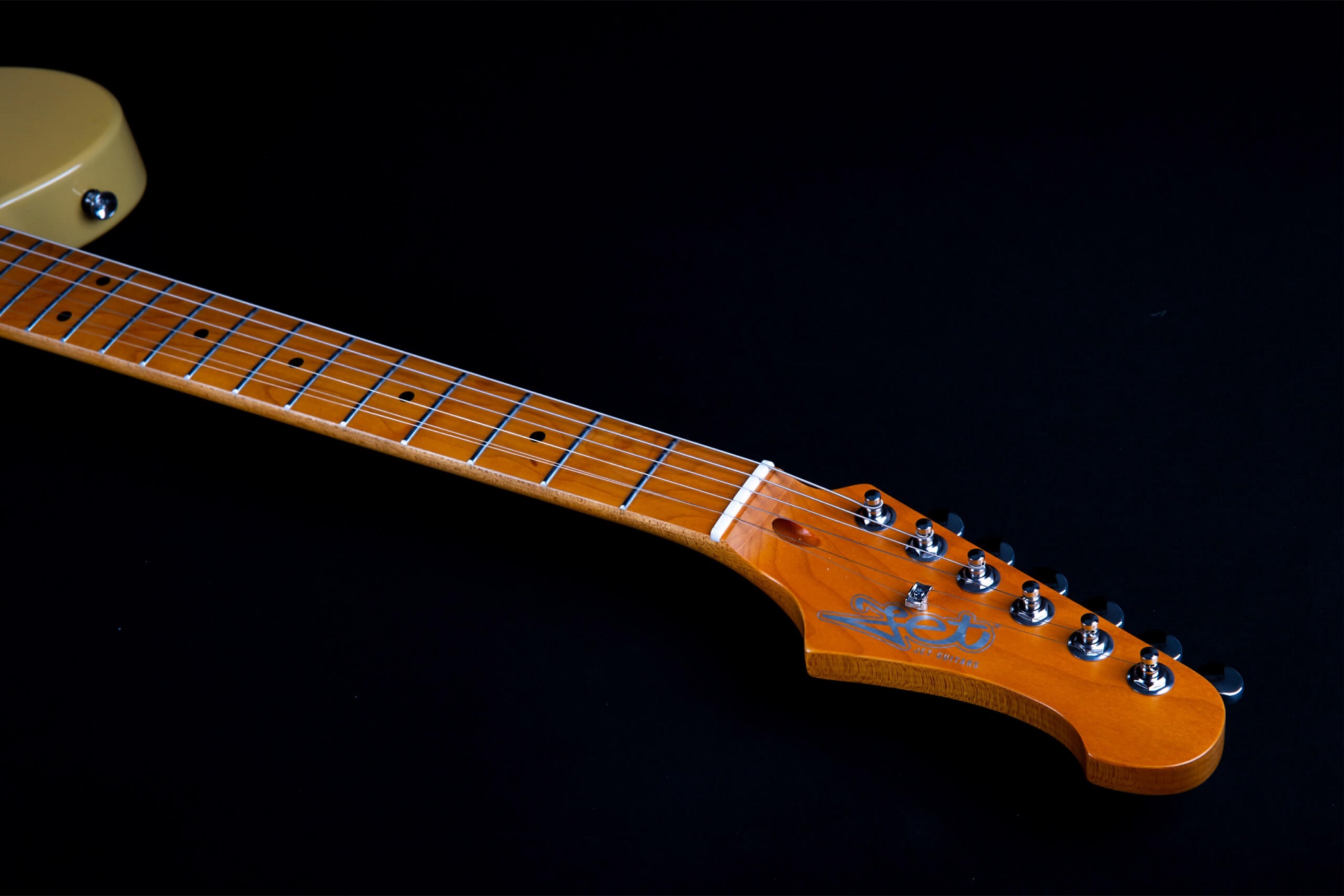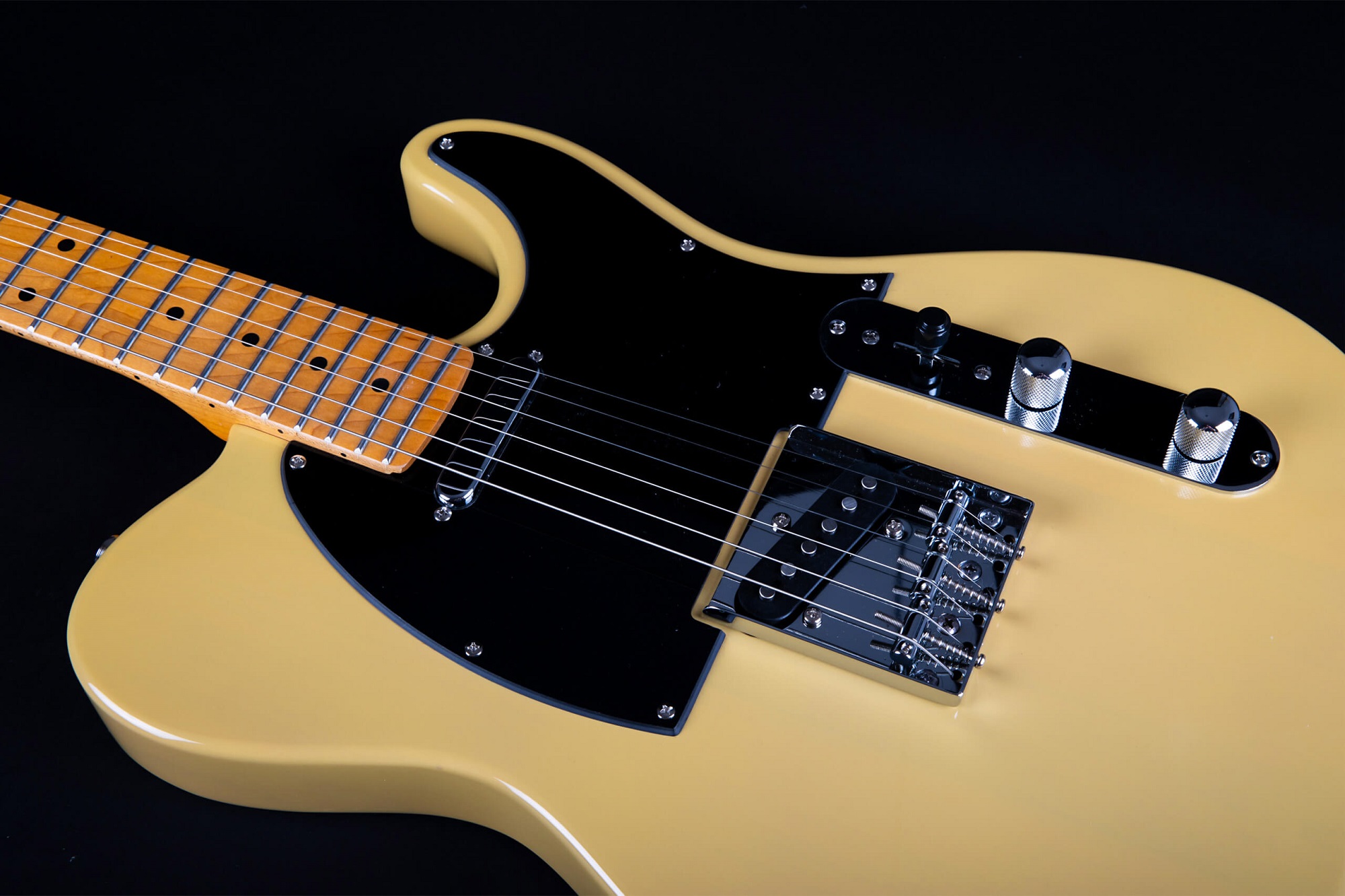Der Korpus aus Basswood (Linde) liefert eine ausgewogene Grundtonbasis: ausgewogen, mit guter Dynamik, ohne zu stark in die Mitten oder Höhen zu drängen. Der Hals aus kanadischem „roasted maple“ (röstiertes Ahorn) in moderner C‑Form sorgt für angenehme Bespielbarkeit – weder zu schlank noch zu dick. Auf dem Griffbrett (häufig Rosewood, je nach Variante) lassen sich 22 Bünde mit einem Griffbrettradius von 9,5" komfortabel erreichen. Die Mensur beträgt 25,5" (ca. 648 mm) – klassisch für Tele-ähnliche E‑Gitarren.
