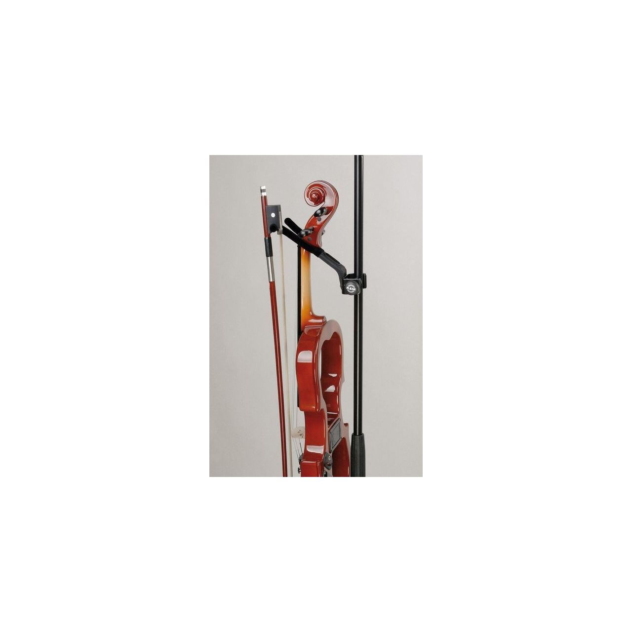 Egal ob Konzertsaal, Musikschule, oder für zu Hause: mit dem neuen König&Meyer Violinenhalter für Stative haben Sie Ihr Instrument immer griffbereit. Mittels Klemmelement mit oberflächenschonender Gummieinlage kann der Halter an alle zylindrischen Rohre bis zu einem Durchmesser von 30 mm montiert werden. Die Violine wird am gewölbten Ende des Wirbelkastens aufgenommen, dadurch wird das unbeabsichtigte Verstellen der Wirbel verhindert. Durch die tiefe Form des Halters ist ein Herausdrehen oder Fallen des Instrumentes praktisch ausgeschlossen. Der integrierte Bogenhalter komplettiert den perfekten Einsatz der flexiblen Halterung. Der strapazierfähige Flocküberzug und der zusätzliche Klettbandschutz schonen die Violine vor dem Verkratzen und vor dem Anschlagen am Rohr.
