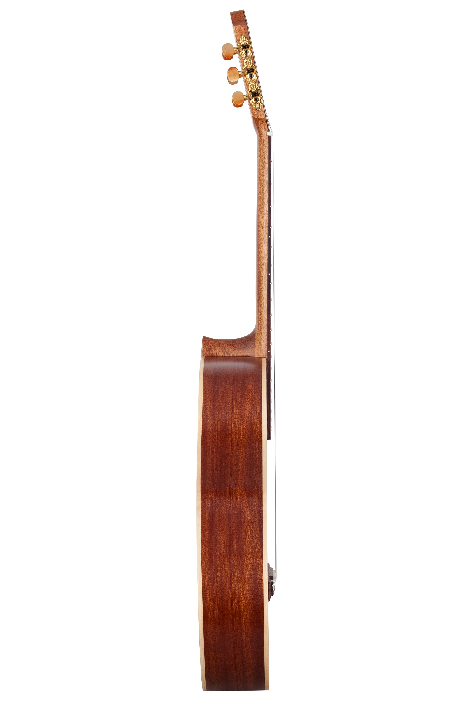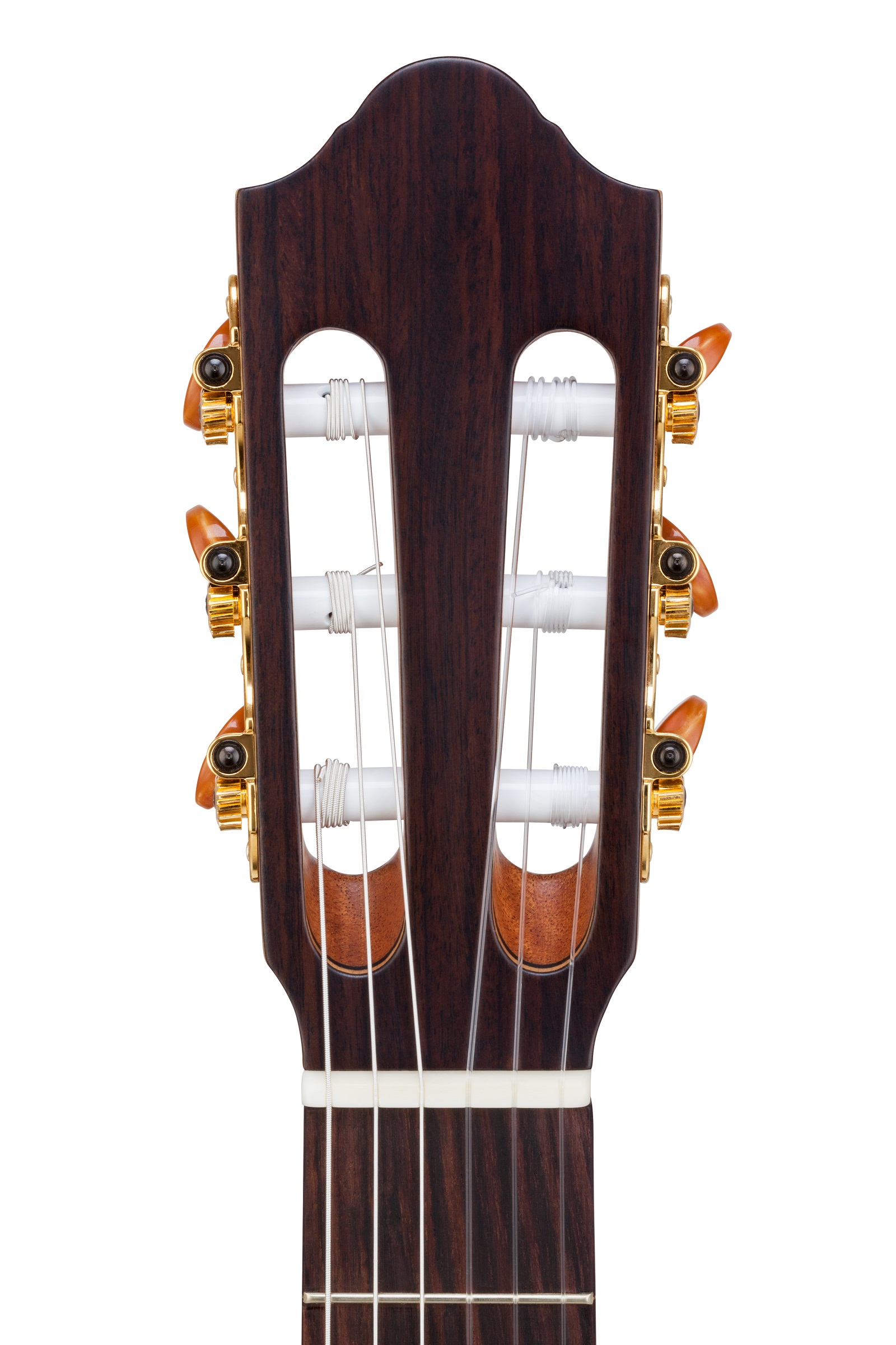 Für höchste Klangqualität sorgen der Knochensattel und -nuss, der Ebenholz-Stegeinbau und die Royal Classic Sonata-Saiten, die ab Werk Spannung, Ansprache und Resonanz bieten. Die Ausstattung wird durch goldfarbene Mechaniken mit bernsteinfarbenen Knöpfen ergänzt.