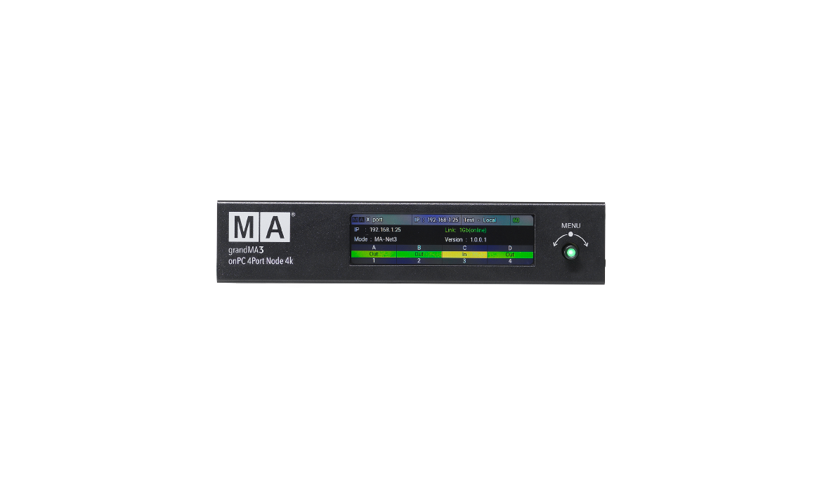 Noch ein paar Fakten, die Du wissen solltest? Alle grandMA3 Nodes sind von jeder grandMA3 Konsole oder onPC Station im Netzwerk fernkonfigurierbar. Sie sind in der Lage, MA-Net3, MA-Net2, sACN und Art-Net Daten zu verarbeiten. Sie sind vollständig RDM-kompatibel. Ein 3,9"-Farbdisplay auf der Vorderseite ermöglicht eine einfache Konfiguration und einen schnellen Statusüberblick.