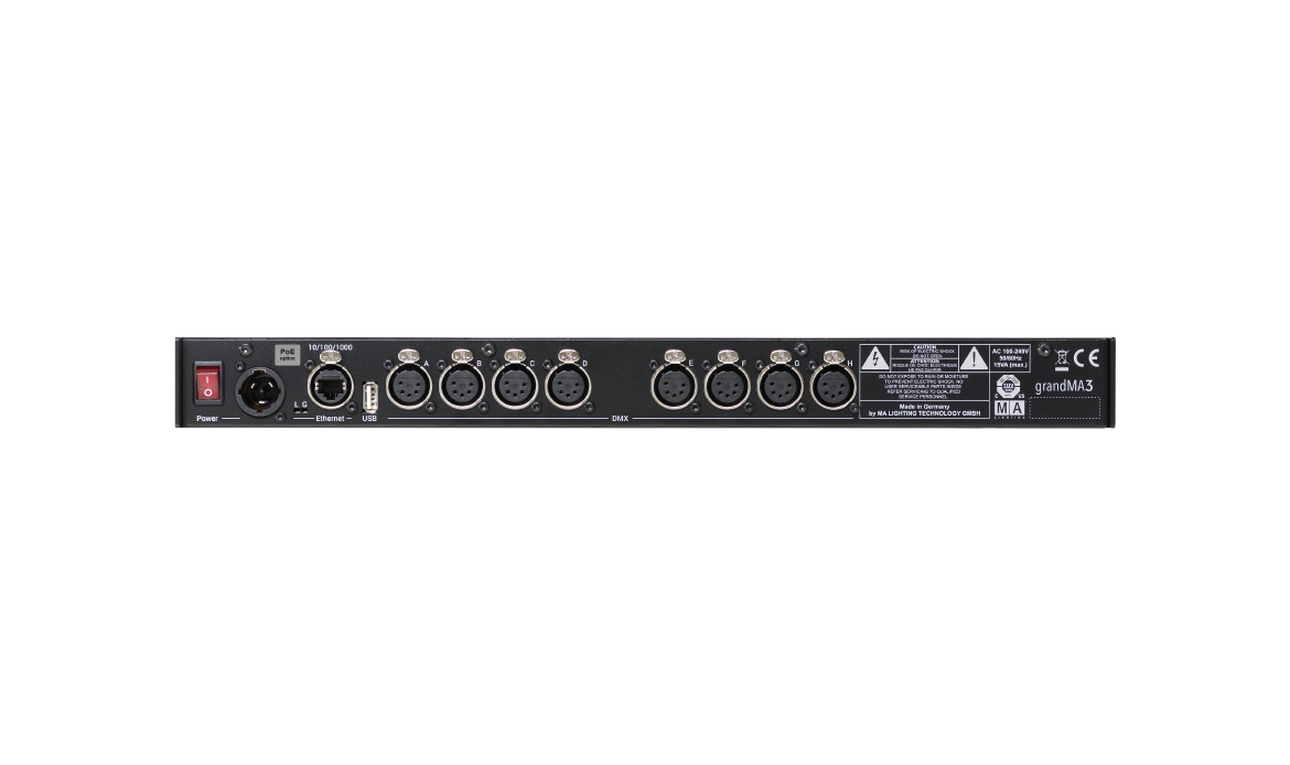 Der grandMA3 onPC 8Port Node 4k PoE wird in einem 19“ 1HE Gehäuse geliefert und ist für die synchrone Ausgabe von acht DMX-Universen in jedem grandMA3 System ausgelegt. Um eine optimale Leistung zu gewährleisten, ist der Node mit einem Hochleistungsprozessor und einer 1 Gb/s Ethernet-Verbindung ausgestattet, die eine zuverlässige und stabile Umwandlung von Ethernet zu DMX (und umgekehrt) garantiert. Er kann vollständig über PoE (Power over Ethernet) mit Strom versorgt werden, um zusätzliche Verkabelung zu vermeiden.