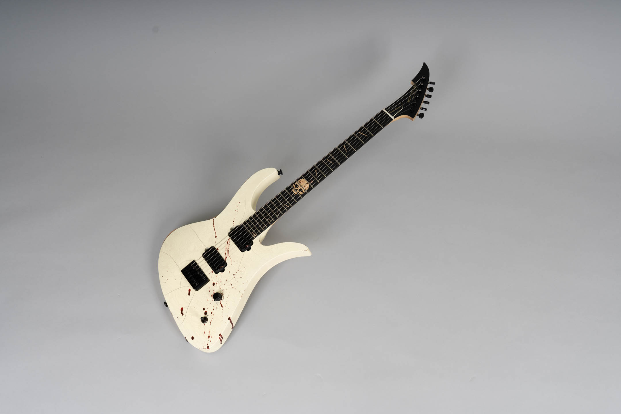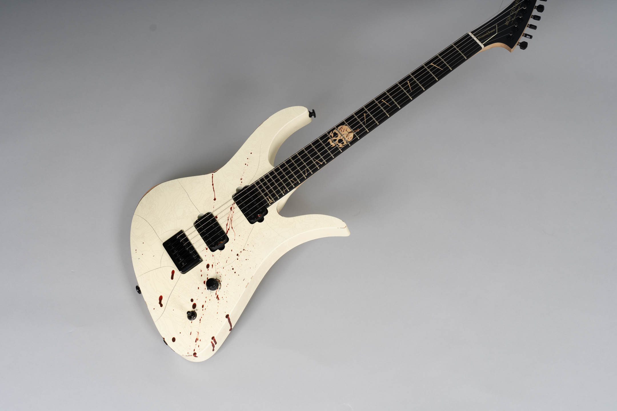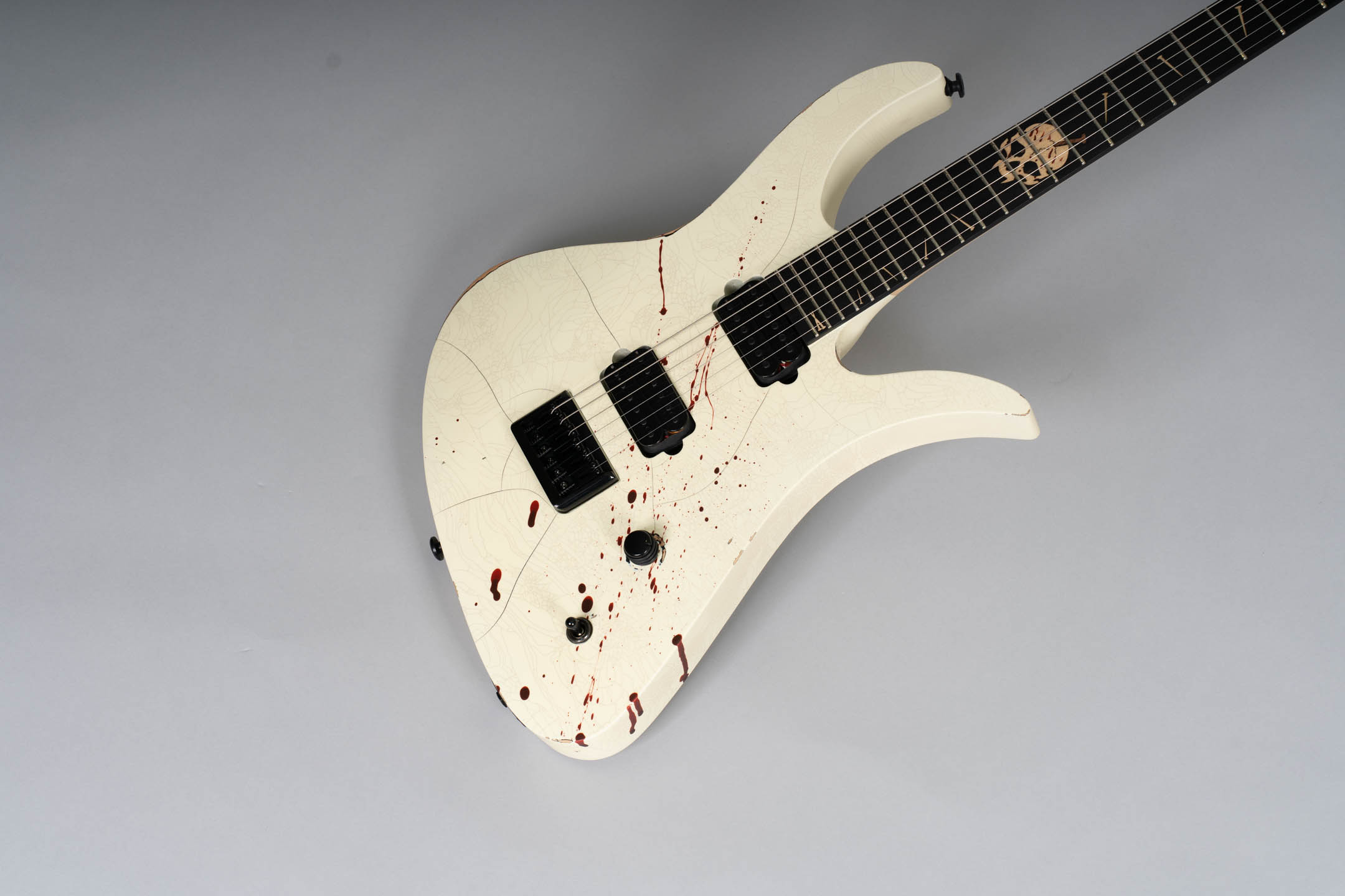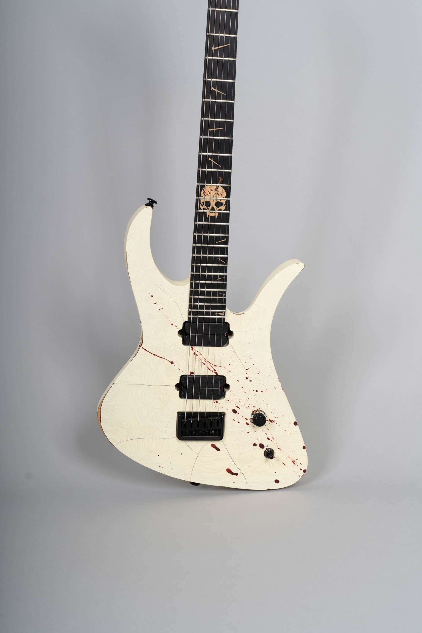 Die MGH-Guitars Blizzard Beast ist ein echtes Biest unter den Metal-Gitarren – kompromisslos im Sound, markant im Design und gebaut für die Bühne. Der aggressiv konturierte Erlekorpus in gecracktem Off-White Finish mit blutroten Splatter-Akzenten verleiht der Gitarre eine furchtlose Ästhetik. In Kombination mit dem durchgehenden Ahornhals garantiert diese Konstruktion maximales Sustain, direkte Ansprache und eine stabile Spielbasis – ideal für Heavy Riffs, präzise Soli und tiefe Tunings.
