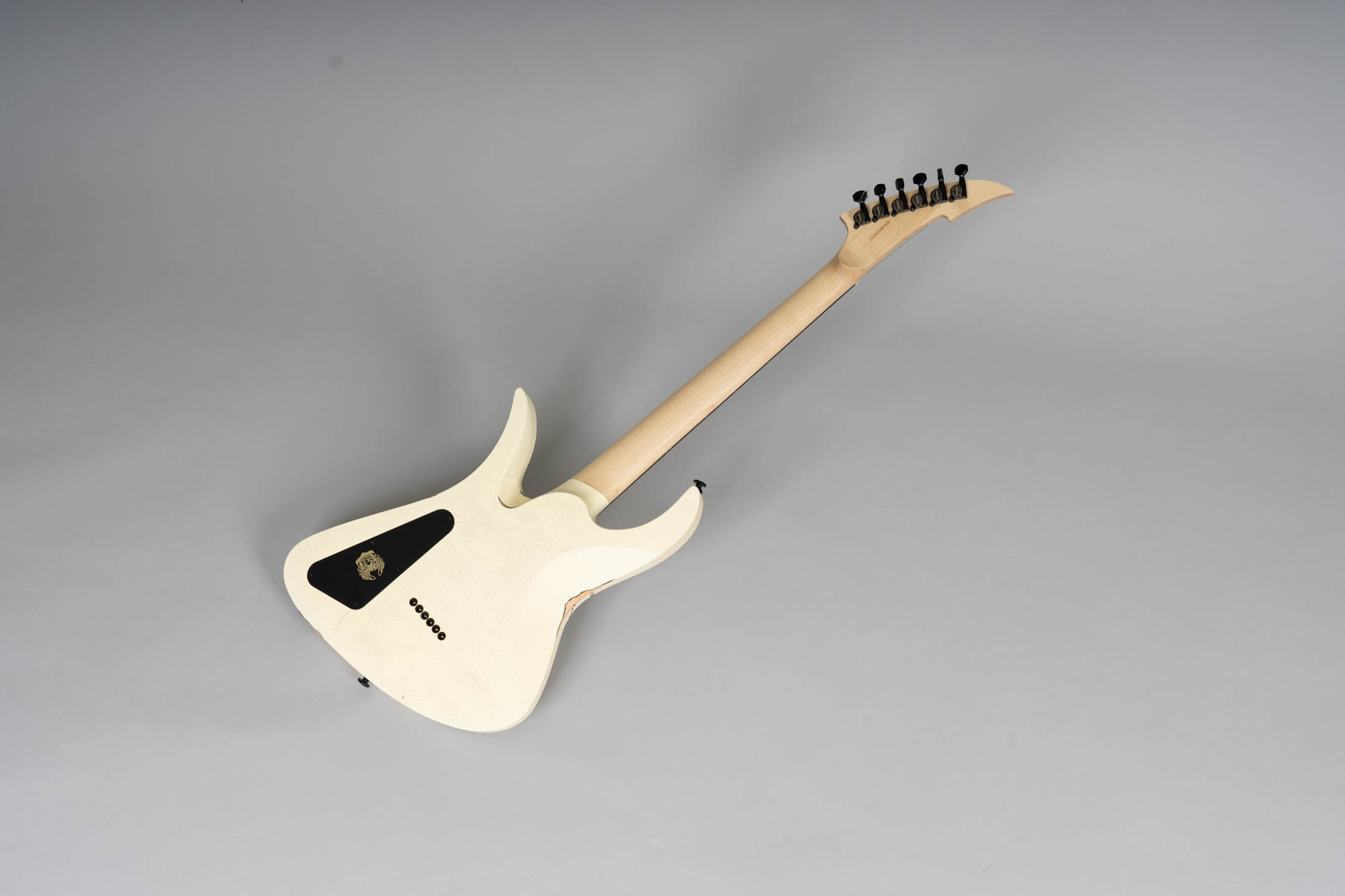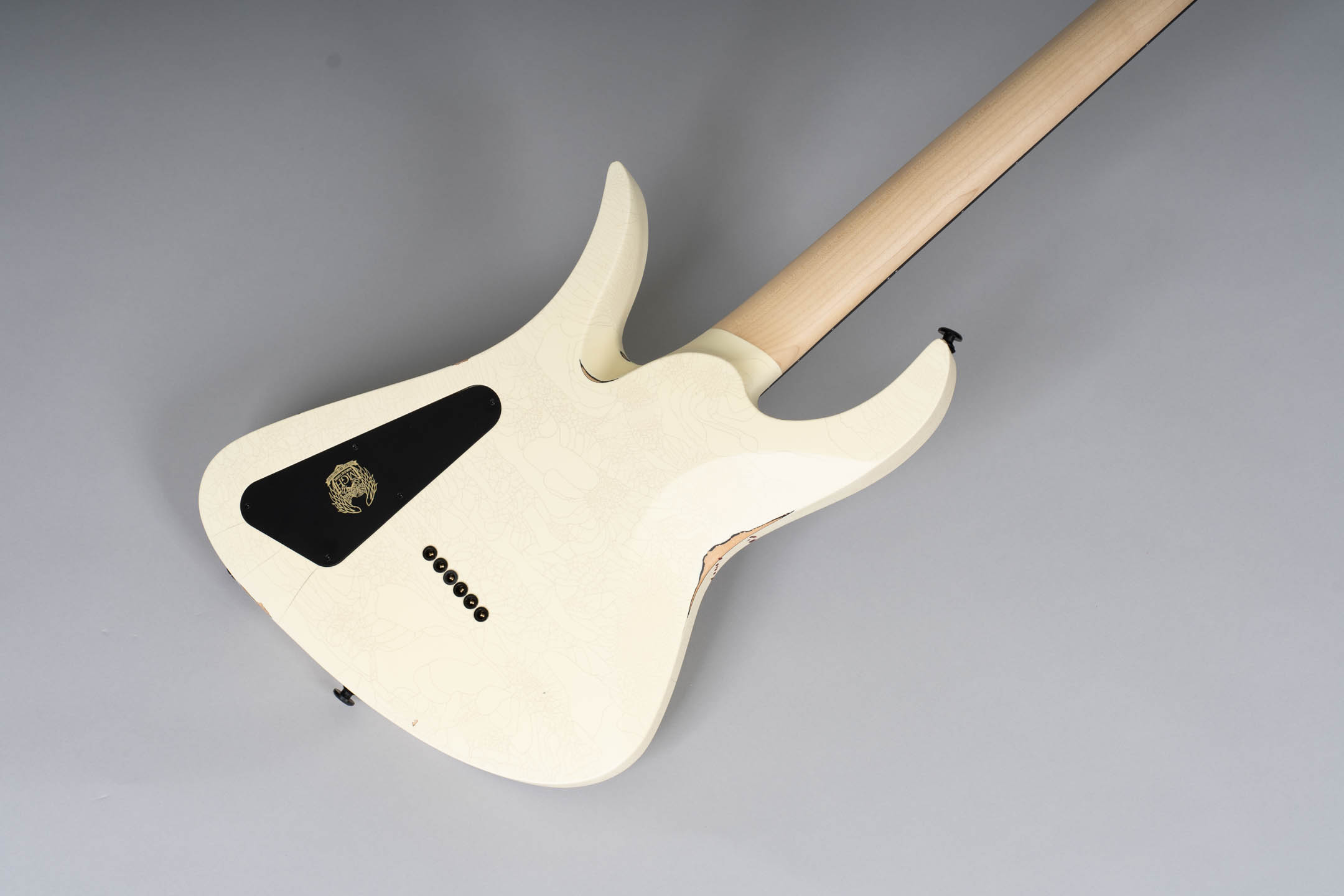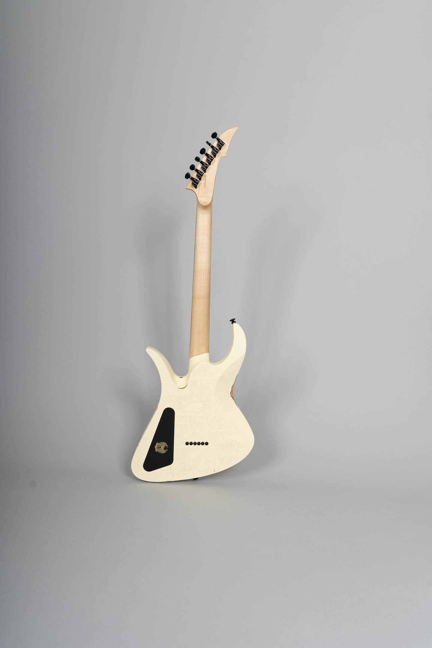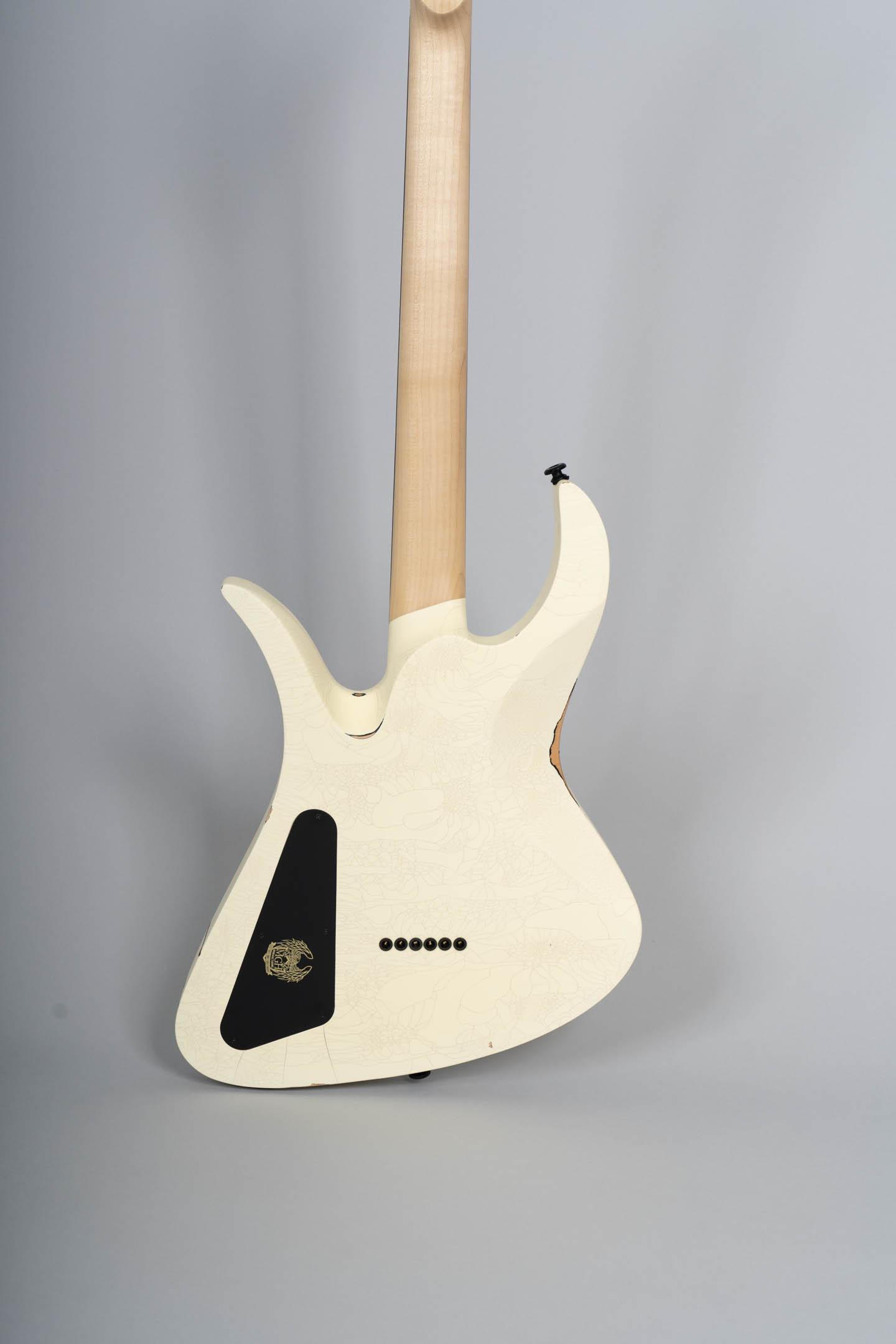 Die MGH-Guitars Blizzard Beast ist ein echtes Biest unter den Metal-Gitarren – kompromisslos im Sound, markant im Design und gebaut für die Bühne. Der aggressiv konturierte Erlekorpus in gecracktem Off-White Finish mit blutroten Splatter-Akzenten verleiht der Gitarre eine furchtlose Ästhetik. In Kombination mit dem durchgehenden Ahornhals garantiert diese Konstruktion maximales Sustain, direkte Ansprache und eine stabile Spielbasis – ideal für Heavy Riffs, präzise Soli und tiefe Tunings.