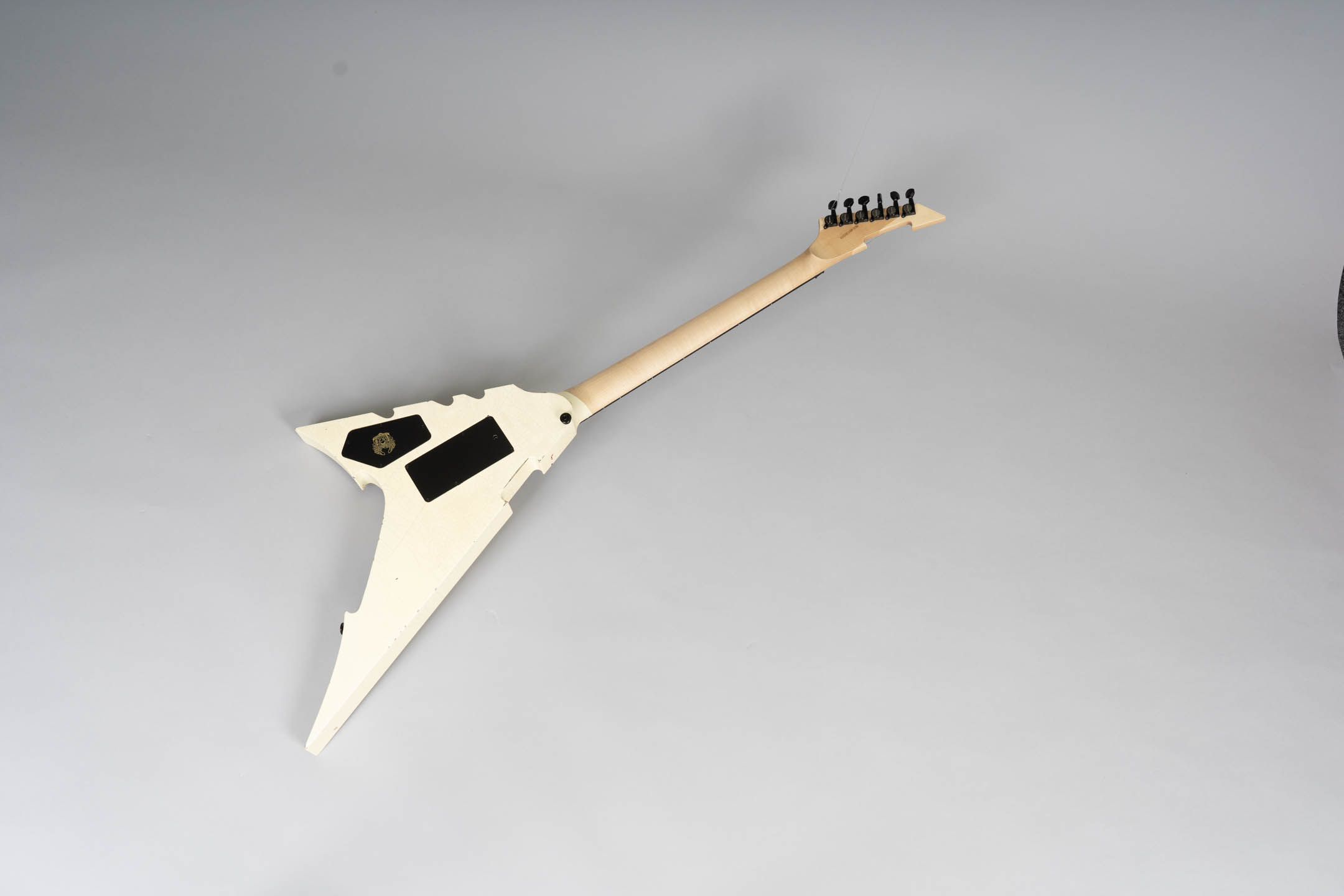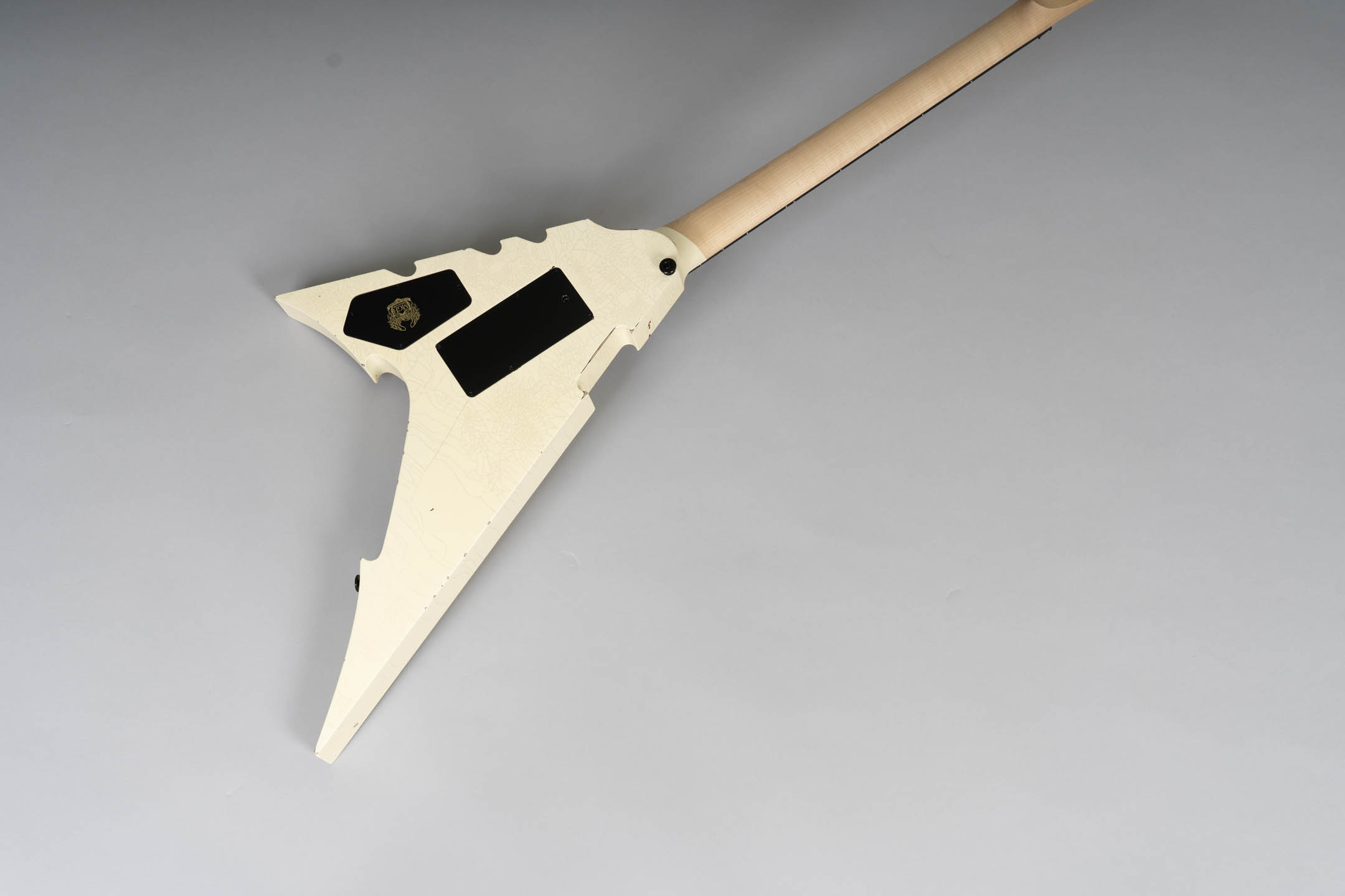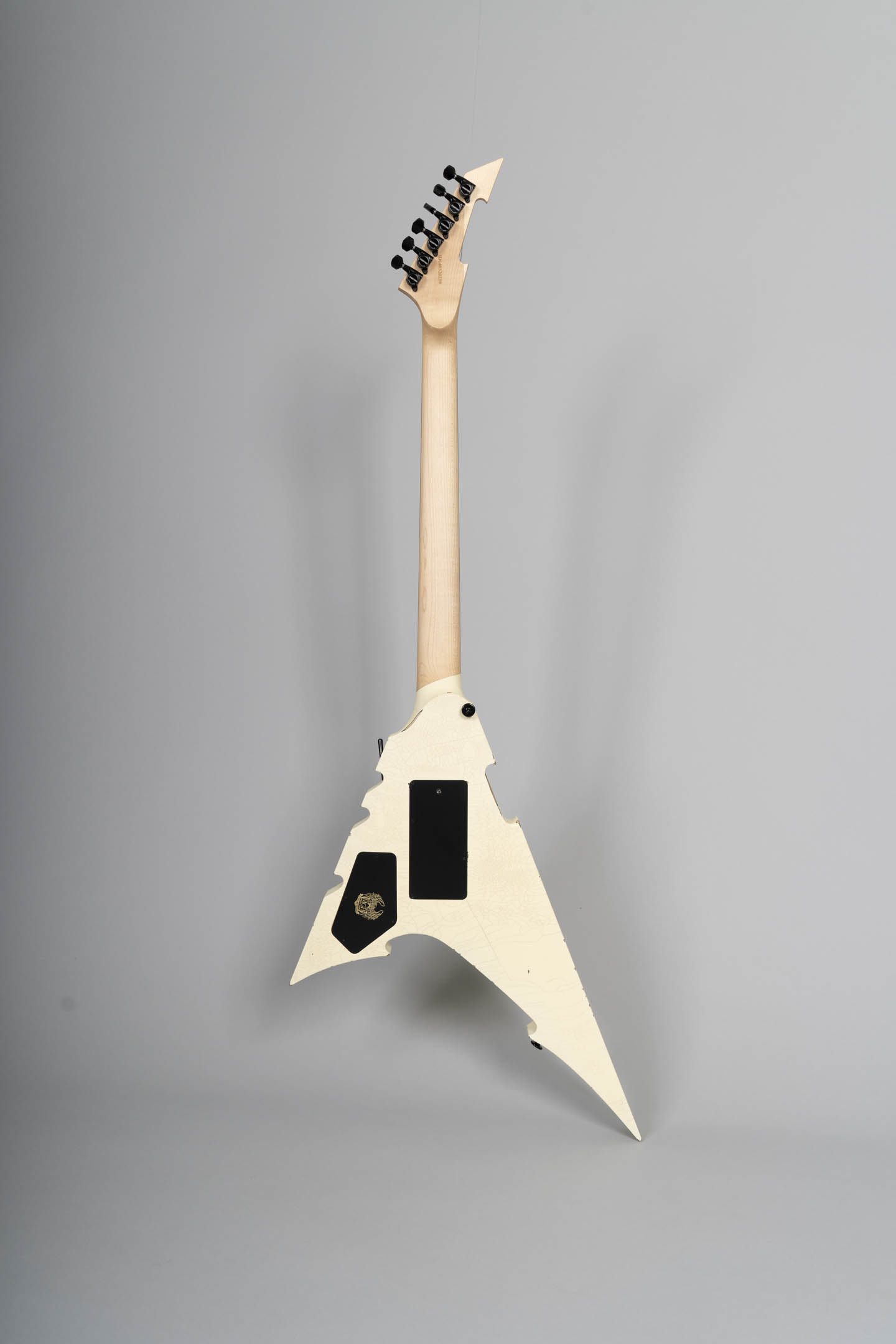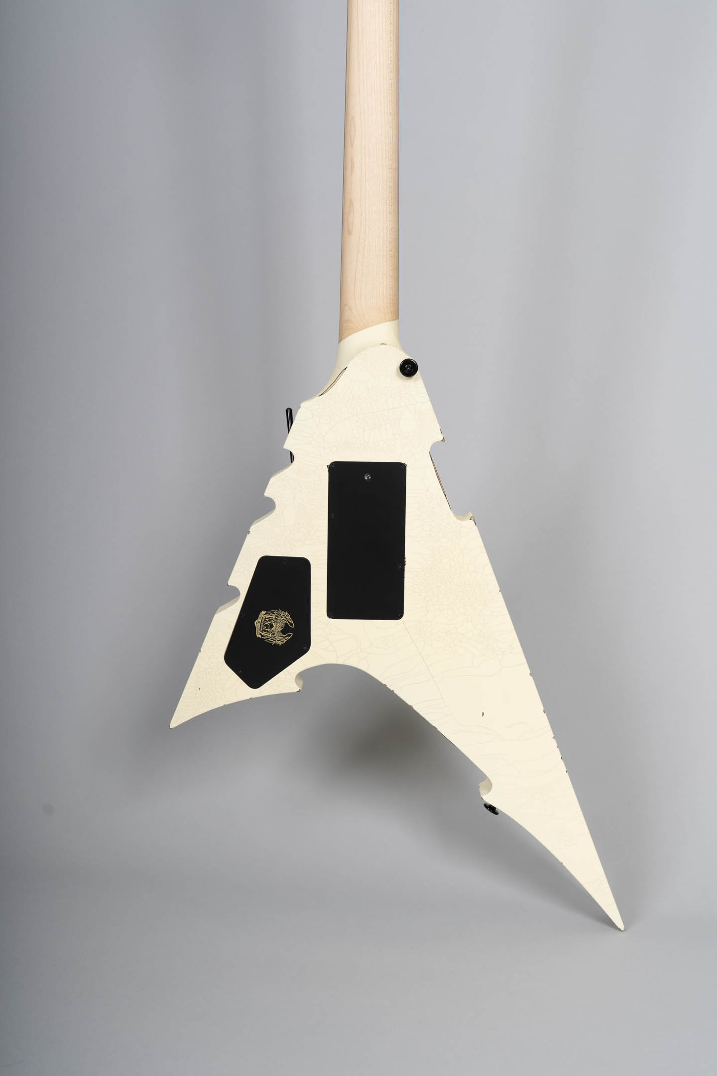 Die MGH-Guitars Demon ist eine kompromisslos radikale Metal-Gitarre – gebaut für maximale Kontrolle, aggressives Spiel und eindrucksvolle Bühnenpräsenz. Das auffällige Design mit kantiger V-Shape, Cracked White Finish und blutroten Splatter-Details macht unmissverständlich klar, wohin die Reise geht: tief gestimmte Riffs, präzise Shreds und pure Energie.