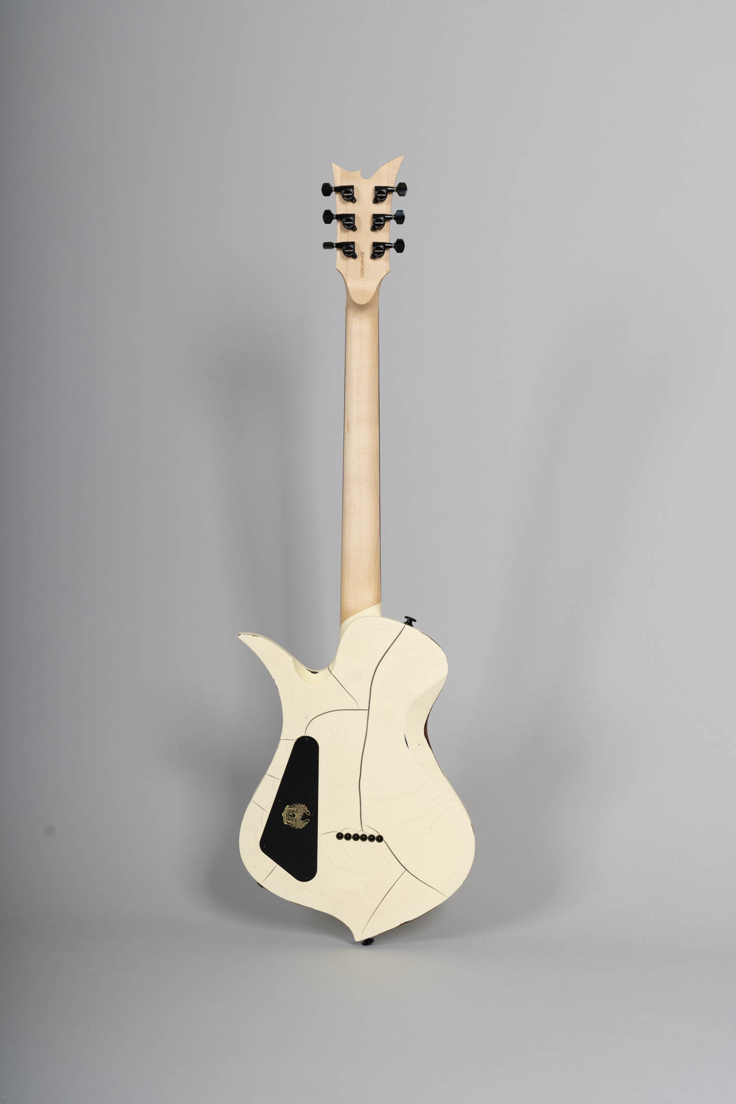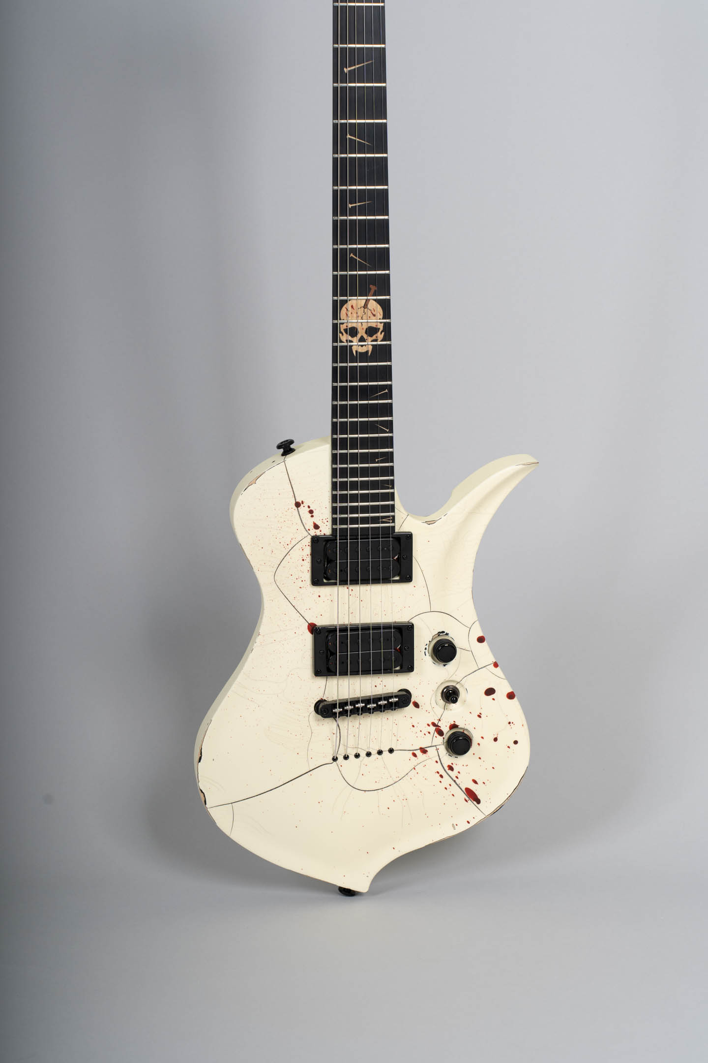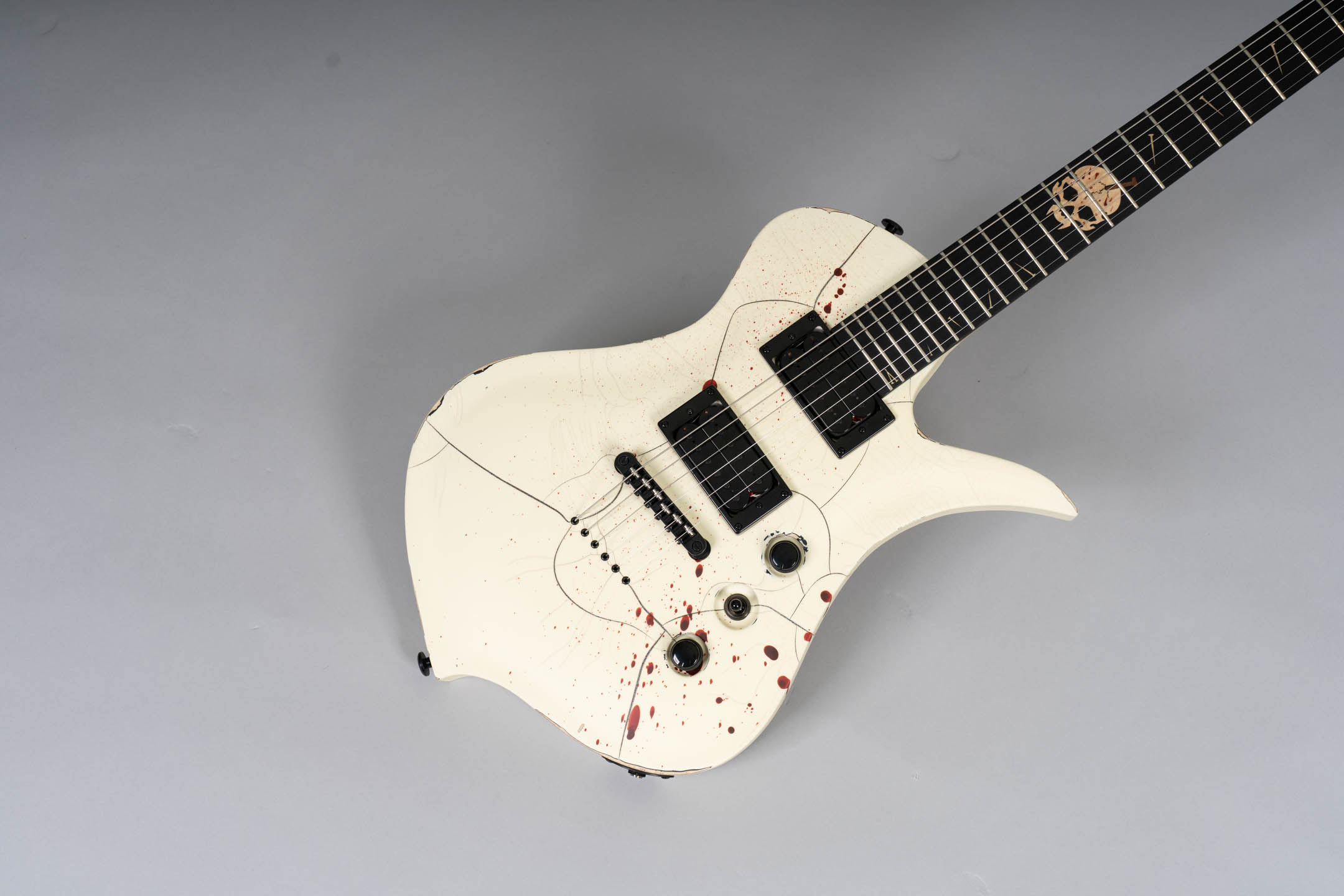 Die MGH-Guitars Ellevar vereint modernes Metal-Design mit traditionellem Singlecut-Charakter und liefert dabei kompromisslosen Ton, makellose Verarbeitung und ein auffälliges Erscheinungsbild. Die außergewöhnliche Korpusform kombiniert klassische Eleganz mit aggressiver Linienführung – perfekt in Szene gesetzt durch das Cracked White Finish mit blutroten Splatter-Akzenten. Die Ellevar ist ein Instrument für Spieler*innen, die in jeder Hinsicht auffallen wollen – optisch wie klanglich.