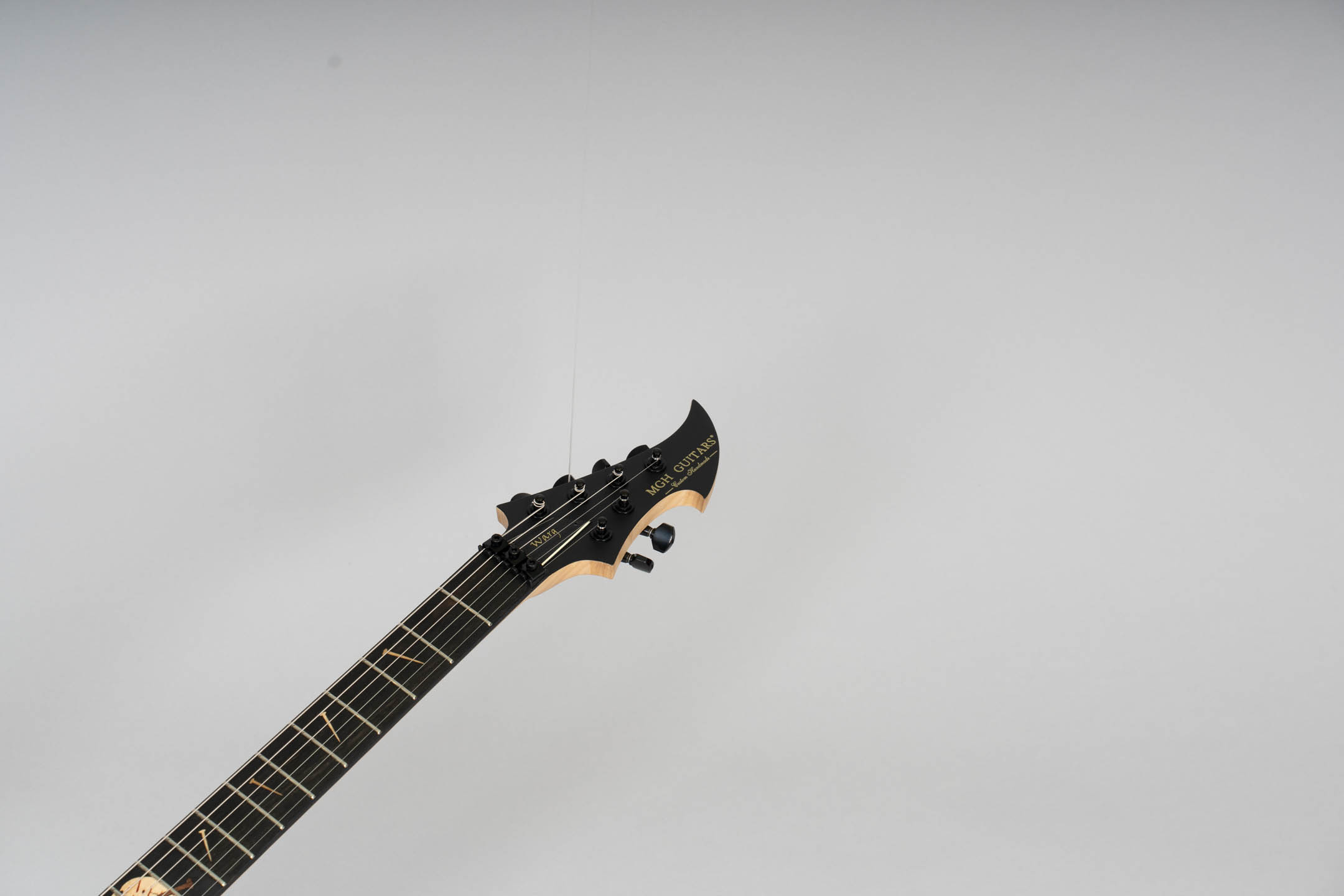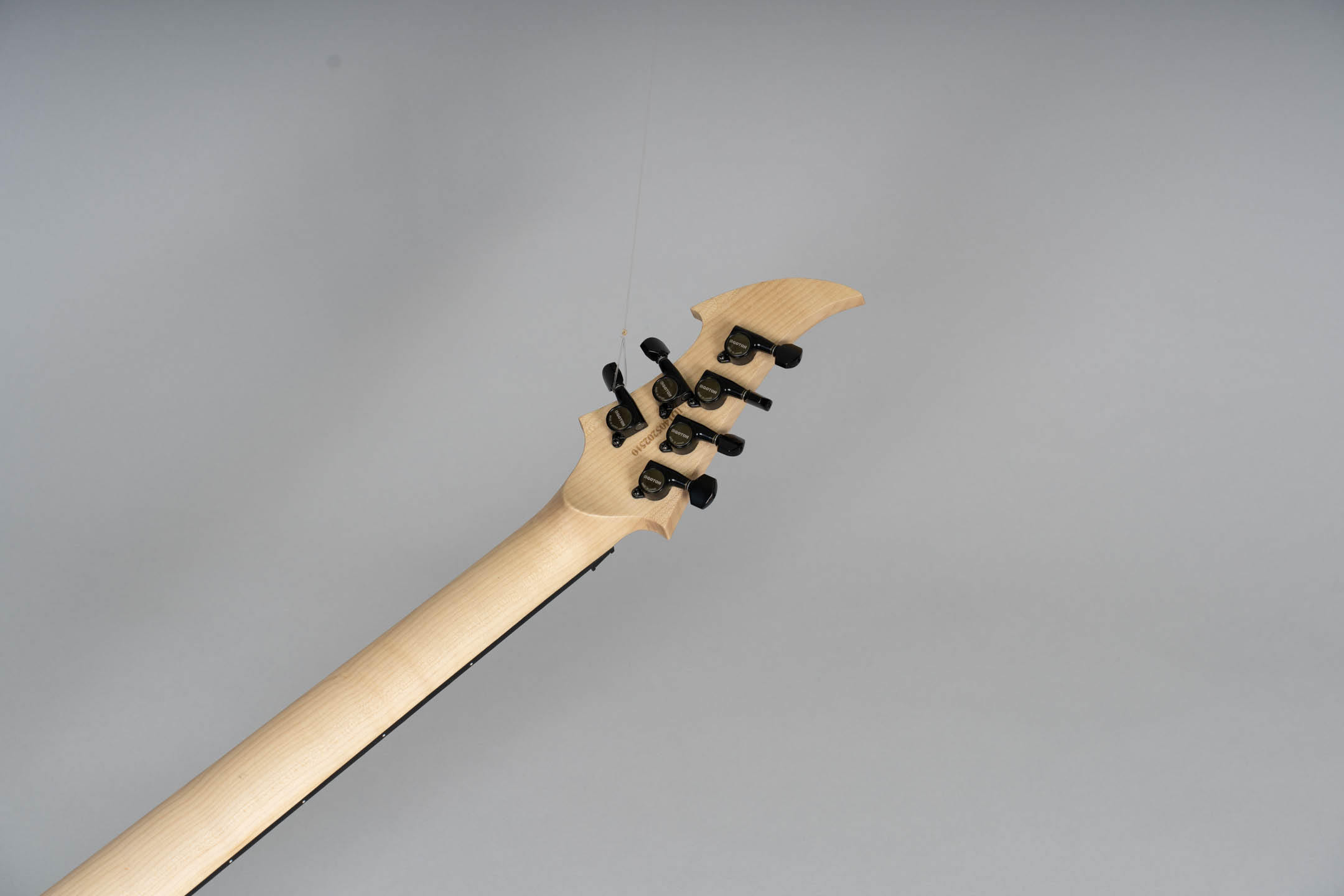 Der Korpus aus Esche liefert einen durchsetzungsstarken, mittigen Ton mit glasklarer Definition. In Kombination mit dem durchgehenden Ahornhals (Neckthrough) entsteht eine stabile Konstruktion mit enormem Sustain und präziser Ansprache. Das Ebenholzgriffbrett mit Skull’n’Nails-Inlays und kontraststarken 2 mm Side Dots bietet eine schnelle Spielfläche mit dunklem Charakter – perfekt für aggressives, schnelles Spiel und kontrollierte Technik.