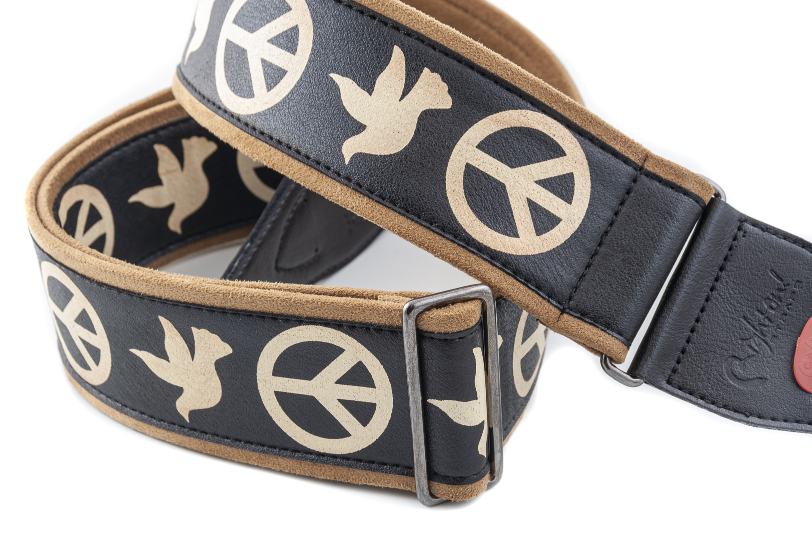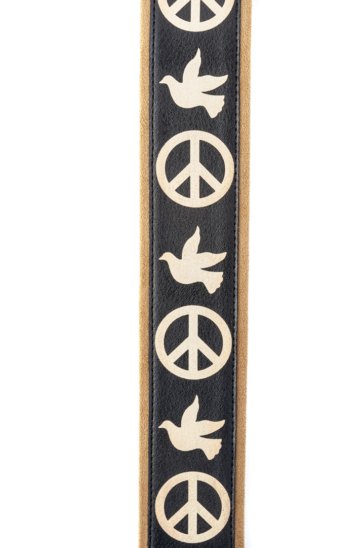 Eine Nachbildung des legendären Gitarrengurts, der von Neil Young verwendet wurde. Hergestellt für Gitarre und Bass, mit einer Breite von 6 cm, verfügt dieser Gurt über rutschfestes Mikrofasergewebe auf der Innenseite und eine Polsterung aus hochdichtem Latex mit einer Dicke von 2 mm. Verziert mit dem Friedenssymbol und der Taube, einem typischen "Hippie"-Design, das den von Neil Young mit seiner berühmten Les Paul verwendeten Gurt kennzeichnet, jedoch in Bezug auf den Komfort verbessert.