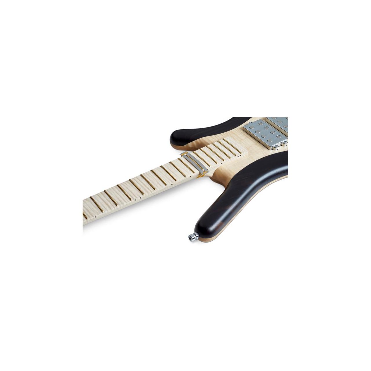 Seine Einbuchtungen an beiden Enden machen das Fixieren am Hals mit den beiliegenden Gummibändern möglich, sodass der Fingerboard Saver während der Bundbearbeitung sicher an Ort und Stelle bleibt und du dich auf die Details der Bundarbeit konzentrieren kannst.