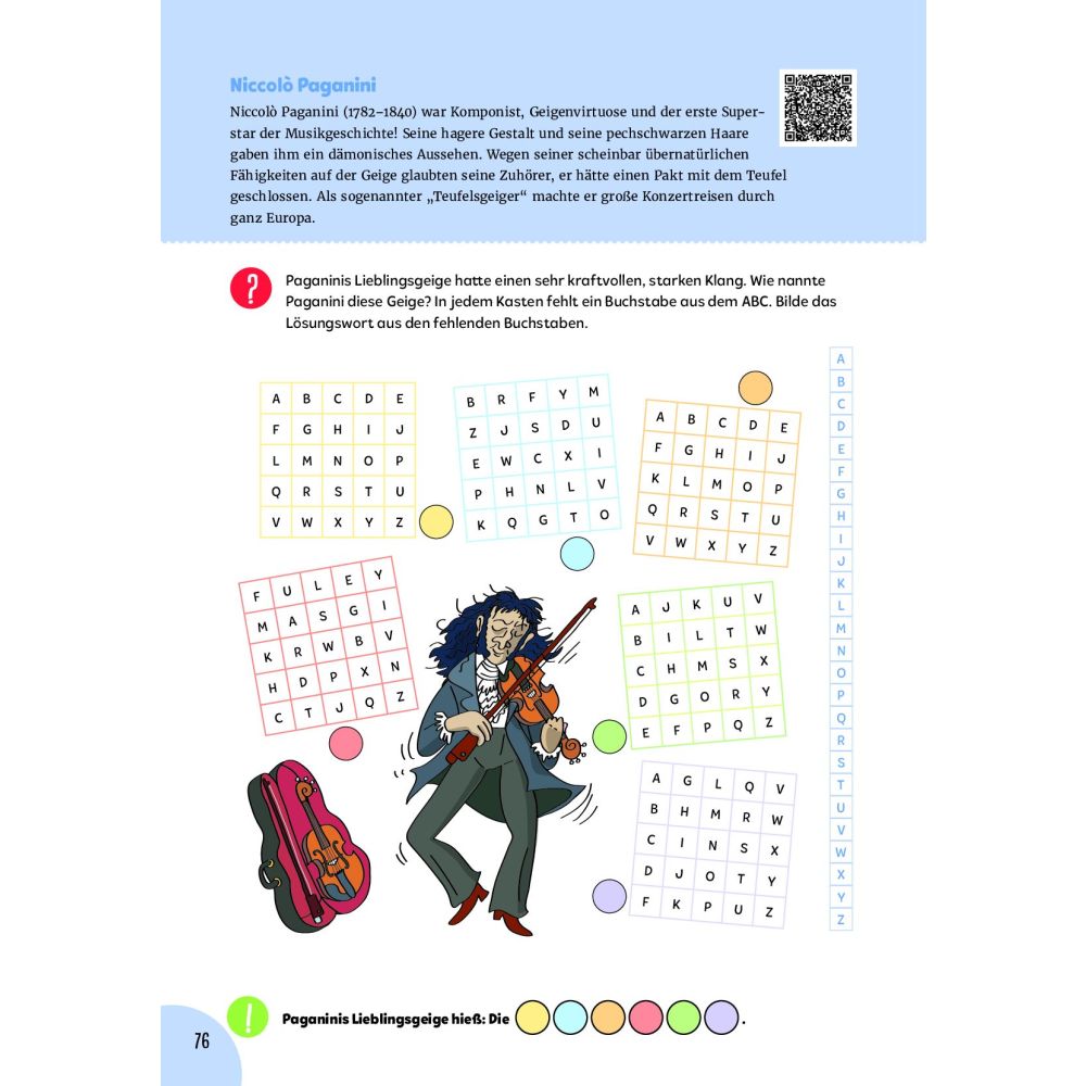 100 Rätsel rund um die Musik! Was hat ein Klavier mit Elefanten zu tun? Wer komponierte die Zauberflöte? Wie funktioniert ein Instrumenten-Domino? Das Mega-Musik-Rätselbuch bietet Suchbilder, Labyrinthe, Wörter-Quadrate, Sudokus und viele Knobeleien zu den verschiedensten musikalischen Themenbereichen und vermittelt so auf spielerische Weise verblüffende Fakten zur Musik. Nach einigen Warm-ups wird tief in die Rätselschublade gegriffen – für Rätsel- und Musikfans ab 6 Jahren.
