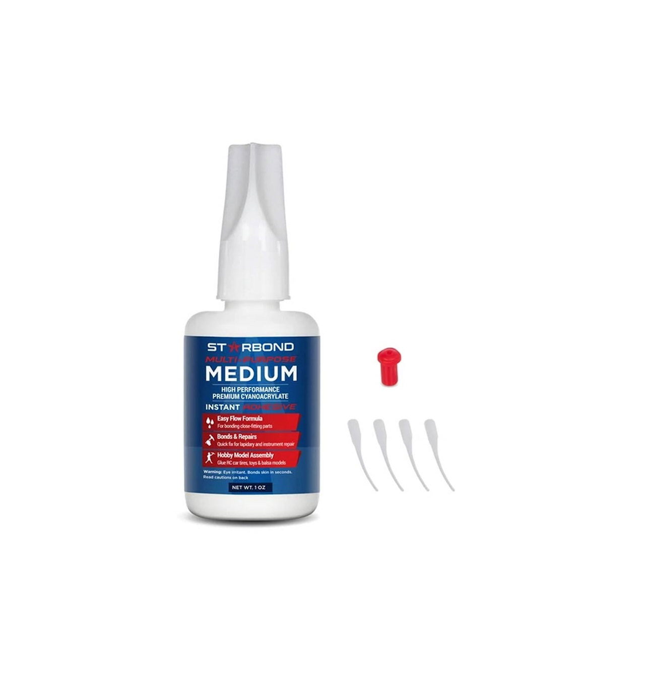 Starbond EM-150 Medium CA Glue ist ein "Mehrzweck"-Ethylcyanacrylat-Superkleber, der eine ölartige Viskosität besitzt. Das bedeutet, dass der mittelviskose Sekundenkleber sowohl die Eigenschaften des dünnen CA als auch des dicken CA besitzt. Starbond EM-150 Medium CA-Kleber kann in enge Schlitze eindringen, eng anliegende Teile kleben, kleine Spalten füllen und hochglänzende Holzoberflächen erzeugen. Ähnlich wie die dünneren CAs wird der Medium CA-Kleber auch als Finish verwendet, indem mehrere Schichten aufgetragen, geschliffen und dann auf Hochglanz poliert werden. Starbond EM-150 Medium CA wird im Hobbybereich als Reifenkleber, beim Stiftedrehen zum Verkleben von Stiftrohlingen, beim Drechseln für Holzreparaturen und bei schnellen Reparaturen im Haushalt verwendet.