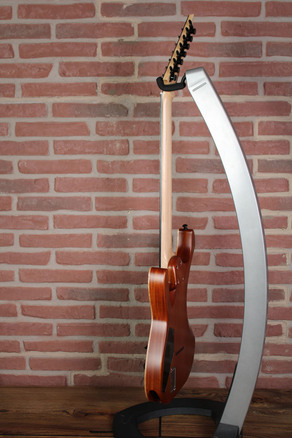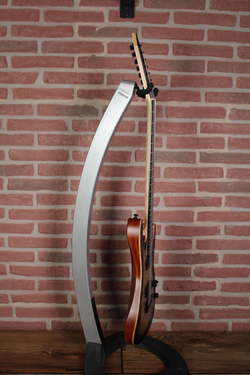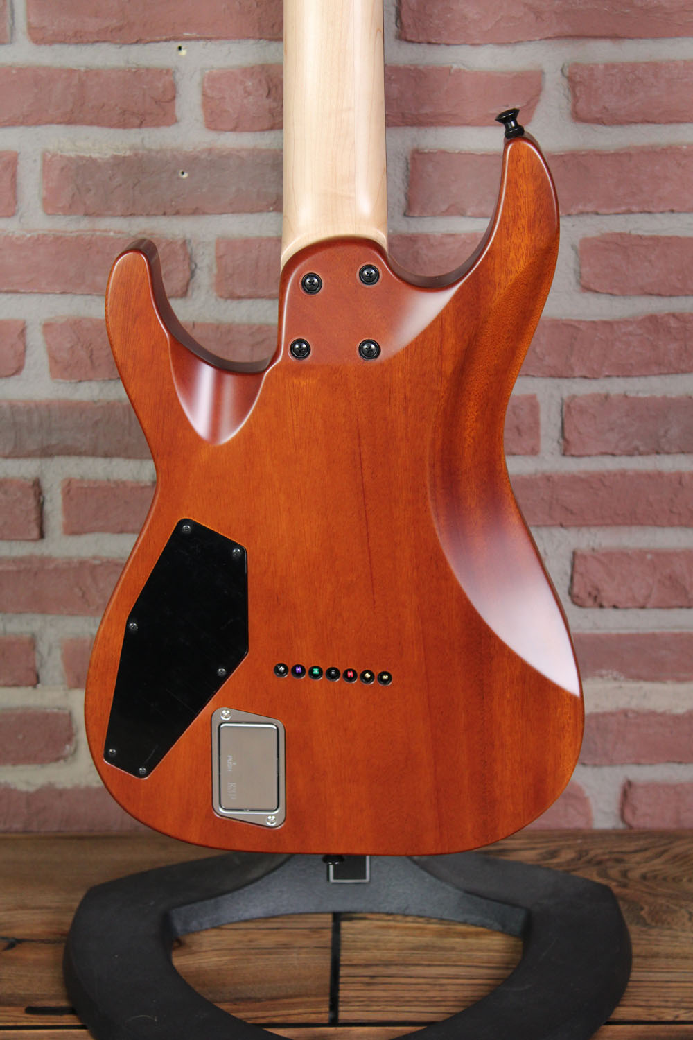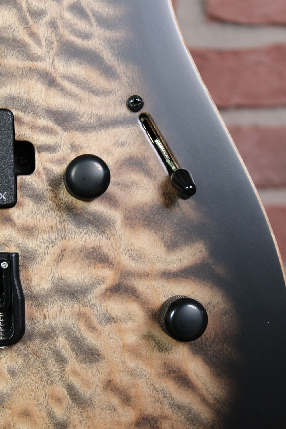 Der Mahagoni-Korpus mit aufwändiger Quilted Maple Decke im See Thru Black Sunburst Satin Finish macht diese Baritone-Gitarre zu einem optischen Highlight. Der durchgehende 3-teilige Ahornhals in Bolt-On Konstruktion sorgt für höchste Stabilität, präzise Ansprache und ein schnelles Spielgefühl. Mit einer Mensur von 27 Zoll ist die M-7 perfekt auf tiefe Tunings ausgelegt – ideal für modernen Metal, Djent und Progressive-Spielstile.