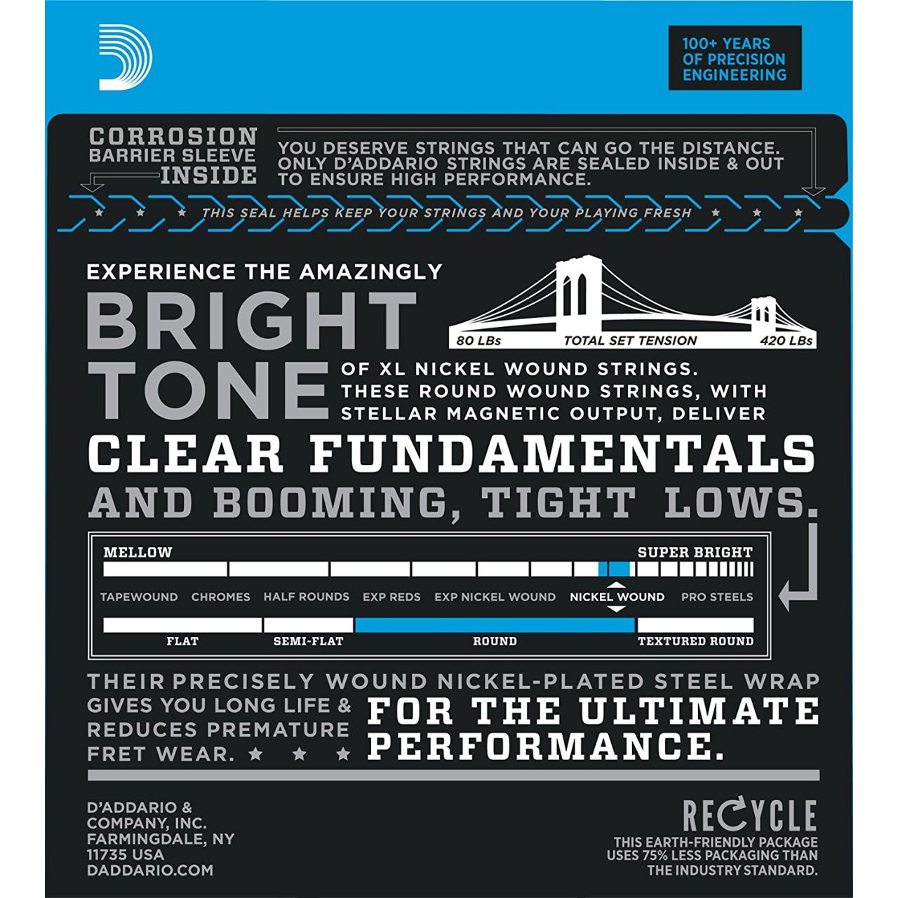 EXL160, der meistverkaufte Basssaitensatz mit dickeren Stärken von D'Addario, bietet die ideale Kombination insgesamt starker Grundtöne mit markanter Helligkeit und kräftigen, präzisen Bässen. Passend für Short-Scale-Bässe mit einer Skalenlänge von bis zu 32 Zoll (81,28 cm) und ist eine gute Wahl für Spieler, die nach unten stimmen wollen.