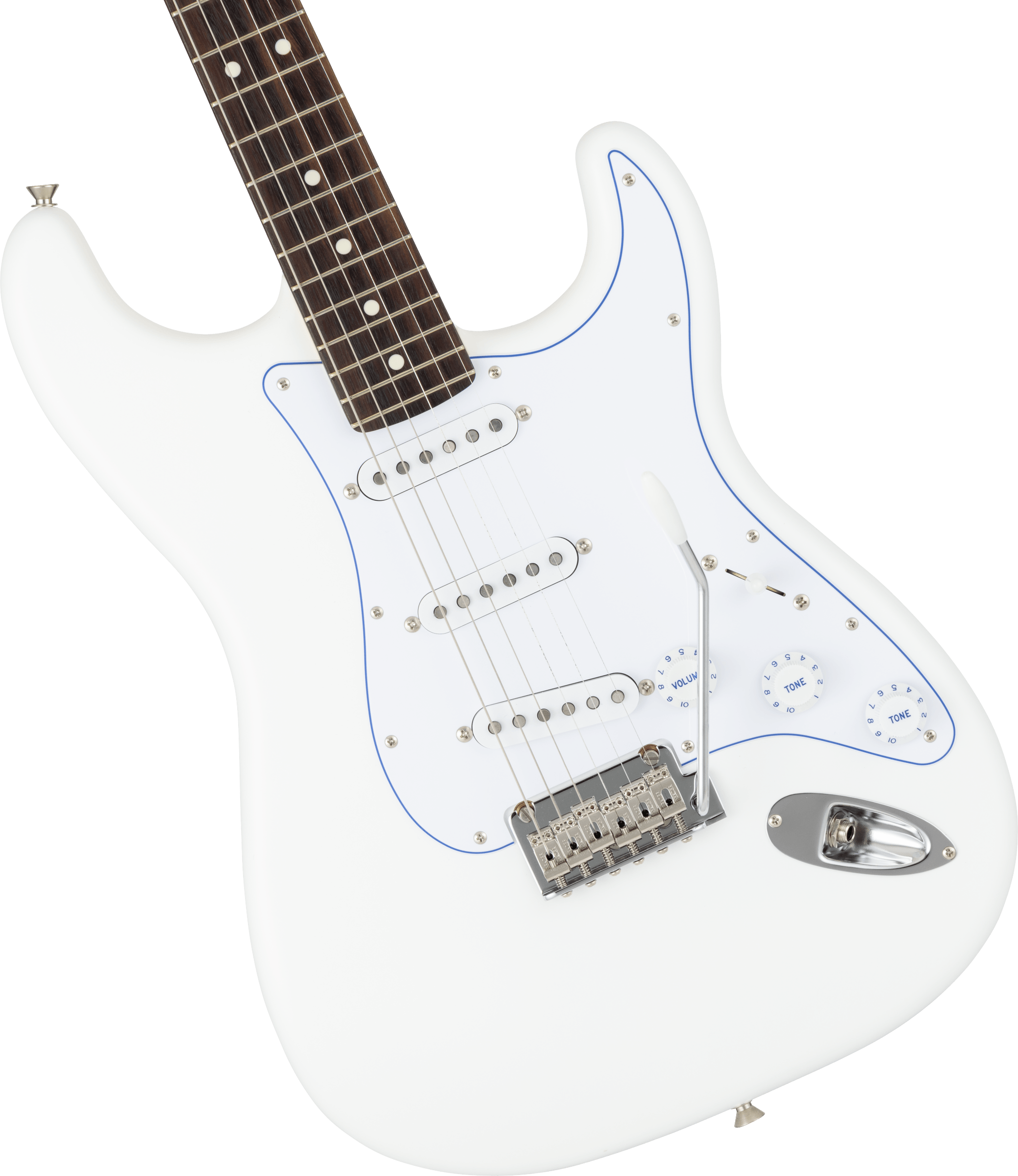 - Farbe: White mit blauen Akzenten (Pickguard & Logo)