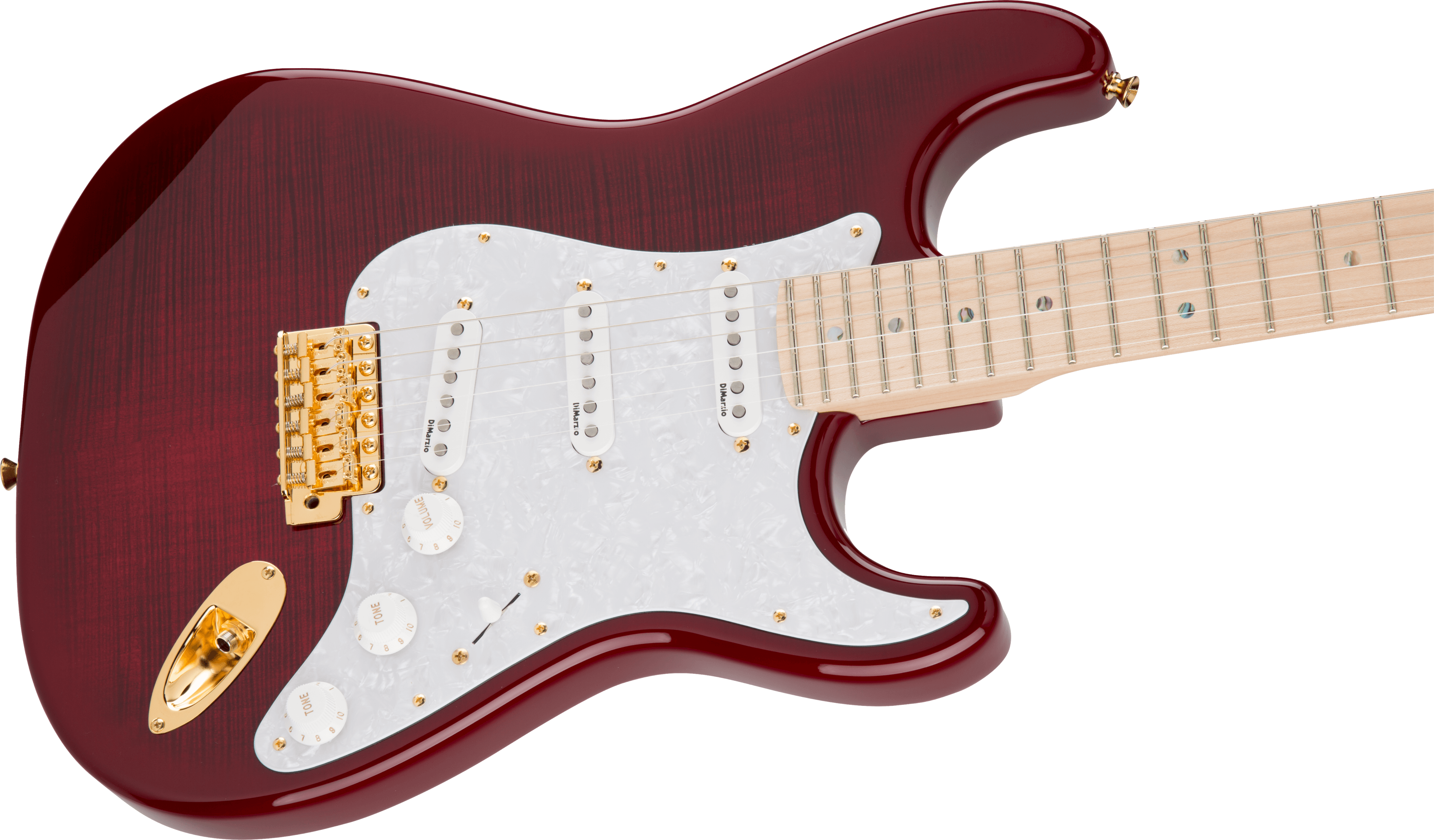 Das kräftige „Thick C“-Halsprofil aus Ahorn mit 12″ Radius und 22 Jumbo-Bünden bietet ein komfortables Spielgefühl, ideal für schnelle Läufe und kraftvolle Bendings. Drei speziell abgestimmte DiMarzio® Pickups liefern vielseitige Sounds – von glasklaren Cleans bis hin zu satten Leads mit enormer Dynamik. Abgerundet wird das Modell durch goldene Hardware, ein Vintage-Style Tremolo und hochwertige Gotoh® Tuner, die für hervorragende Stimmstabilität sorgen.