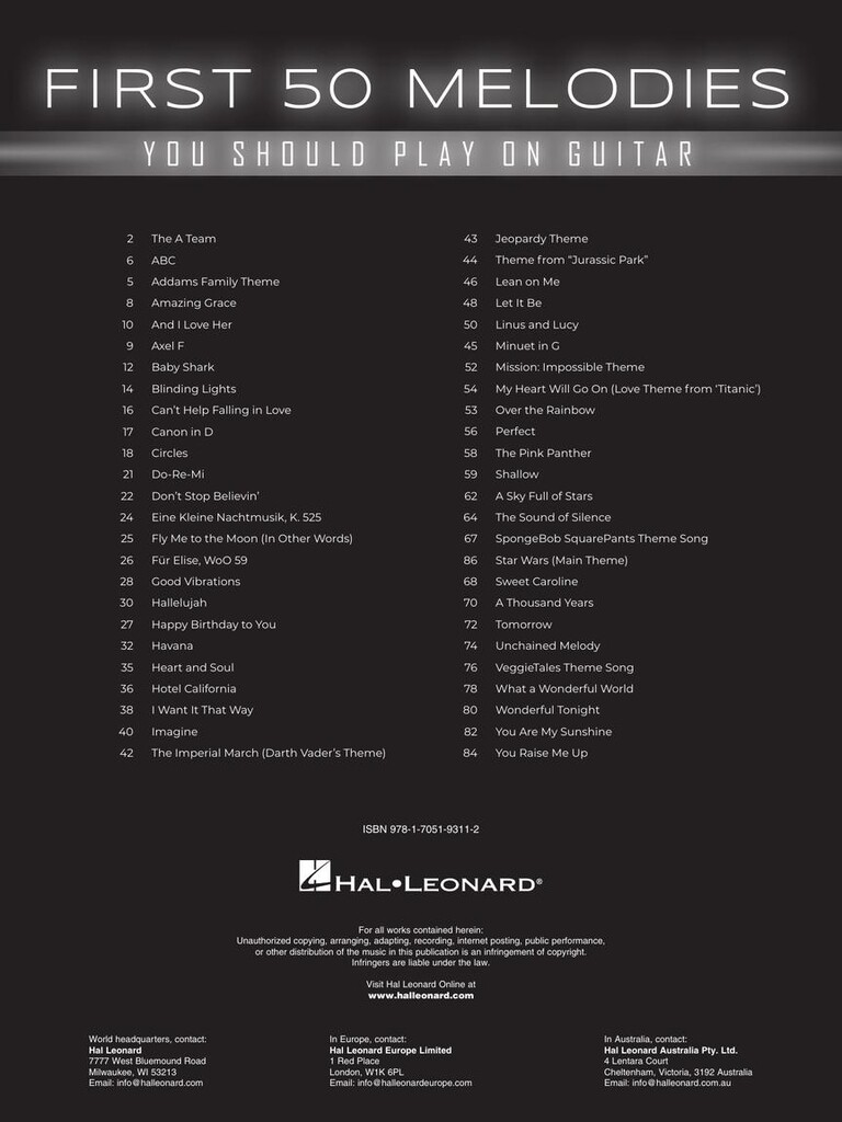Wenn Sie angefangen haben, Gitarre zu spielen, sind Sie wahrscheinlich begierig darauf, einige Lieder zu lernen. Dieses Buch bietet eine zugängliche Kombination aus Akkorden, Standardnotation und Texten für 50 der einprägsamsten Melodien, die jeder Gitarrist kennen sollte! Die Lieder umfassen: Blinding Lights - Can't Help Falling in Love - Canon in D - Don't Stop Believin' - Fur Elise, WoO 59 - Good Vibrations - Hallelujah - Hotel California - Imagine - Jeopardy Theme - Lean on Me - Let It Be - Over the Rainbow - Perfect - A Sky Full of Stars - Star Wars (Main Theme) - Sweet Caroline - What a Wonderful World - You Are My Sunshine - und mehr.