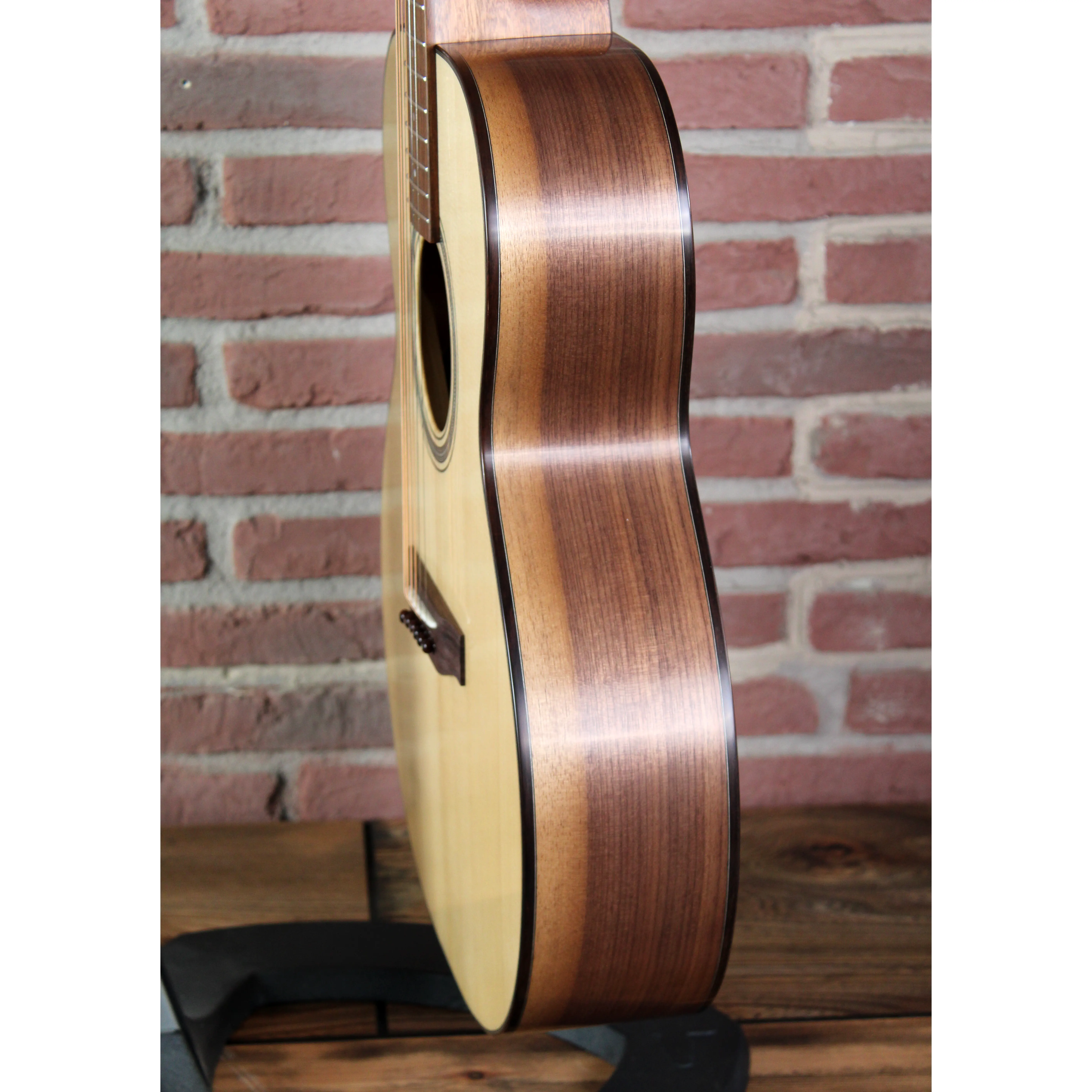 Die massive Fichtendecke sorgt für eine brillante Ansprache und klare Höhen, während Boden und Zargen aus massivem Walnuss dem Ton Wärme, Tiefe und charaktervolle Obertöne verleihen. Der Mahagonihals mit Standardprofil liegt angenehm in der Hand und garantiert in Verbindung mit dem Palisandergriffbrett eine geschmeidige Spielbarkeit über alle Lagen hinweg. Die Grand Auditorium Bauform liefert dabei eine perfekte Balance aus Volumen, Klarheit und Komfort – ideal für vielseitige Musiker, die sowohl im Studio als auch live eine verlässliche Begleiterin suchen.