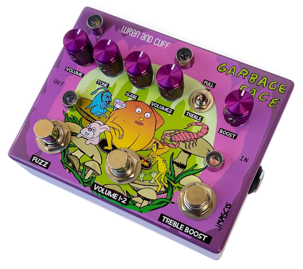J Mascis ist in jeder Hinsicht eine echte Gitarrenlegende und seine Band Dinosaur Jr. beeinflusste viele der Bands, die den Sound der 90er prägten - Bands wie Nirvana, Sonic Youth, Mudhoney und zu viele andere, um sie zu zählen. Fragt man fast jede Punk- oder Grunge-Band aus dieser Zeit (und von heute), ob sie von J Mascis gehört haben, und man wird nur verwirrte Blicke ernten, dass man überhaupt fragen muss. Mascis' Verbindung mit dem Big Muff ist als einer der Hauptbausteine des Dinosaur Jr.-Sounds gut dokumentiert. Es ist also verständlich, dass die Muff-Experten von Wren and Cuff anriefen, als die Idee für ein Signature Pedal aufkam. Nach mehr als 2 Jahren Entwicklungsarbeit ist dieses Pedal endlich da. Das Garbage Face ist eine exakte, bin ins kleinste Detail akkurate Nachbildung von Mascis' Nummer 1 Muff Pedal seit 1987 und dabei nicht nur irgendein Ram's Head aus den 70ern - J's Pedal ist ein seltsamer Vogel mit 'falschen' Bauteil-Werten und Komponenten-Werten, die sich im Laufe der fast 50-jährigen Reise weit von den ursprünglichen Werten entfernt haben. Auf der anderen Seite des Pedals befindet sich eine Nachbildung von Js bevorzugtem Germanium Treble Booster, mit dem er den Input des Muffs 'befeuert'. Zwischen den beiden Sektionen befindet sich ein wunderbar einfaches, aber unglaublich nützliches Werkzeug - ein zweiter Lautstärke-Regler mit eigenem Fußschalter, mit dem man zwischen zwei Muff Volume Outputs wählen kann!