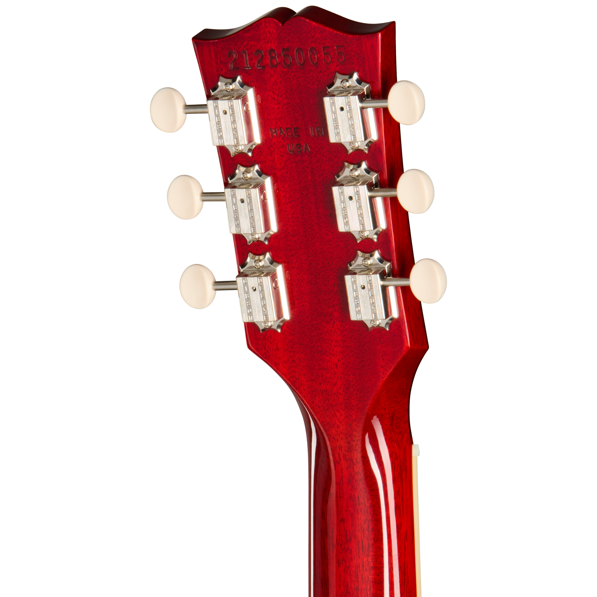Der kräftige 50s-Mahagonihals liegt satt und angenehm in der Hand, während das Palisandergriffbrett mit cremefarbenem Binding für ein klassisches Spielgefühl sorgt. Das warme Vintage Cherry Finish betont die Maserung des Holzes und verleiht der Gitarre eine elegante, traditionelle Anmutung.