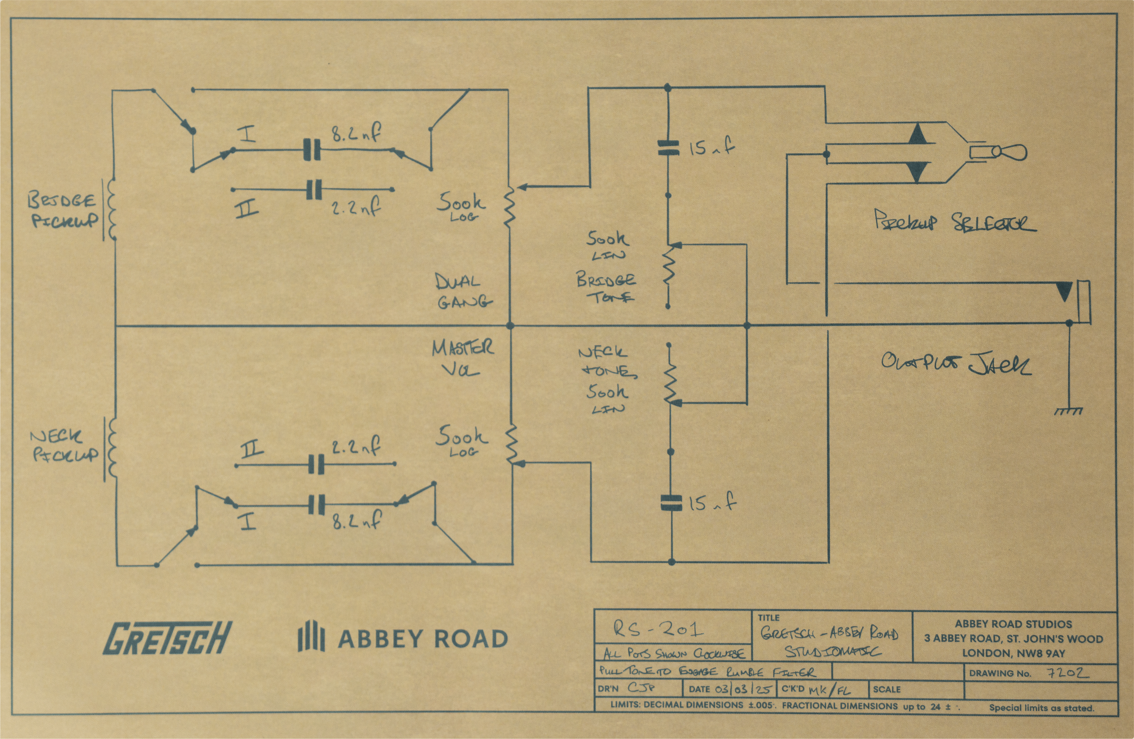 Die Gitarre wird in einem Studio-2-inspirierten burgundy-maronfarbenen Hardcase geliefert – mit himmelblauer Innenauskleidung und historischen Anspielungen auf Abbey Road. Zusätzlich enthalten: ein Pick-Set im Abbey Road Design, ein Abbey Road Klinken-Keyring sowie detaillierte Story Cards mit Schaltplan, EQ-Chart und Hintergrundinformationen zur Entstehung dieser einzigartigen Gitarre.