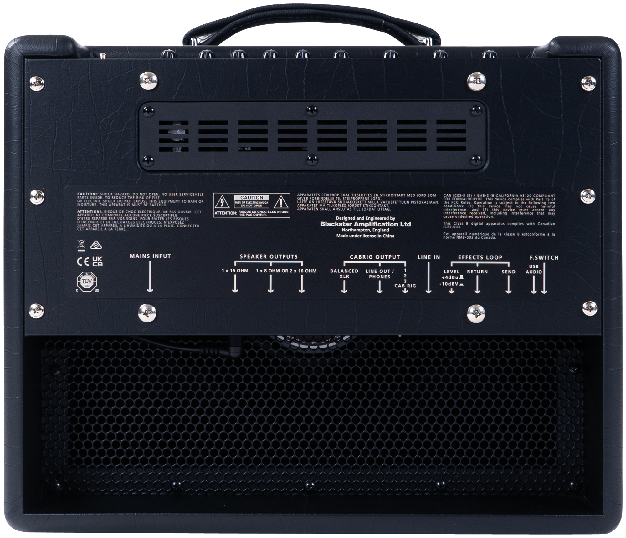 - Schalter: Clean Voice, Overdrive Voice, OD Select, 0,5 / 5 Watt, Cabrig, Effects Loop Level