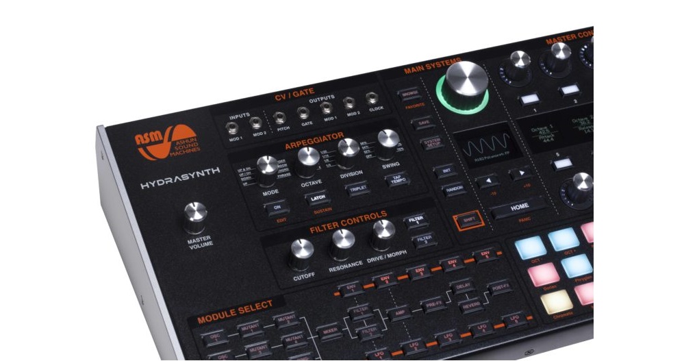 Wenn die Oszillatoren das Herz eines Synthesizers sind, so sind die Filter die Seele: Der achtstimmige, monotimbrale HYDRASYNTH verfügt über zwei unabhängige Filter, die in Reihe oder parallel geschaltet werden können. Filter 1 verfügt über 11 verschiedene Filtermodelle (12, 24 db, HP, LP, Vocal u.a.). Der zweite Multimode-Filter arbeitet mit 12 dB pro Oktave inklusive einem kontinuierlichen Sweep von Tiefpass über Bandpass bis Hochpass, vergleichbar mit klassischen SEM Filtern. Vier Effekte veredeln die umfangreiche Klangerzeugung: Delay und Reverb (inkl. Cloud) sind festgelegt, bei den übrigen Pre- und Post-Effekten kann aus verschiedenen Algorithmen wie z.B. Chorus, Flanger, Rotary, Lo-Fi, Tremolo, Kompressor u.a. gewählt werden.