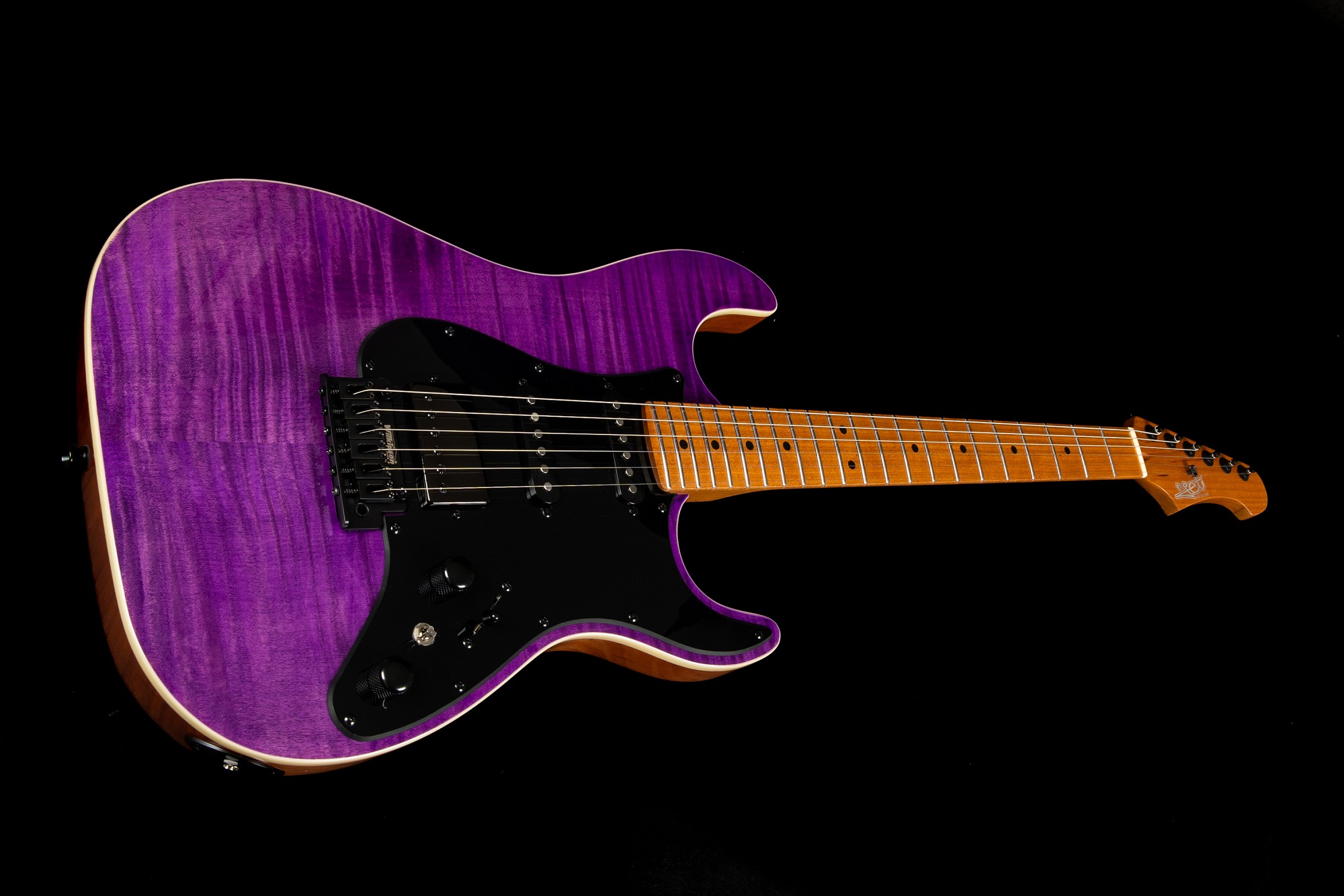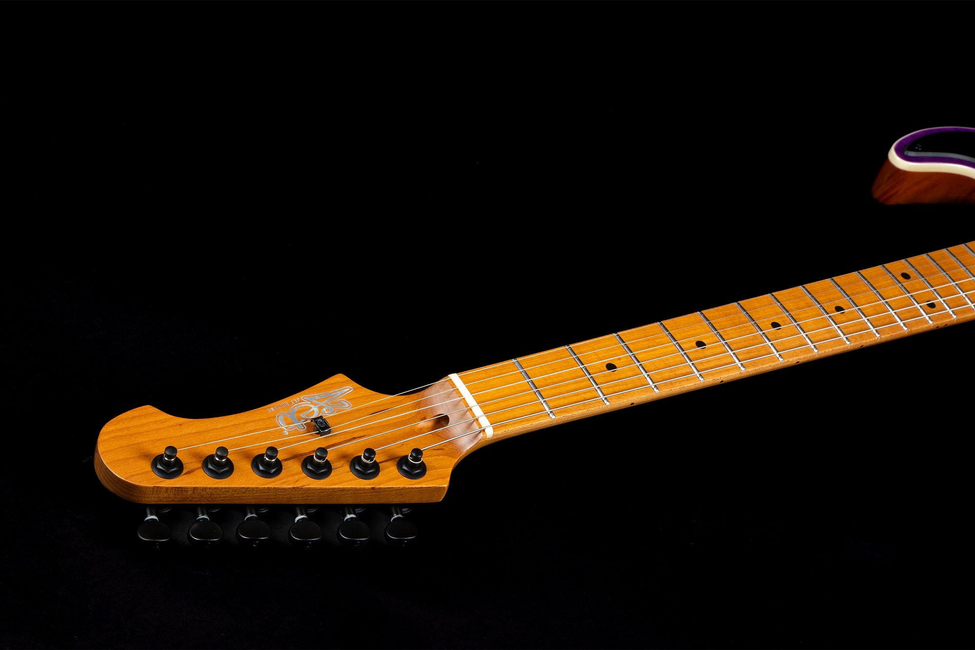 Die JET JS-600 TPP ist eine E-Gitarre, die durch ihre beeindruckende Optik und Vielseitigkeit besticht. Ihr Korpus besteht aus Mahagoni mit einer geflammten Ahorndecke in einem transparenten Violett-Finish, was für einen warmen Klang und ansprechende Ästhetik sorgt. Der kanadische, geröstete Ahornhals mit Modern-C-Profil und das Griffbrett mit 9,5"-Radius bieten ein komfortables Spielgefühl.