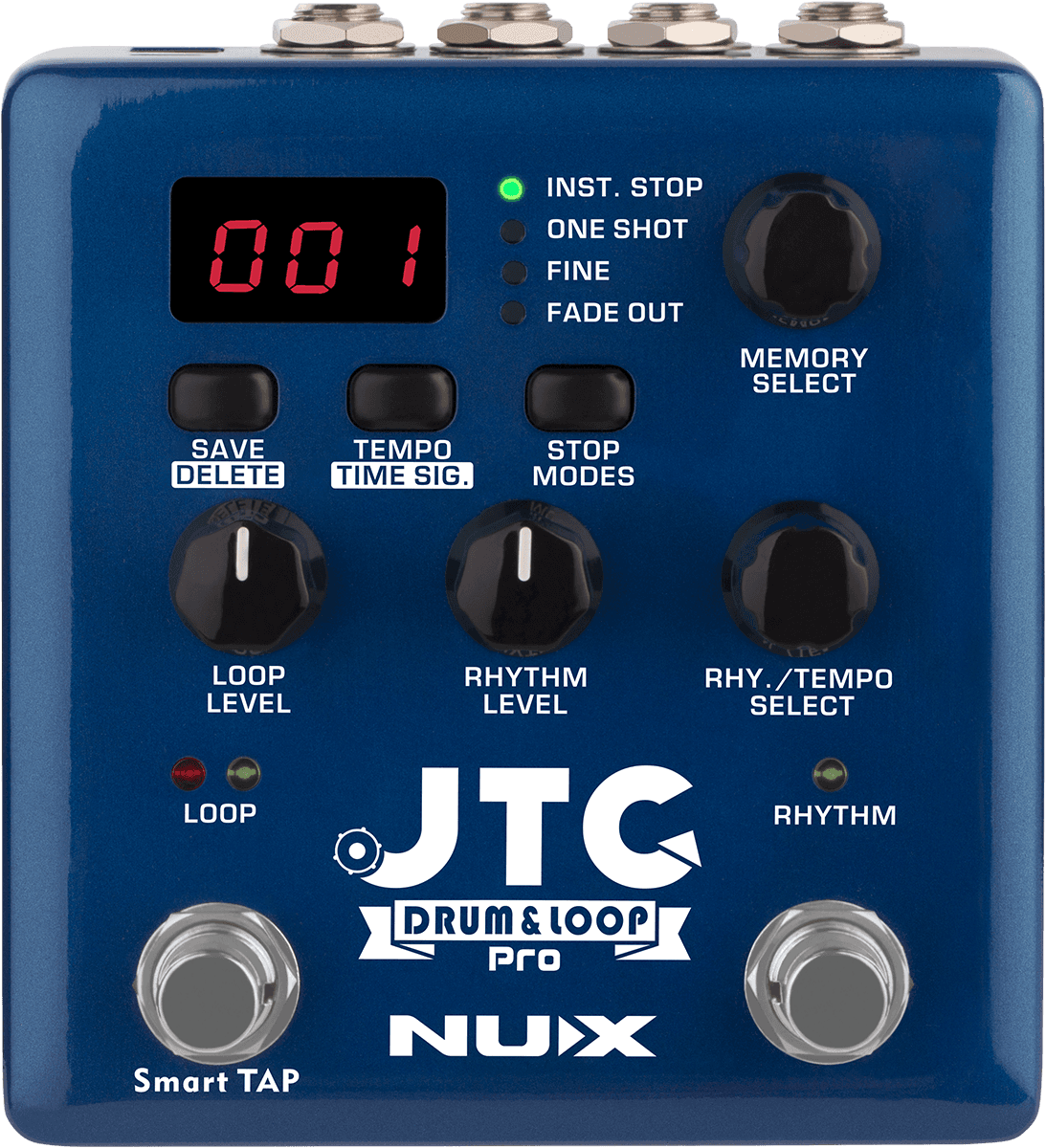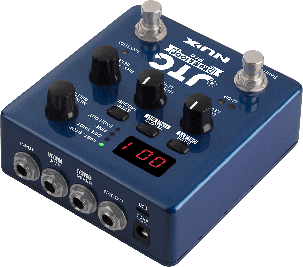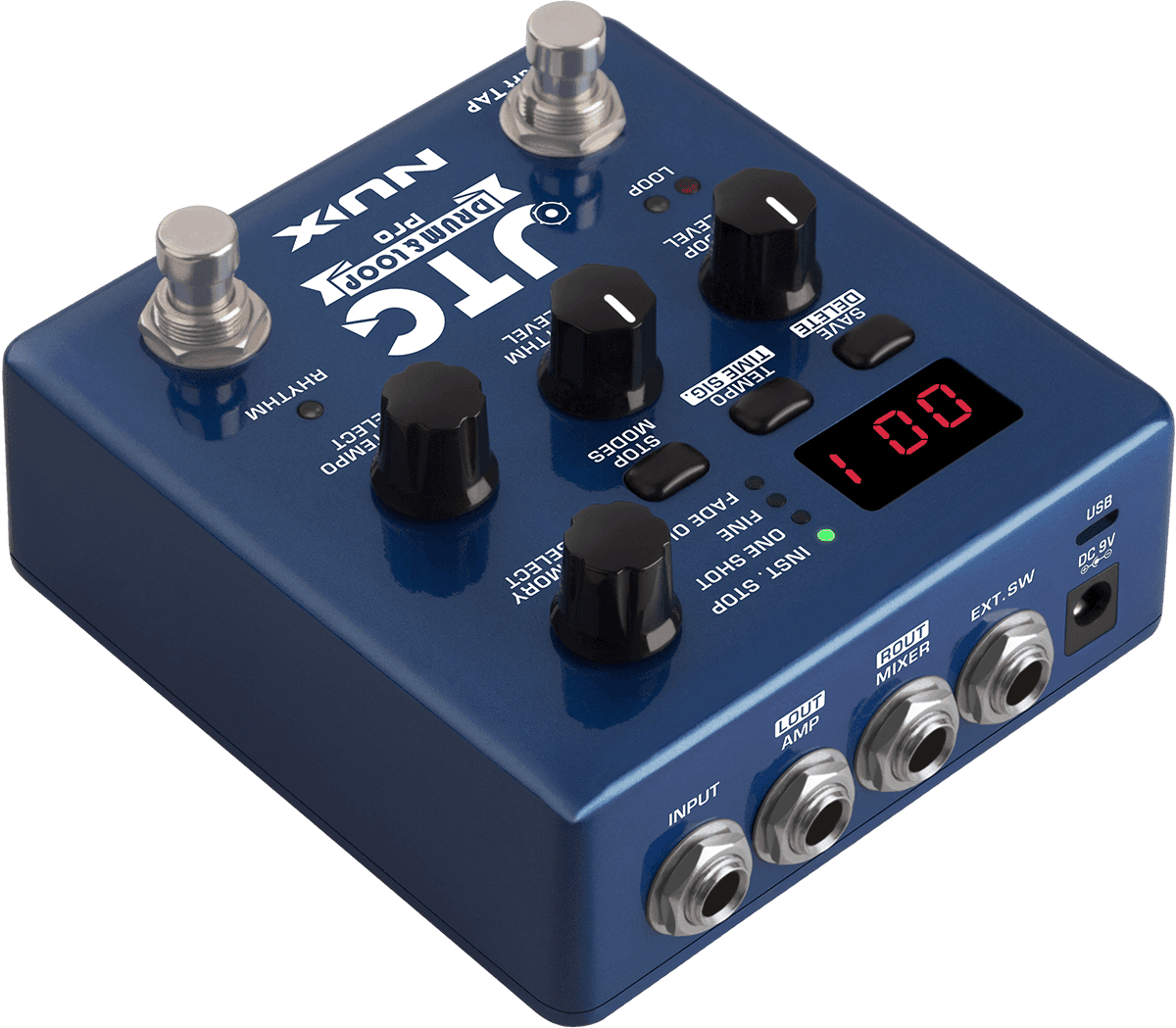 Das JTC Drum & Loop ist ein Zwei-in-Eins-Pedal, das einen Looper und einen umfangreichen Drumcomputer vereint. Der Looper bietet bis zu 6 Stunden Aufnahmekapazität über 256 Speicherplätze. Die Fußsteuerung des Loopers erfolgt über den linken Multifunktionsschalter nach einem bewährten Schema: ein Mal drücken, um die Aufnahme zu starten, ein weiteres Mal drücken, um die Aufnahme zu stoppen und die Wiedergabe zu starten, und ein drittes Mal drücken, um Overdubs aufzunehmen. Durch langes Drücken können Sie die Overdub-Wiedergabe auch stumm schalten und reaktivieren. Ein zweites Funktionsschema, das den Overdub schon beim zweiten Drücken aktiviert, ist ebenfalls verfügbar.