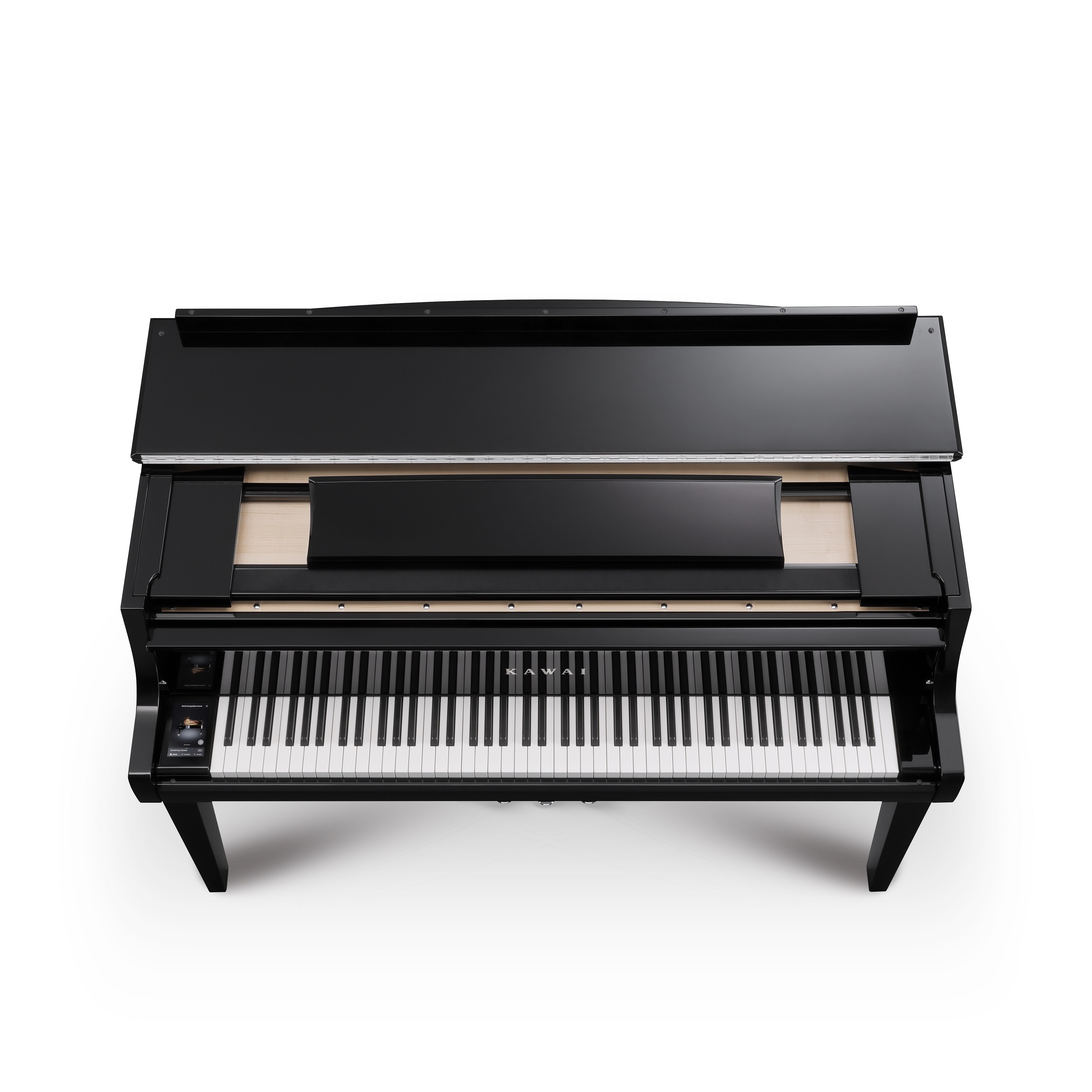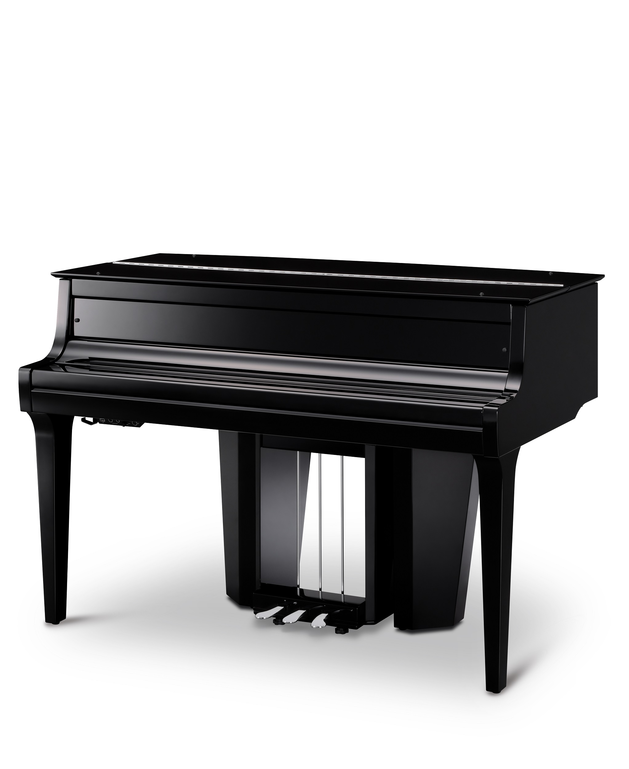 Das größere, tief gewölbte Gehäuse mit dreistufig klappbarem Deckel sorgt für beeindruckende Klangprojektion und eine elegante Erscheinung. Offene Pedalstützen mit polierten Silberpedalstangen unterstreichen das hochwertige Design. Neu hinzugekommen ist ein echtes Konzertflügel-Notenpult, das in Winkel und Position flexibel eingestellt oder ganz entfernt werden kann.