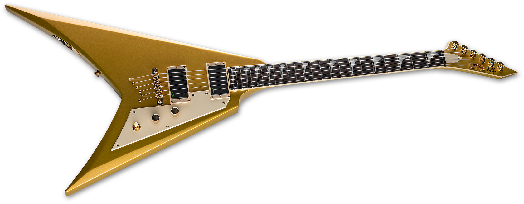 Metallica, zweifelsohne einer der größten Metal Bands weltweit, hat mit ihrem Lead Gitarristen Kirk Hammett in über 40 Jahren Bandgeschichte Generationen von Gitarristen inspiriert. Seit Jahrzehnten setzt Kirk Hammett auf ESP Gitarren und trägt mit seinen Soli maßgeblich zum unverwechselbaren Sound von Metallica bei. Die LTD KH-V ist die neueste Ergänzung von Kirk Hammet’s Signature Serie. Erhältlich in Red Sparkle, Black Sparkle und Metallic Gold, verfügt sie über eine Neck-Thru Konstruktion mit Korina-Flügeln und dreiteiligen Ahornhals mit extra-thin-U Profil, 25.5“ Mensur, 24 Bünden und Ebenholzgriffbrett. Die KH-V ist mit EMG Bone Breaker Pickups ausgestattet, BB-B mit Keramikmagneten an der Bridge und BB-N mit AlNiCo 5 Magneten am Hals, die über eine klassische Regelmimik aus 3-Wege Toggleswitch, einem Volume- und einem Tone-Poti verwaltet werden. Darüber hinaus verfügt die Gitarre über eine TonePros Brücke, String-Thru-Body Saitenaufhängung und LTD Locking Tuner.