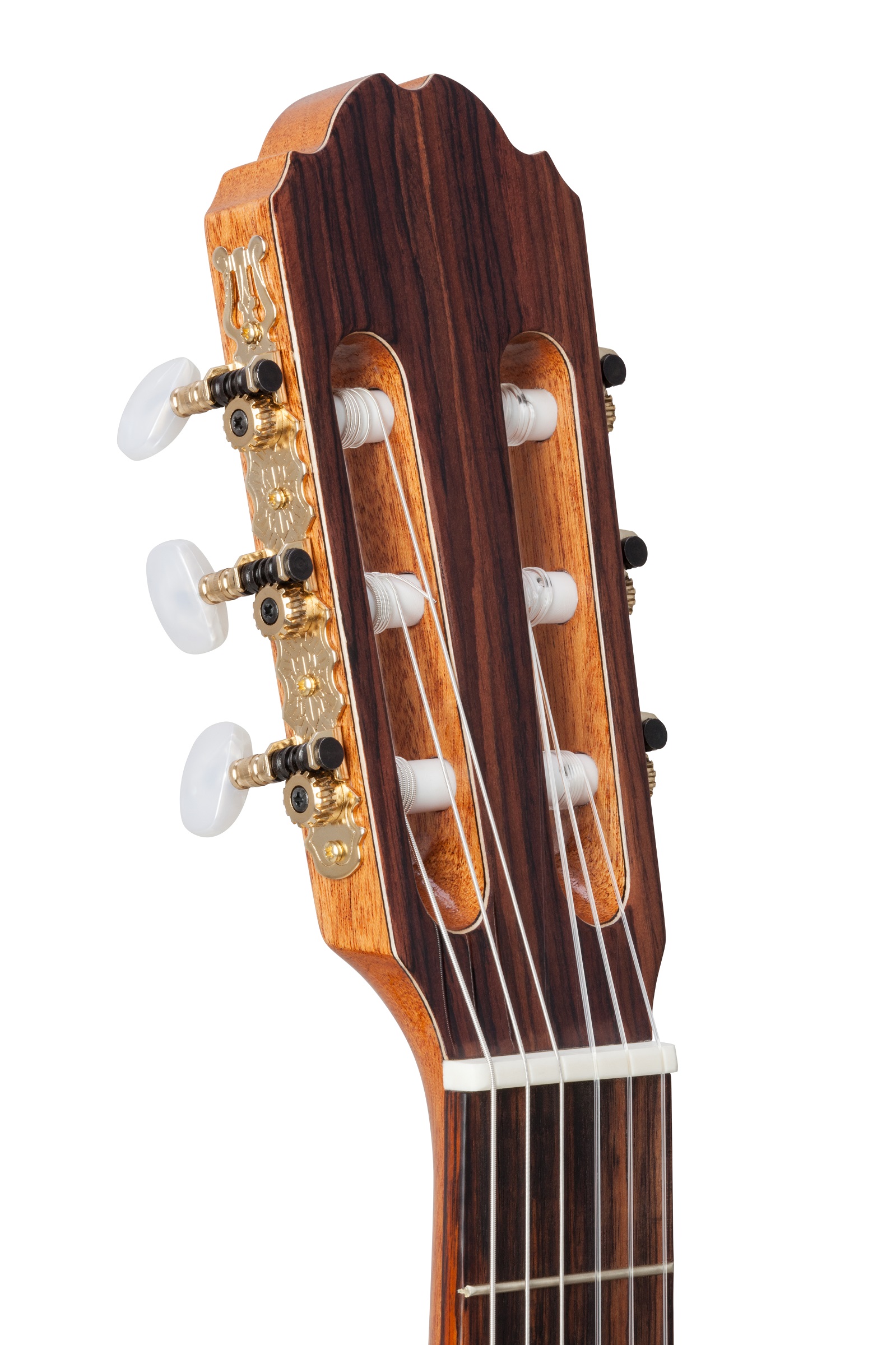 Der Hals aus Mahagoni mit einem Griffbrett aus indischem Palisander bietet ein angenehm vertrautes Spielgefühl. Mit einer Sattelbreite von 52 mm, einer Mensur von 650 mm und 19 Bünden lässt sich die Gitarre komfortabel greifen und sauber intonieren – ideal für klassische Spieltechniken ebenso wie für Fingerstyle.